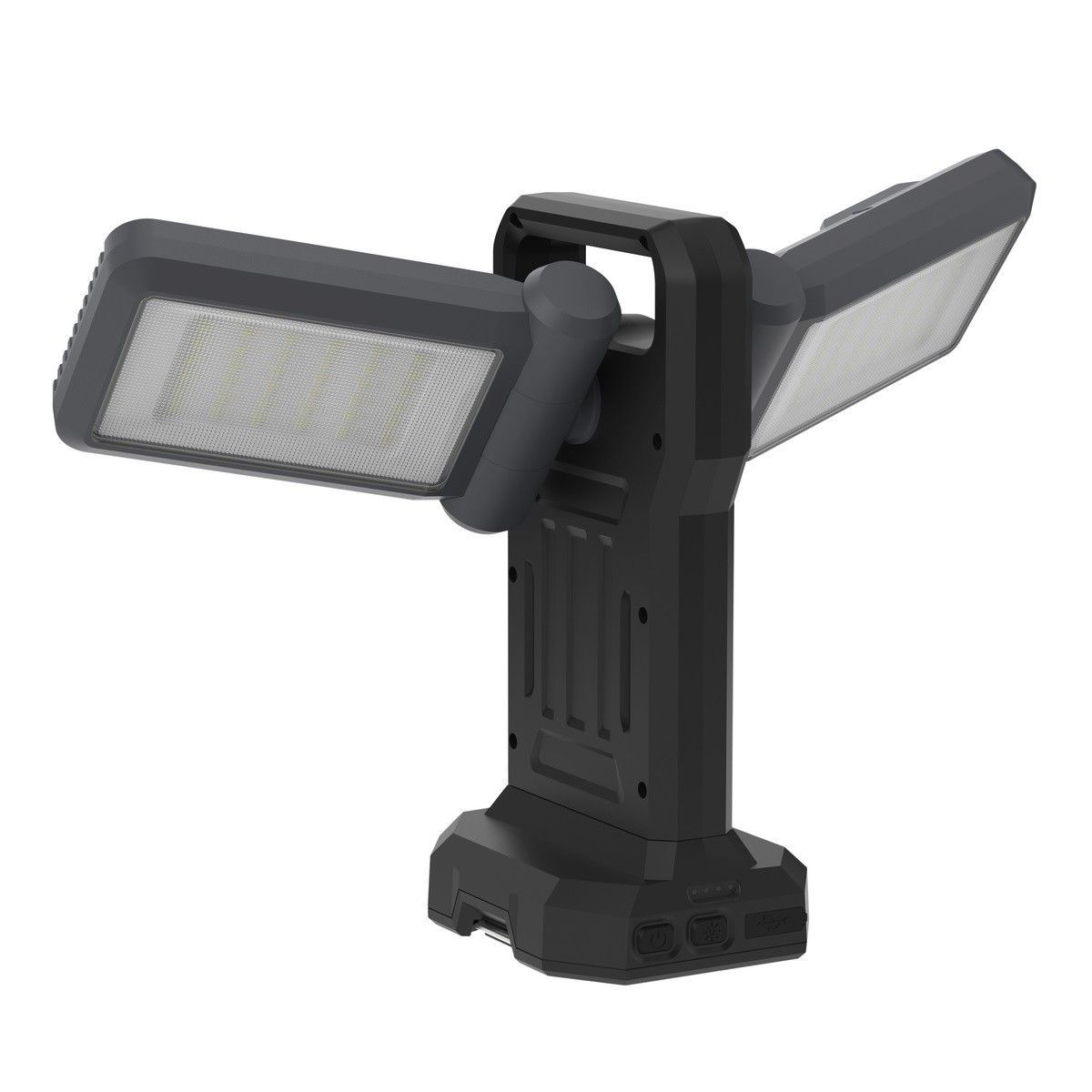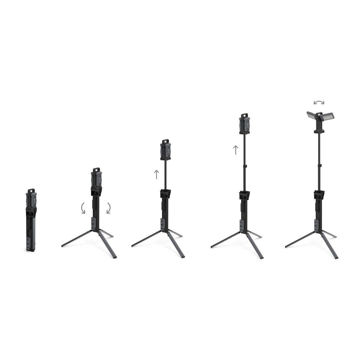 MEGA Akku-Hybrid Strahler mit Stativ Details für Akku-Hybrid Strahler mit Stativ: Lichtstark. Hybrid = mit Akku oder 230 Volt. Mit USB-Lademöglichkeit. Mit Stativ, unter Decke oder am Gerüst. Lichtpaddel drehbar. Lichtfarbe warm oder kalt. Dimmbar. - Stativ 1,98 m – 5 m Kabel – USB Ladem