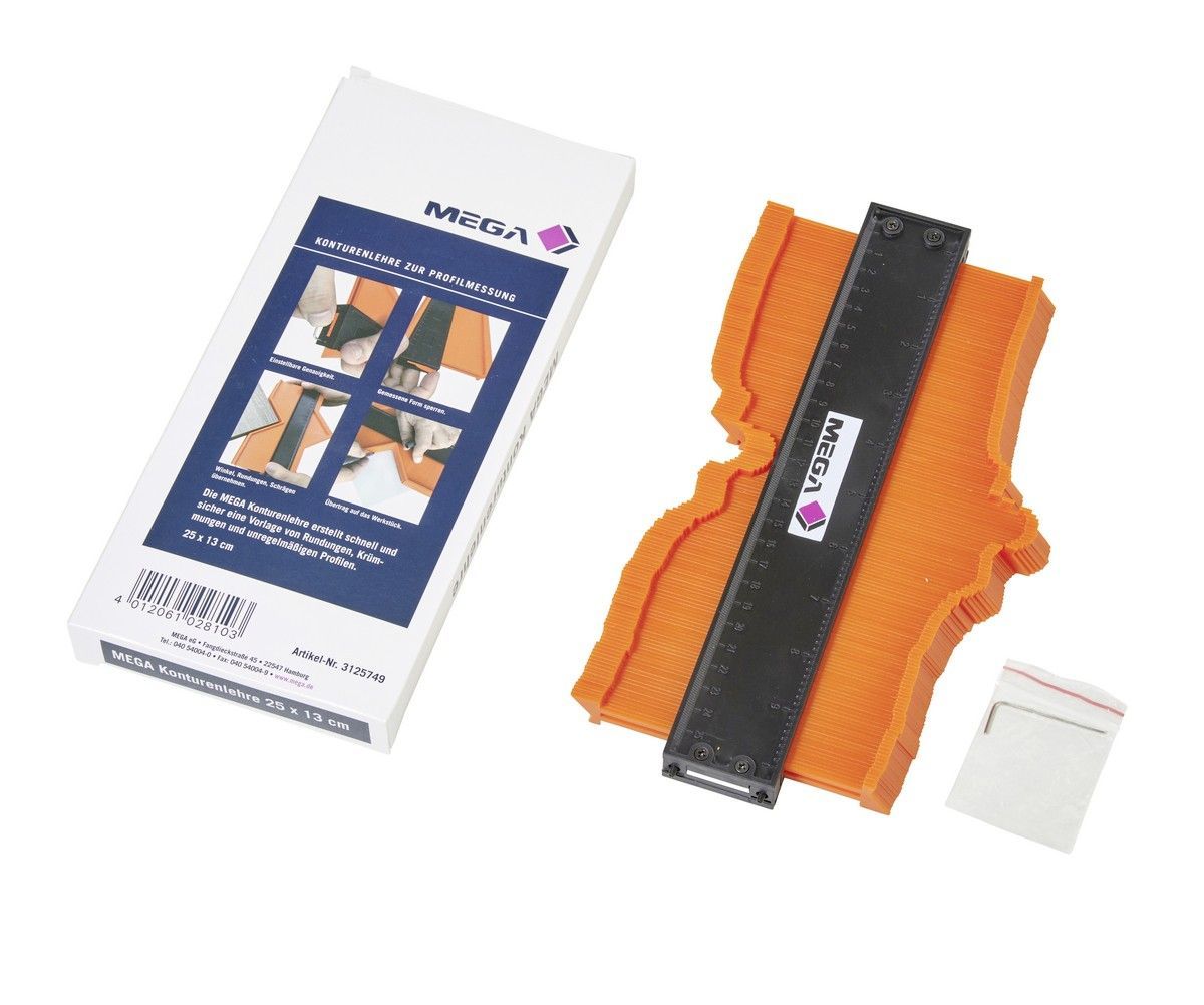MEGA Konturenlehre mit Schloss Details für Konturenlehre mit Schloss: Die MEGA Konturenlehre erstellt schnell und sicher eine Vorlage von Rundungen, Krümmungen und unregelmäßigen Profilen. Länge: 25 cm Breite: 13 cm Gebinde: 1 St.