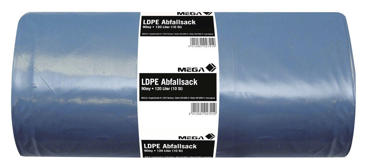 MEGA LDPE Abfallsack verstärkt 90my 10 Stück Details für LDPE Abfallsack verstärkt 90my 10 Stück: - Abmessungen: 700 x 1100 mm - 90my - Extra Stark - Praktisch perforiert auf der Rolle mit 10 Stück Farbton: Blau Inhalt: 10 Stück Gebinde: 1 Rolle