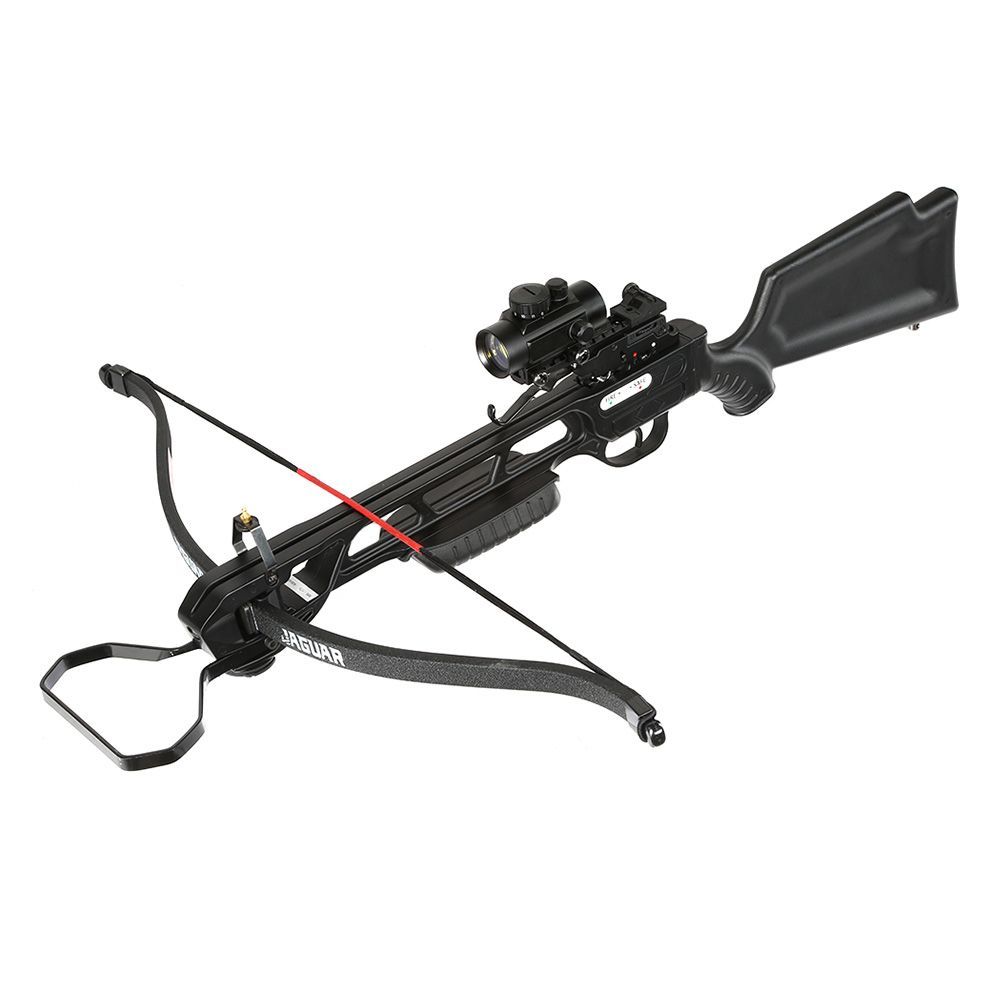 JAGUAR 1 Profi-Armbrust in schwarz von Ek Archery Research starke Version mit 175 lbs mit Red-Dot und automatischer Sicherung Technische Daten: Zugkraft: 175 lbs Gewicht: 2,6 kg Wurfarme: Hi-Tech Fiberglas Körper: Metall Schaft: Kunststoff Breite: 71 cm Länge: 88,9 cm Pfeilgeschwindigkeit: 220 fps =