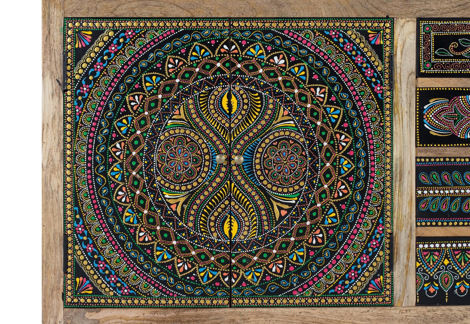 Sideboard aus Mangoholz mit 2 Téren und 4 Schubladen, verziert mit handbemalten Details fér einen kunsthandwerklichen Charme. Naturfarbene Struktur, mehrfarbige Fronten. Maße: 73 cm Höhe x 107 cm Breite x 33 cm Tiefe. Gewicht: 33 kg. Verpackung: 79 x 113 x 39 cm. Naturholz und Handarbeit, daher mögl