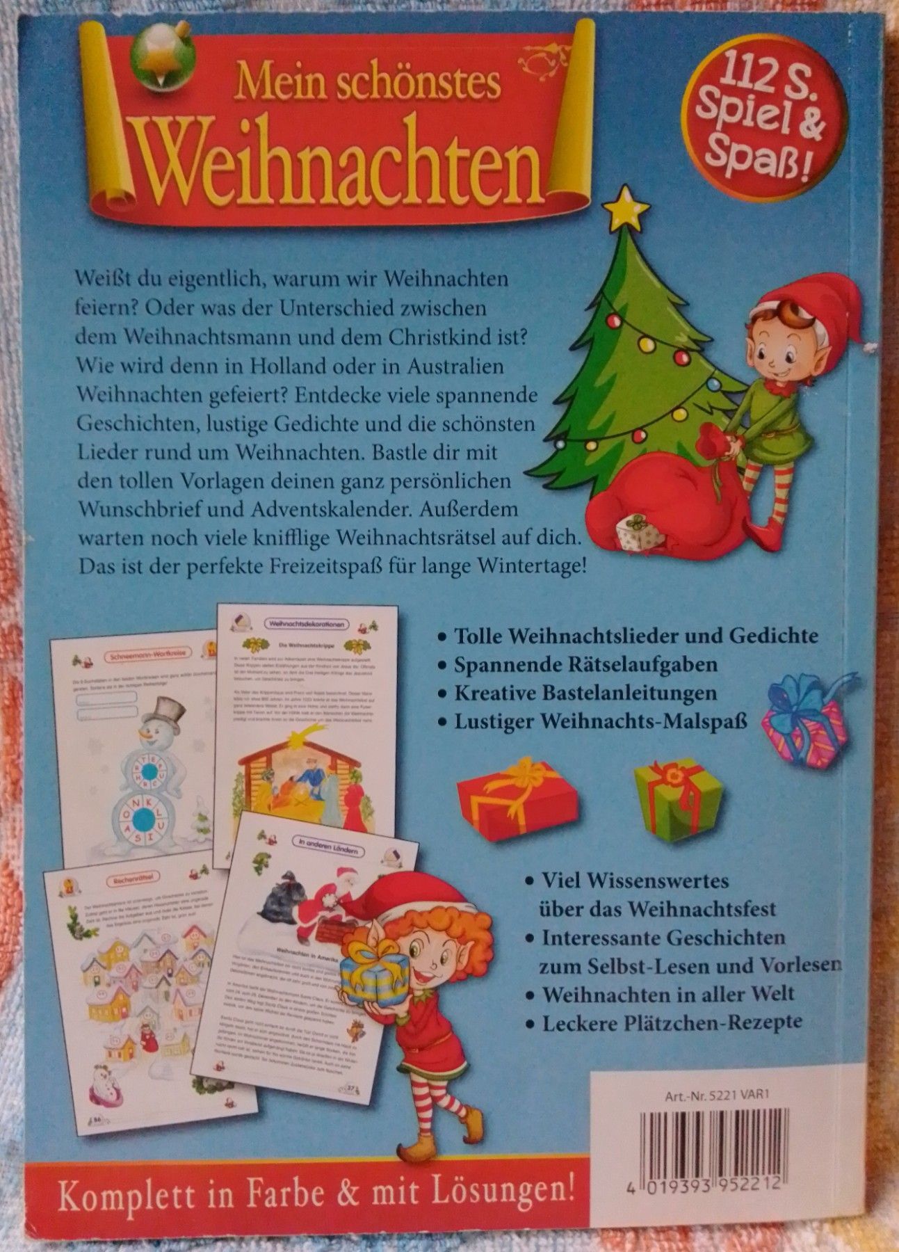 Leckere Plätzchen-Rezepte. tolle Illustrationen ;112Seiten. Lustiger Weihnachts-Malspaß. Oder was der Unterschied zwischen dem Weihnachtsmann und dem Christkind istEuro. Tolle Weihnachtslieder und Gedichte. Das Buch wurde auf 2-3-Seiten schon gemalt bzw. ausgefüllt.