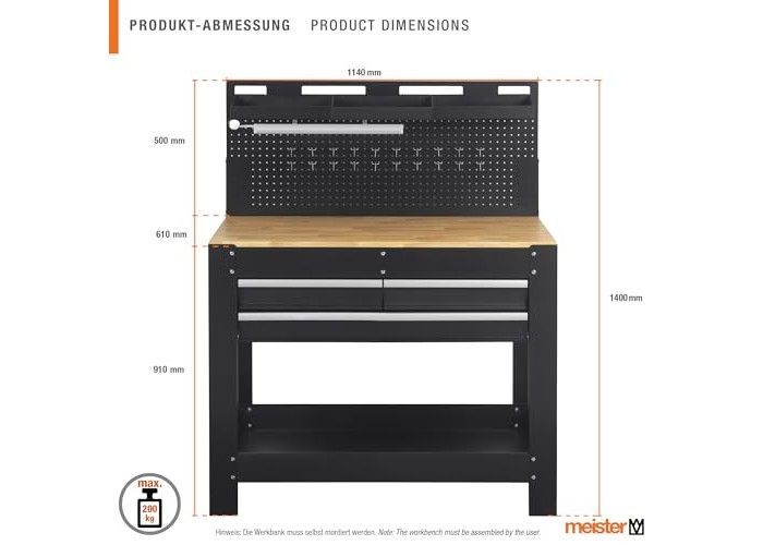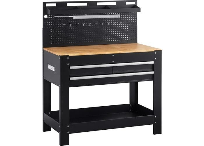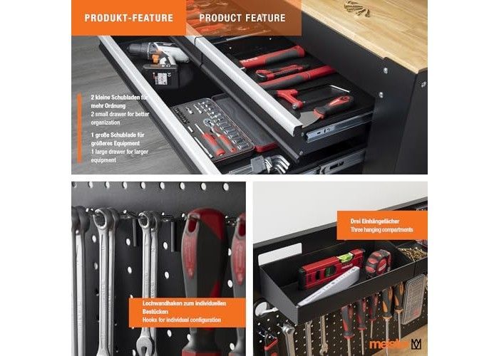 Viel Stauraum: Drei Schubladen und eine Lochwand mit Haken bieten Platz für Werkzeug und Material – alles ordentlich verstaut und stets griffbereit.. Große Arbeitsfläche: Die massive, FSC-zertifizierte Holzplatte schafft eine stabile und großzügige Arbeitsfläche – perfekt für präzises Ar... Mehr