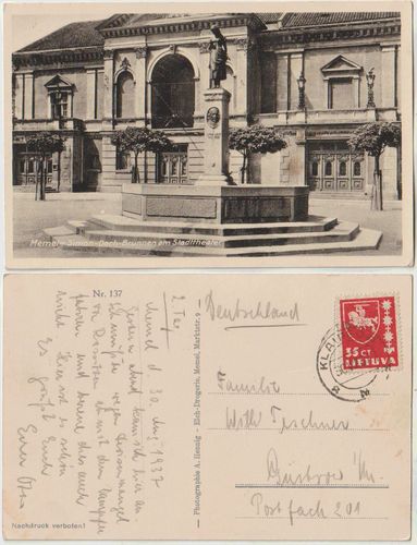 Memel 1937 Simon Dach Brunnen und Stadttheater mit Briefmarke gelaufen Gute Karte Privatauktion . Höhere Gebote werden akzeptiert und können die Auktion sofort beenden.