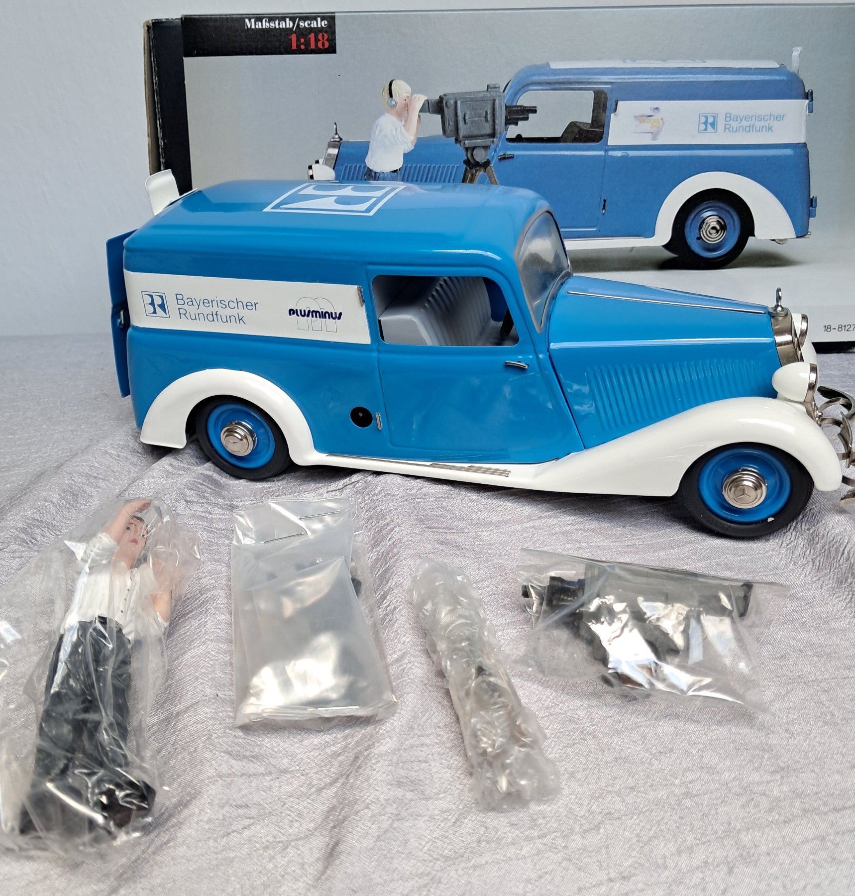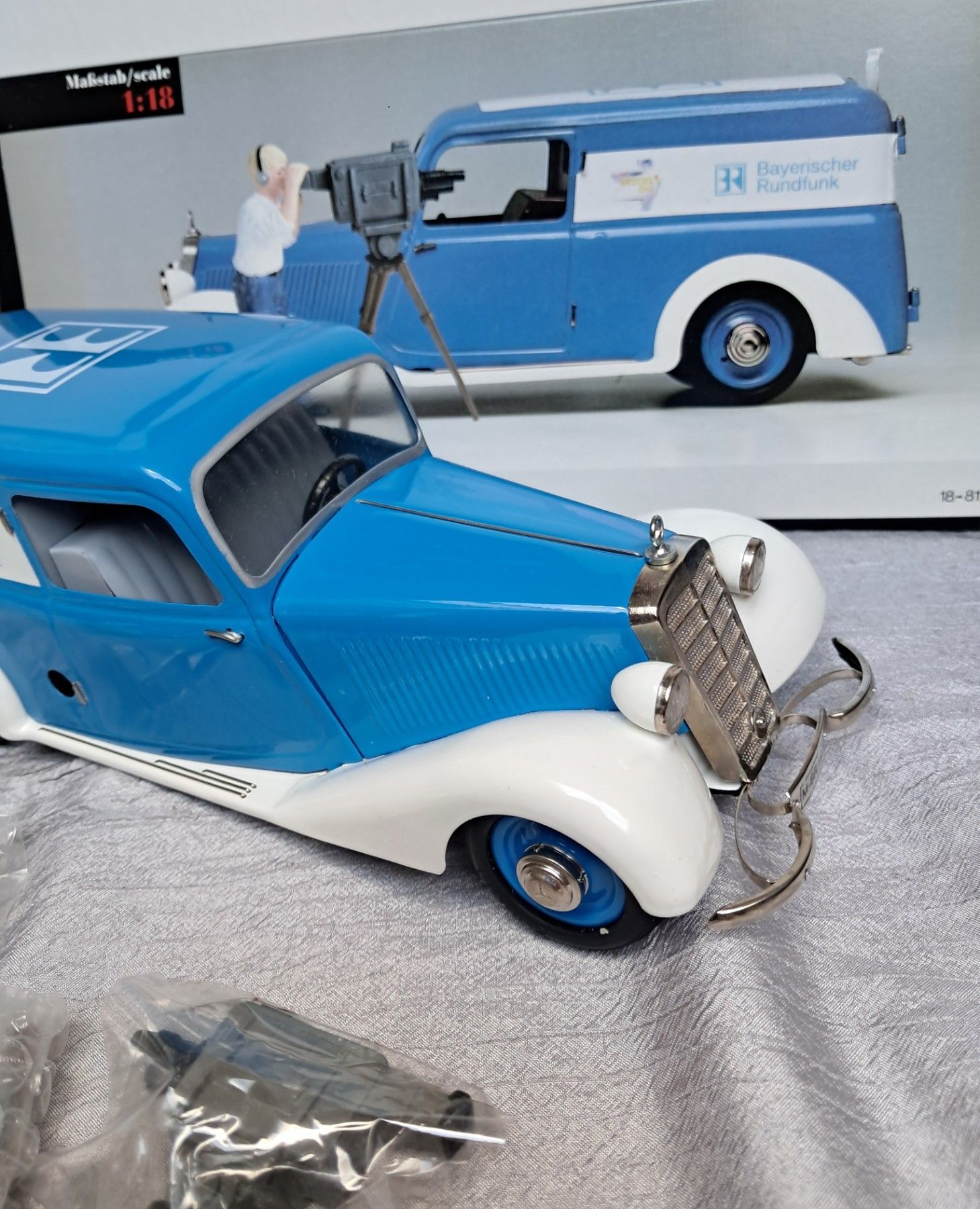 Schuco 033- Mercedes 170V Bayerischer Rundfunk Limitiertes Modell im Maßstab 1:18, Blechmodell mit Kameramann und Kamera .... Mehr