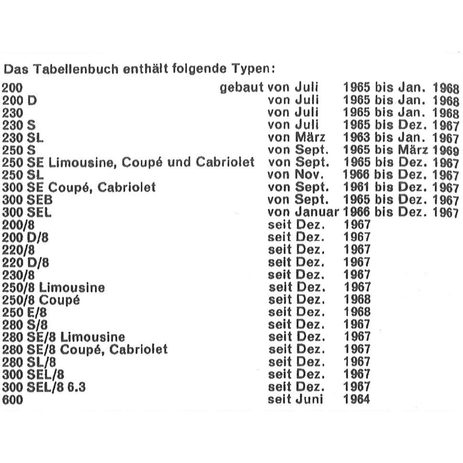 Mercedes-Benz Typ 200 230 250 280 300 etc. ab 1961 Ausgabe 1969 Tabellenbuch