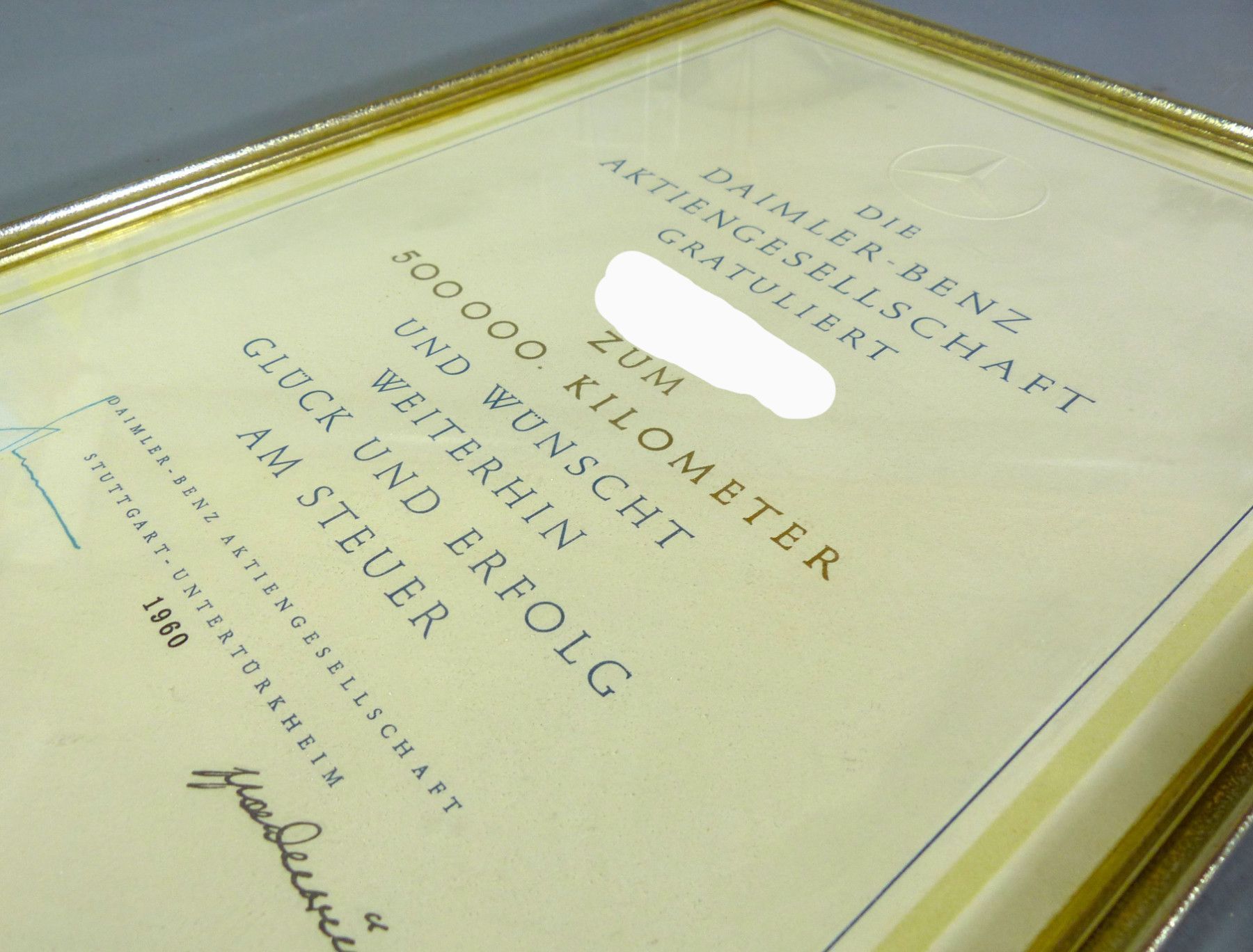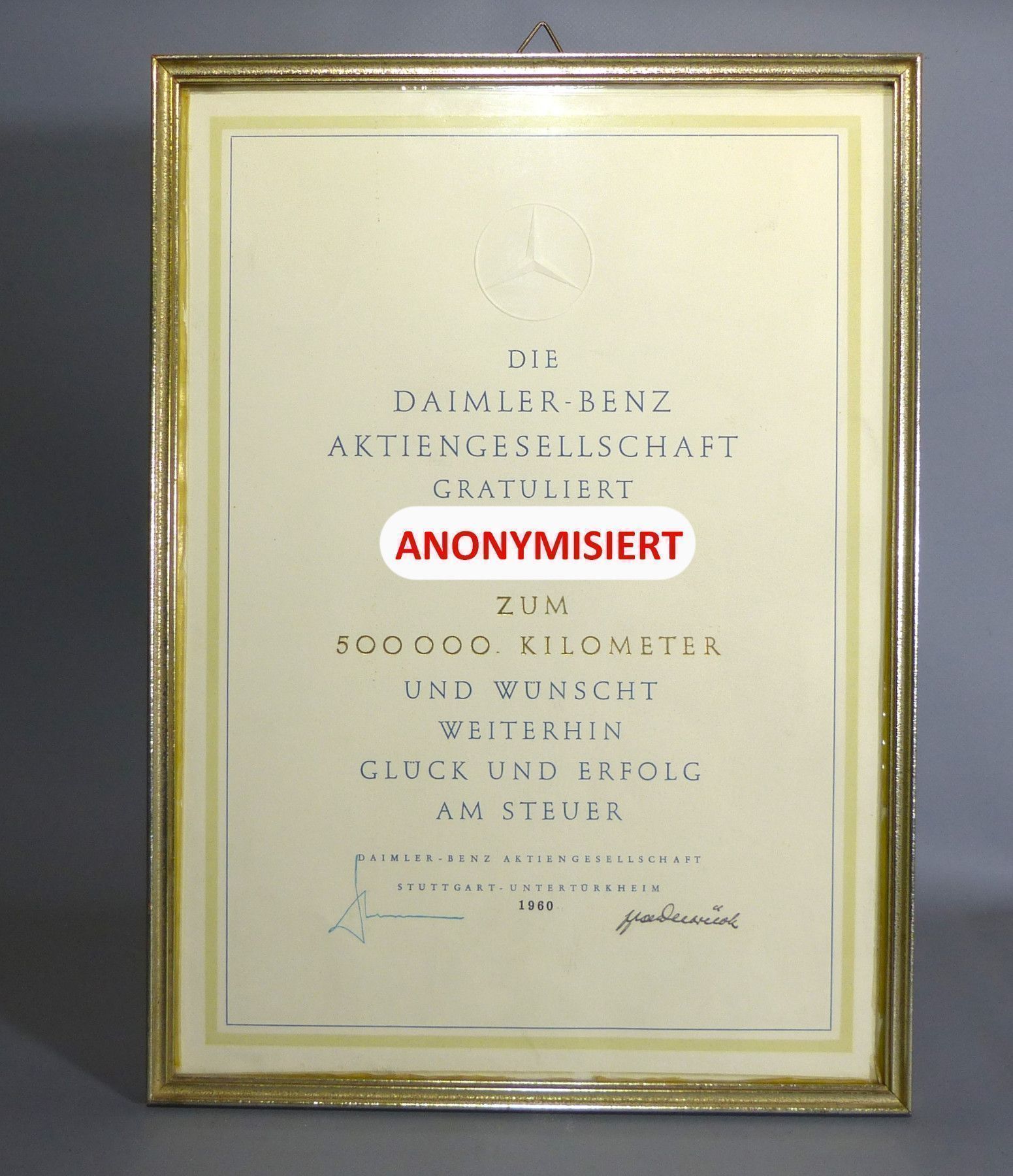 Mercedes Daimler-Benz gratuliert zum 500000. Kilometer 1960 Urkunde Leistung gerahmt