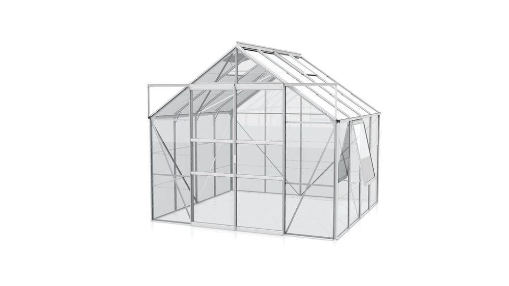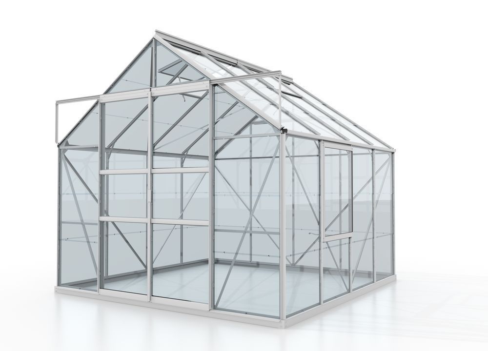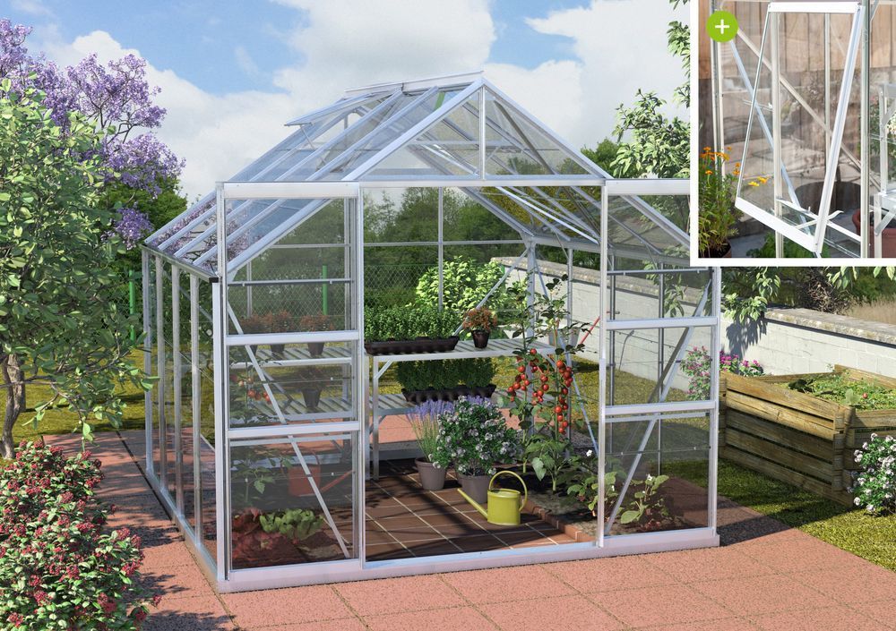 Meridian 2 6700 ESG 3 mm Gewächshaus Im Meridian 2 fühlen sich Pflanzen und fortgeschrittene Gewächshausgärtner schnell zu Hause. Wie das Meridian 1 bieten Höhe und Breite im Vergleich zu den Einsteigermodellen mehr Platz zum Wachsen und Gedeihen. Dabei profitiert gerade von den komfortablen Höhen (Seiten: 1,37 m, Tür: 1,75 m, First: 2,32 m) auch der Gärtner selbst, der aufrecht im Gewächshaus arbeiten kann. Auch das Meridian 2 ist in vier verschiedenen Größen mit Grundflächen von 6,7 bis 11,5 m² und in drei Farben erhältlich: Aluminium eloxiert, Smaragd oder Anthrazit pulverbeschichtet. Ob schön und klassisch verglast mit ca. 3 mm starkem Sicherheitsglas, kristallklar (ESG) oder zur besseren Isolierung mit 4 oder 6 mm starken Hohlkammerplatten: die breite Doppelschiebetür und das Seitenfenster machen das Meridian 2 zu einem nahezu wohnlichen Ort. Dabei sorgt das Seitenfenster in Kombination mit den zwei Dachfenstern auch für hervorragende Belüftung. Besonders einladend zeigt sich das Meridian 2 klassisch verglast mit Sicherheitsglas, kristallklar (ESG): Es gibt den Blick frei ins eigene Grün und verstärkt den wohnlichen Charakter des Hauses. Je nach gewünschten Isoliereigenschaften eignen sich jedoch Hohlkammerplatten (HKP) in ca. 4 oder 6 mm Stärke besser (Dachfenster immer ca. 4 mm). Sie bestehen aus UV-stabilisiertem Polycarbonat. Neben den höheren Isoliereigenschaften bieten HKP auch einen besseren Schutz gegen zu intensive Sonne – bei der Eindeckung mit Sicherheitsglas, kristallklar (ESG) sollte an Schattierhilfen gedacht werden. Die Scheiben, ob aus Polycarbonat oder Sicherheitsglas, werden im Gewächshausrahmen mit den bewährten Federklammern verankert. Während die HKP an einem Stück zwischen den Profilen befestigt werden, wird das Glas überlappend montiert (Klinkerverglasung). Jedes Modell ist serienmäßig mit einem Seitenfenster, zwei Dachfenstern und Regenrinnen ausgestattet. Höher und breiter als Einstiegsmodelle Grundfläche: ca. 6,7 m² Außenmaß: B 2,57 x T 2,58 x H 2,32 m Firsthöhe: 2,32 m Traufenhöhe: 1,37 m Sockelmaß: 2,54 x 2,54 m Türmaß: 1,22 x 1,75 m Farbe: Aluminium eloxiert Eloxierte Aluminiumprofile sorgen für dauerhaften Schutz vor Korrosion Verglasung mit Sicherheitsglas, kristallklar (ESG ca. 3 mm) Verglasungstechnik: Etablierte Federklammertechnik, einfaches Einsetzen und Austauschen der Glasscheiben - auch nachträglich Kugelgelagerte Doppelschiebetür Tür vorbereitet für Vorhängeschloss Inkl. 2 Dachfenstern, 1 Seitenfenster und Regenrinnen Alle Maßangaben sind Annäherungswerte. Technische Änderungen vorbehalten