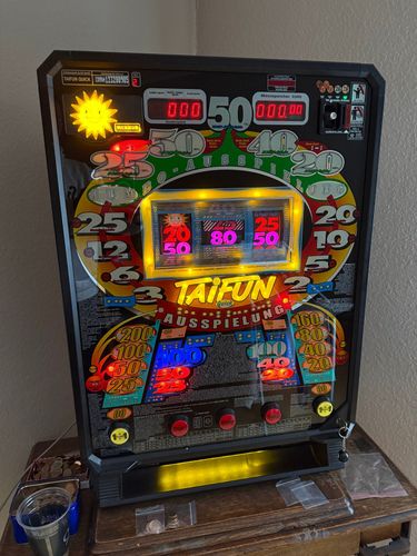 Biete hier einen Merkur Taifun Spielautomat an. Das Gerät läuft mit Euromünzen 0,10 - 0,20 - 0,50 - 1,00 - 2,00 € Das Gerät ist auf Hobby-Modus programmiert und somit ist kein Rückstellen alle 3 Monate erforderlich. Es ist 1 Schlüssel dabei. Nur für den Privatgebrauch zu benutzen, nicht für die gewe