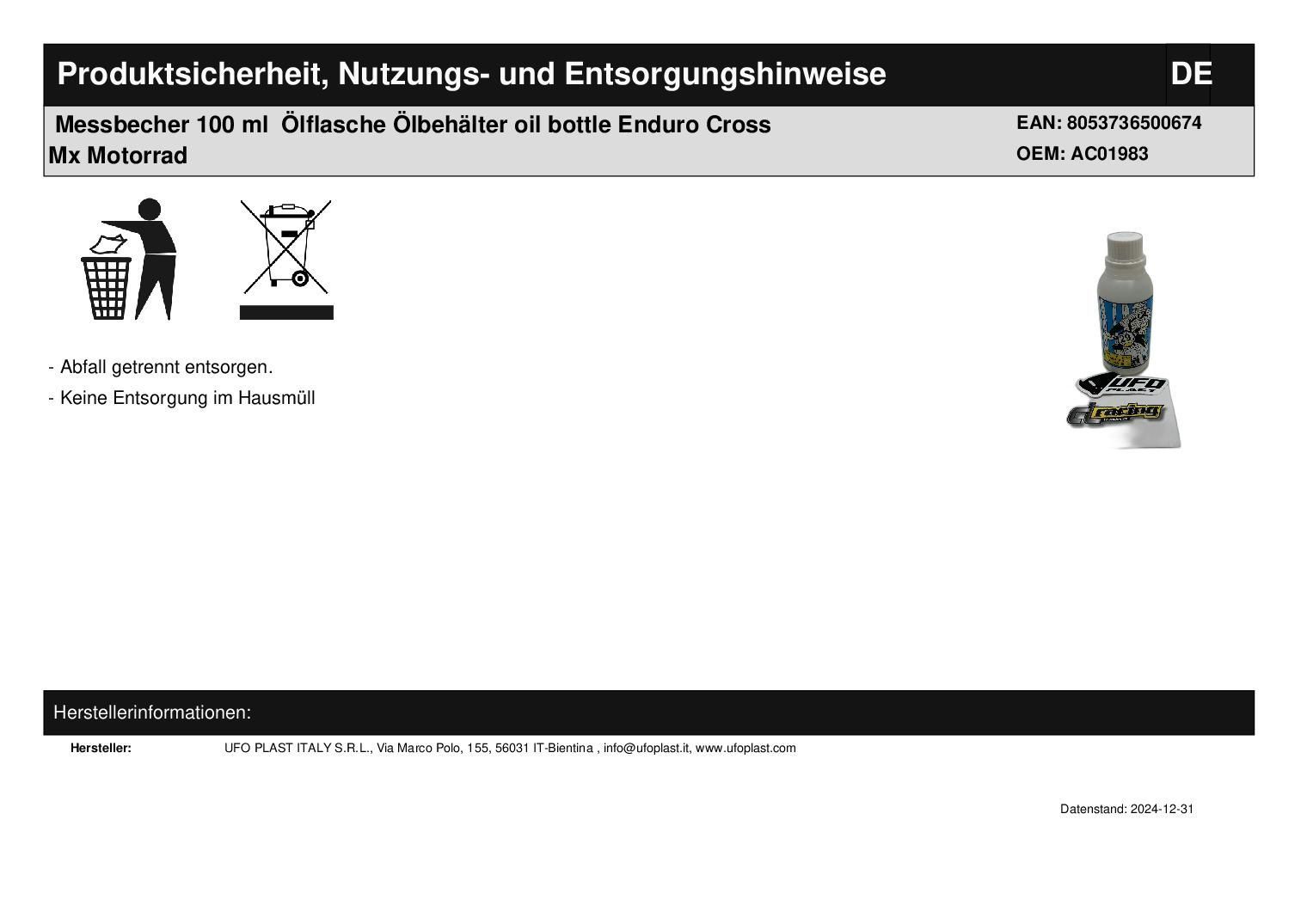 Messbecher 100 ml Ölflasche Ölbehälter oil bottle Enduro Cross Mx Motorrad