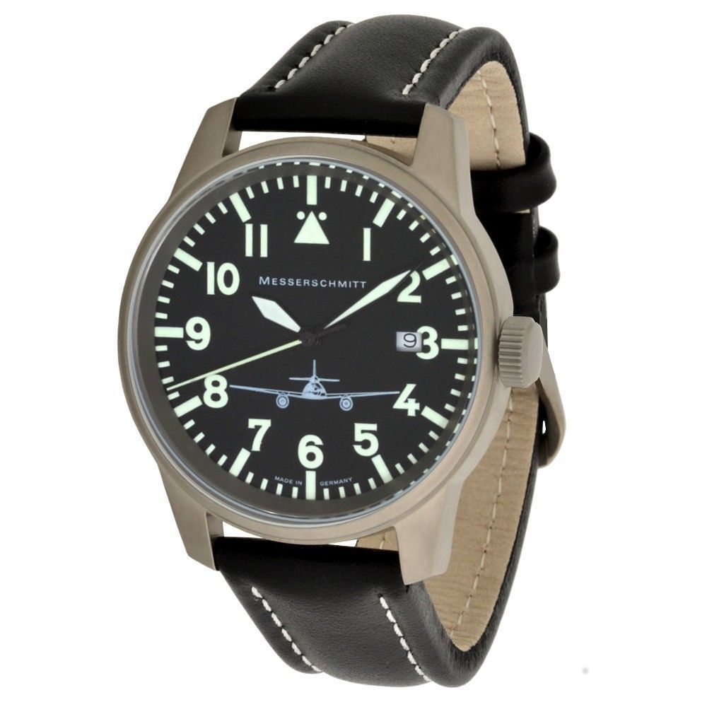 Messerschmitt Fliegeruhr ME262M-Ti schwarzes Lederarmband 5 ATM Ronda Quarzwerk Titan