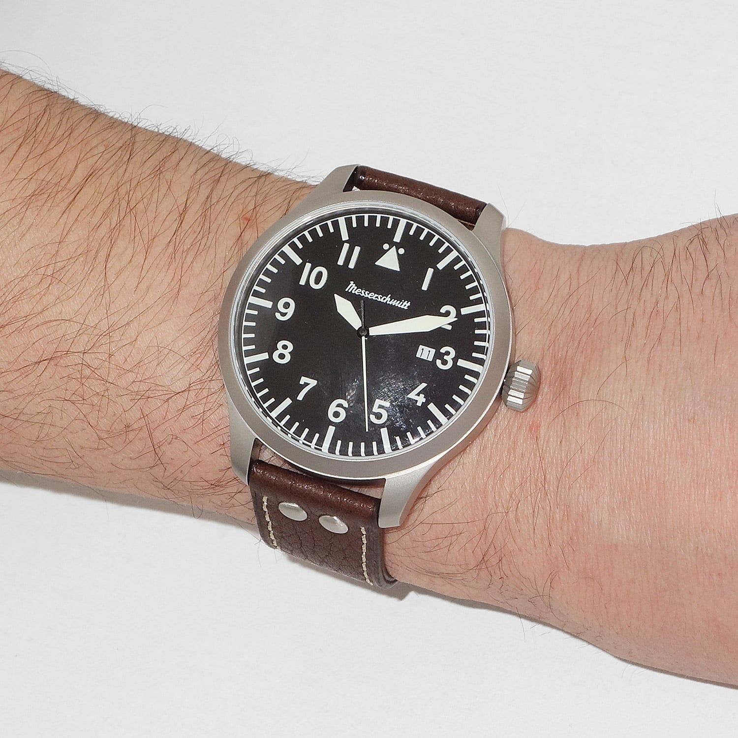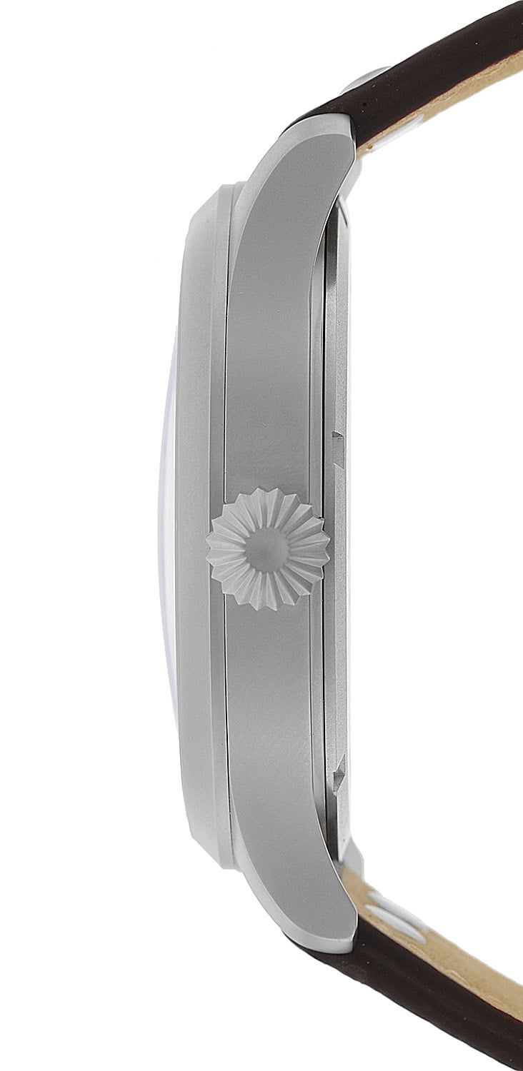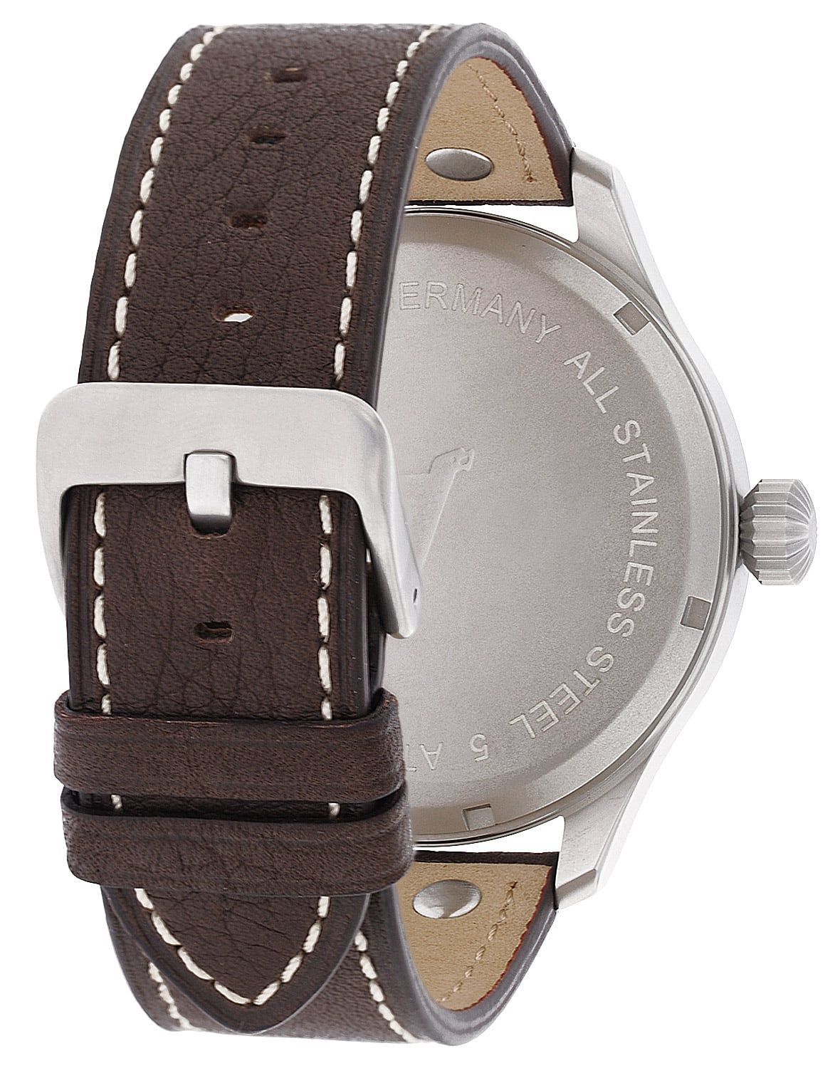 Made in Germany, auffällige Armbanduhr für Männer, mit Quarzwerk Ronda 515, Datumsanzeige, schwarzes Zifferblatt, lumineszierende Zeiger, Zahlen und Indizes, zentraler Sekundenzeiger, Gehäuse aus mattiertem Edelstahl, verschraubter Gehäuseboden, geriffelte Krone, kratzunempfindliches Mineralglas, Armband aus dunkelbraunem Leder mit matten Ziernieten, matte Dornschließe, wasserdicht bis 5 bar, Breite (ohne Krone) 47 mm, Höhe 12 mm