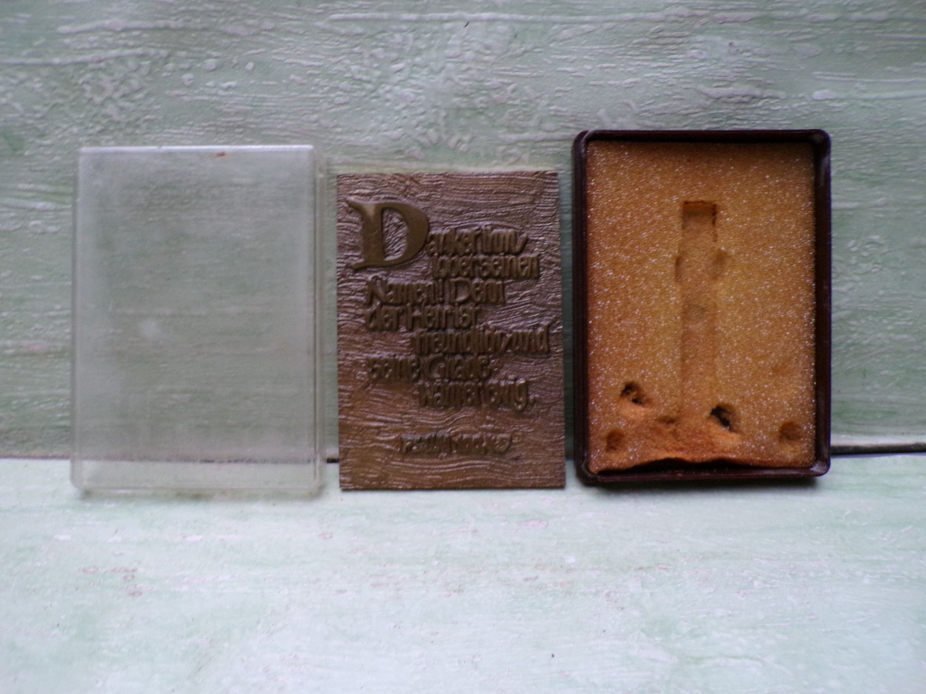 ... Erinnerungen ..... . alte Psalm- Metall Messing Bronze -Bilder . Das Material kann ich nicht bestimmen Jahreslosung 1988 je ca 170 gr je 9 x 6,5 cm mit OVP Der Schaumstoff ist etwas altersschwach sonst gut+ . Zustand : einwandfrei, sehr gut . . Fotos sind Bestandteil der Beschreibung Bitte berüc