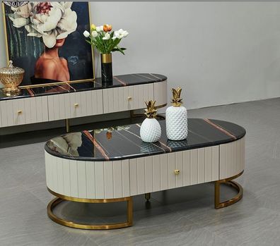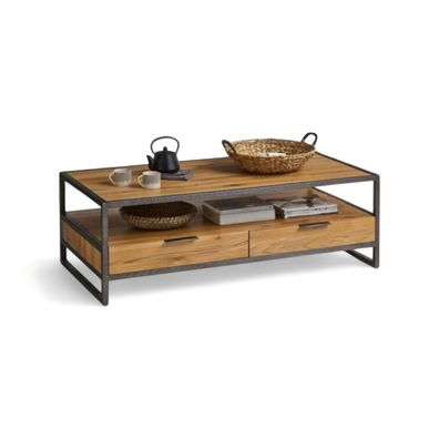 Couchtisch aus Holz und Metall mit praktischen Schubladen und offenem Regal