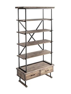 Rustikales Regal aus Holz und Metall mit offenen Fächern und Schublade