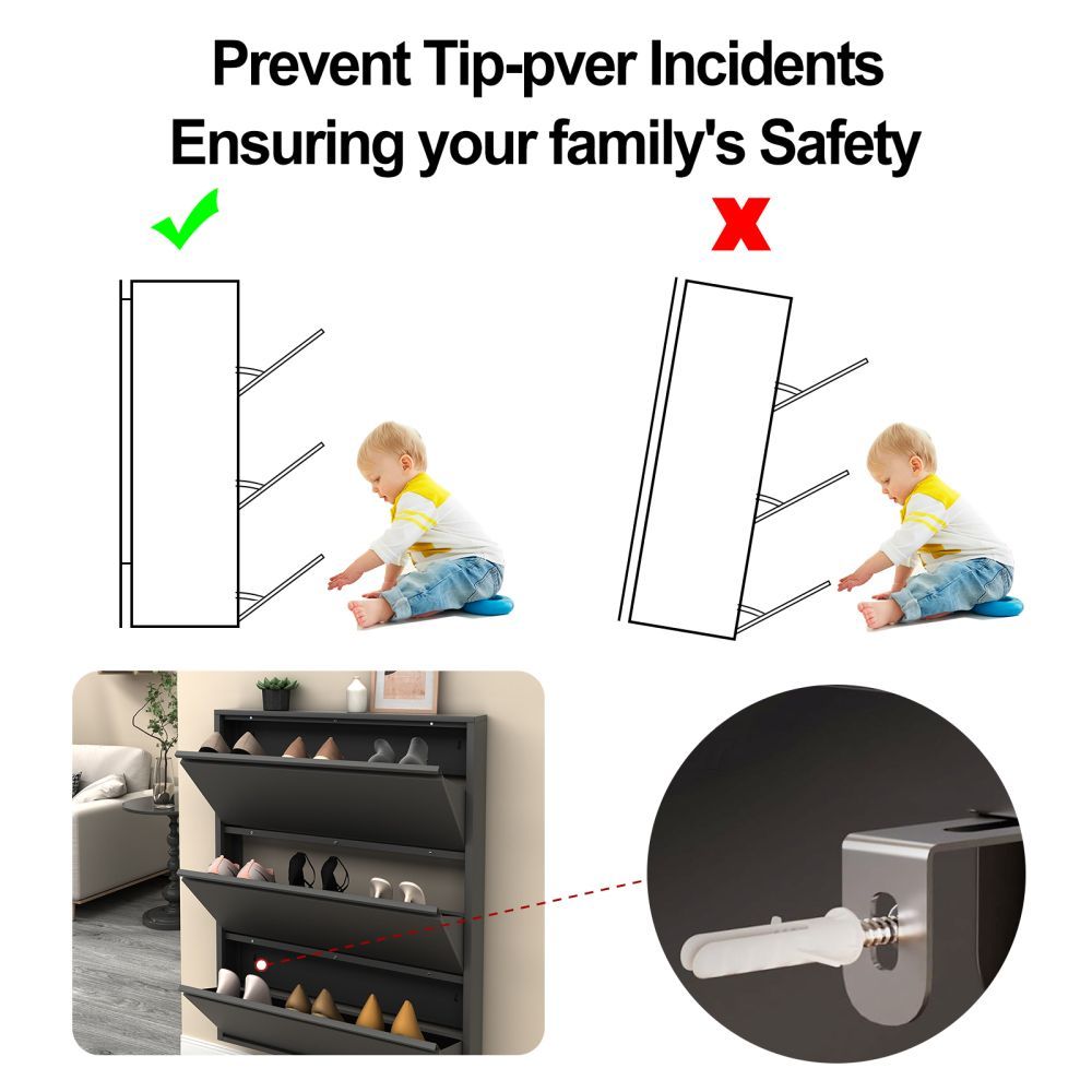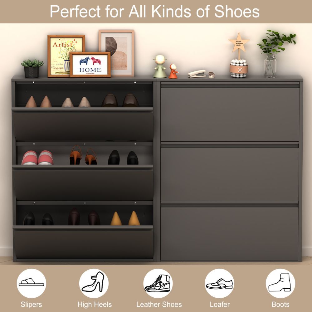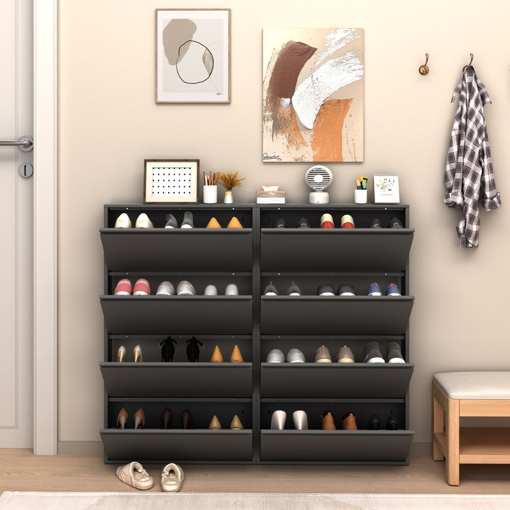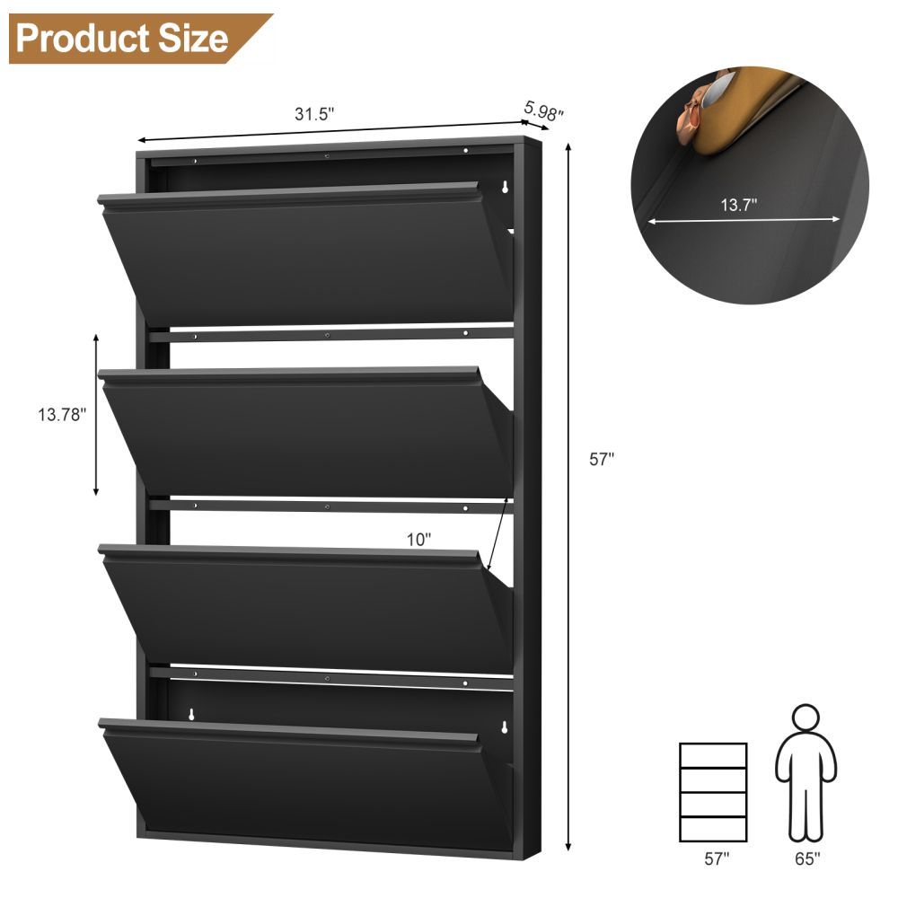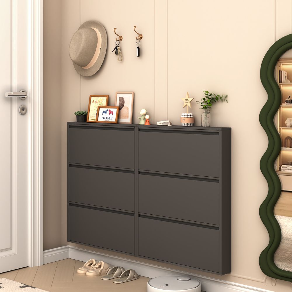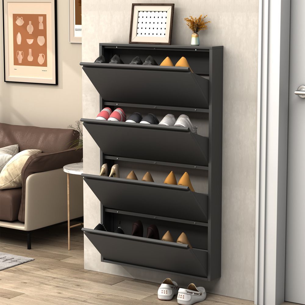 Moderner Schuhschrank aus Metall in Schwarz mit 3 Klappschubladen. Die schmale, wandmontierte Bauweise spart Platz und eignet sich ideal für den Eingangsbereich oder Wohnraum.