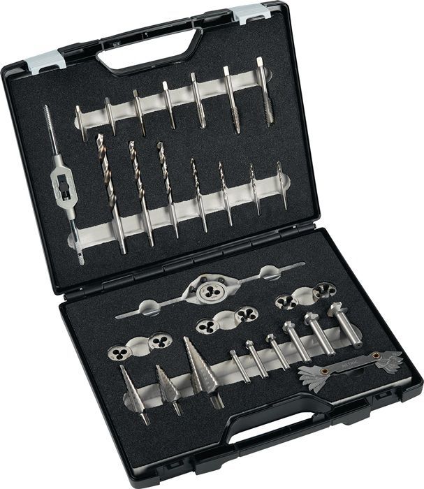 HSS M3 - M12 Starter-Kit zum Bohren, Senken und Entgraten sowie zum Schneiden von Innen- und Außengewinden bestehend aus: je 1 Stück Einschnittgewindebohrer M3, M4, M5, M6, M8, M10, M12 je 1 Stück Schneideisen M3, M4, M5, M6, M8, M10, M12 1 Stück Schneideisenhalter 25 x 9 1 Stück verstellbares Winde... Mehr