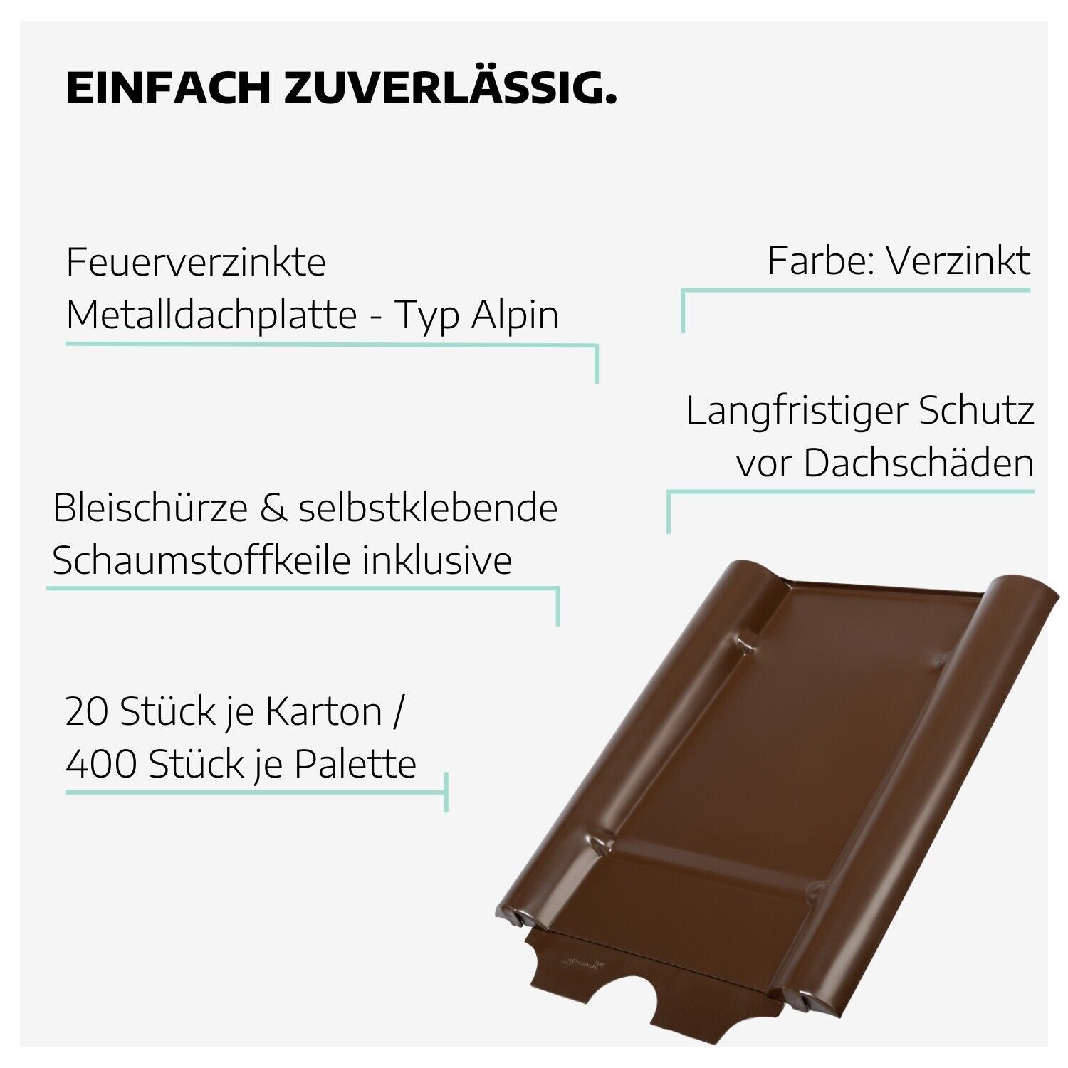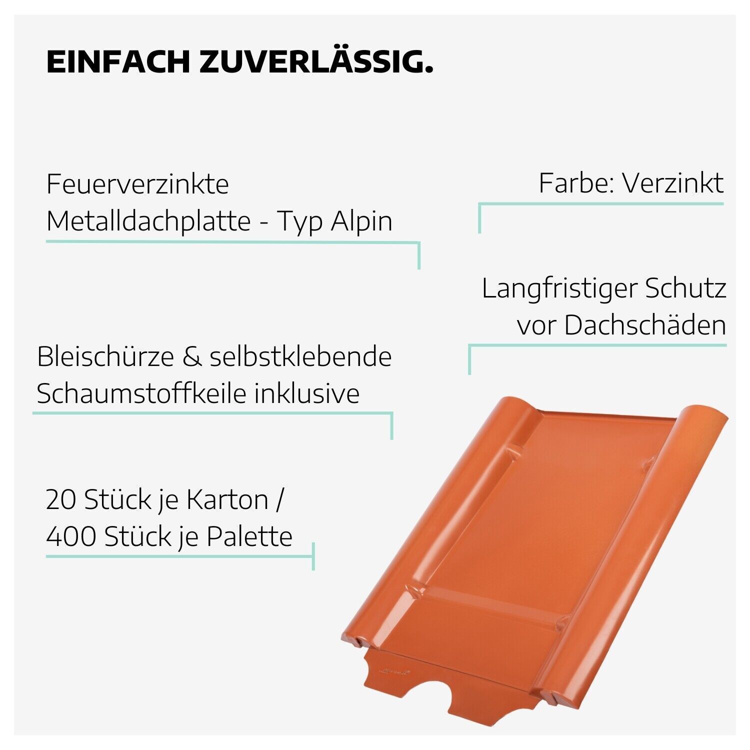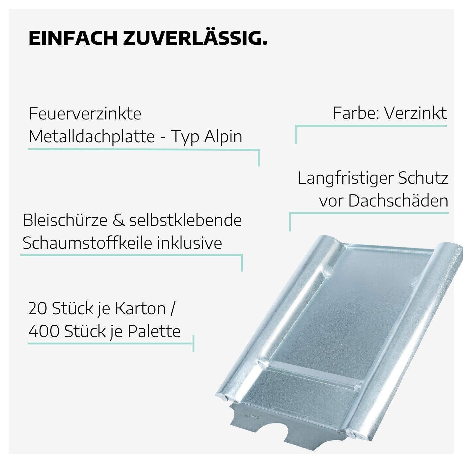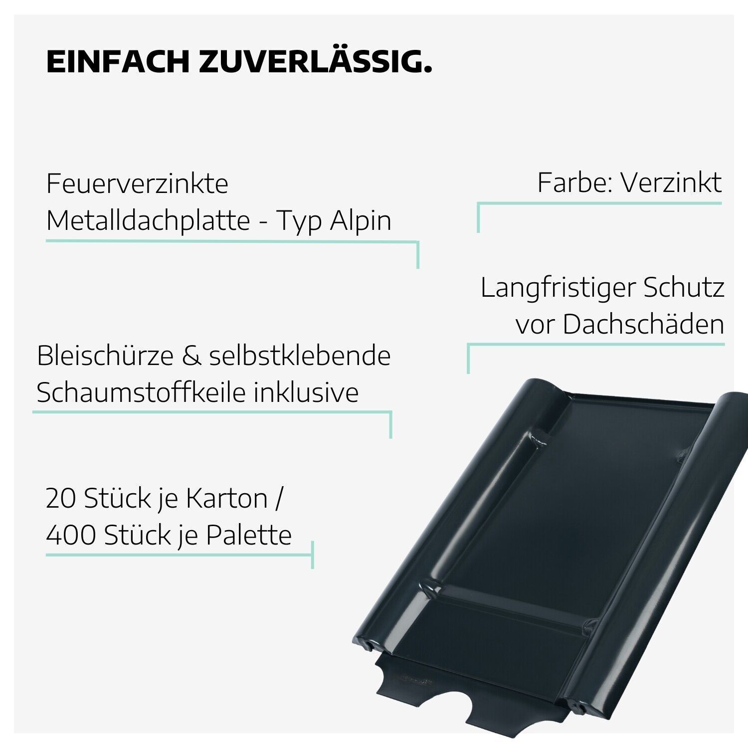Die feuerverzinkte Metalldachplatte inkl. Bleischürze typ Alpin ersetzt den klassischen Ziegel. Sie verhindert bei der Montage von Solarpanelen Ziegelbruch und gewährleistet die notwendige Dachlast. Der Unterlegziegel wird in höchster Qualität produziert und erfordert bei der Montage kein flexen ode