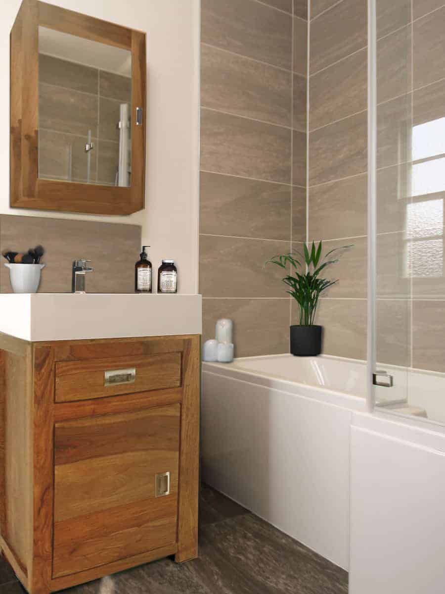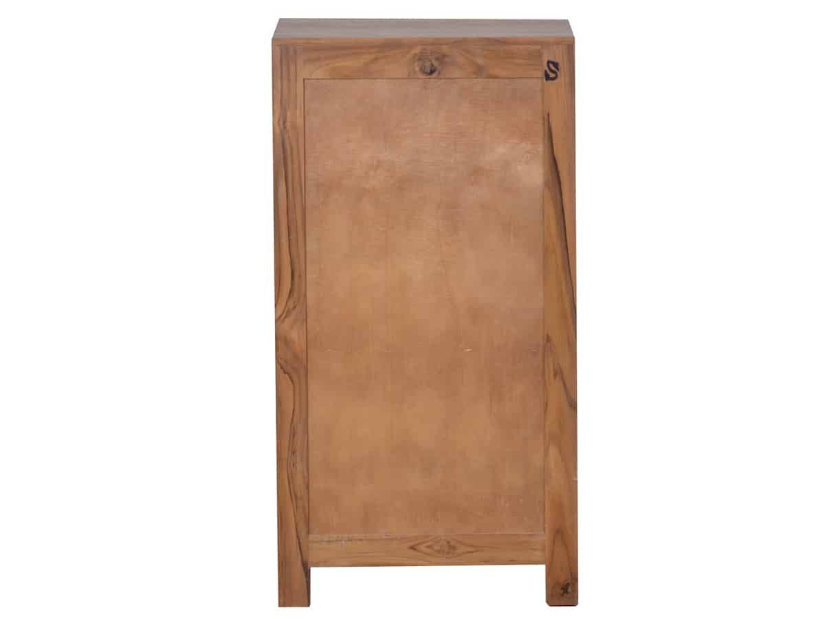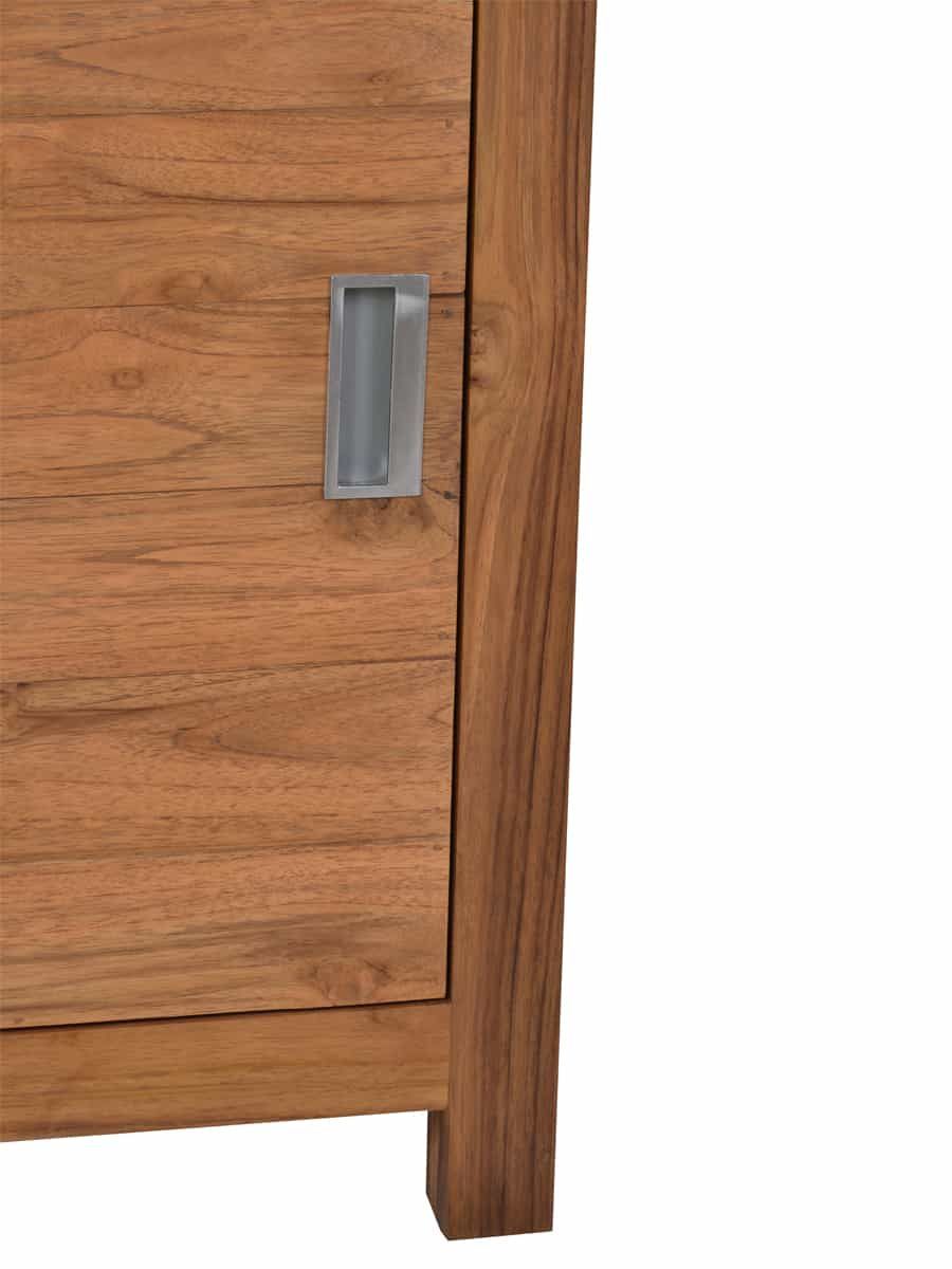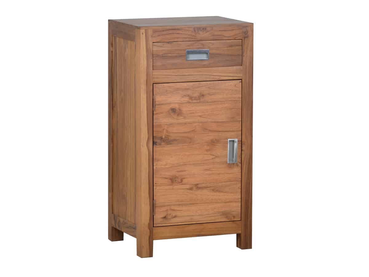 Badezimmerunterschrank aus massivem Teakholz Der moderne Badezimmerunterschrank wurde überwiegend in Handarbeit aus massivem Teakholz gefertigt und anschließend mit einer Lackierung versehen. Auf diese Weise bleibt die natürliche Maserung des Holzes erhalten und der Schrank ist effektiv vor Feuchtigkeit geschützt. Der Schrank verfügt über eine Schublade und eine Tür, die beide mit schlichten Griffmulden aus Metall versehen sind. Hinter der Tür befindet sich ein geräumiger Einlegebo