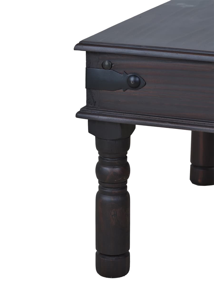Couchtisch im Kolonialstil aus massivem Pinienholz Der Couchtisch 'Colombo' aus Massivholz ist im walnussfarbenen Kolonialstil lackiert. Die natürliche Maserung des Akazienholzes schimmert je nach Lichteinfluss silhouettenhaft durch die Lackierung, wodurch ein ansprechend schönes Gesamtbild entsteht. Die unterschiedliche Maserung jedes einzelnen Möbelstückes führt zu einer hohen Individualität. Gedrechselte Tischbeine sowie die von Hand geschmiedeten Beschläge sorgen für ein authentisches