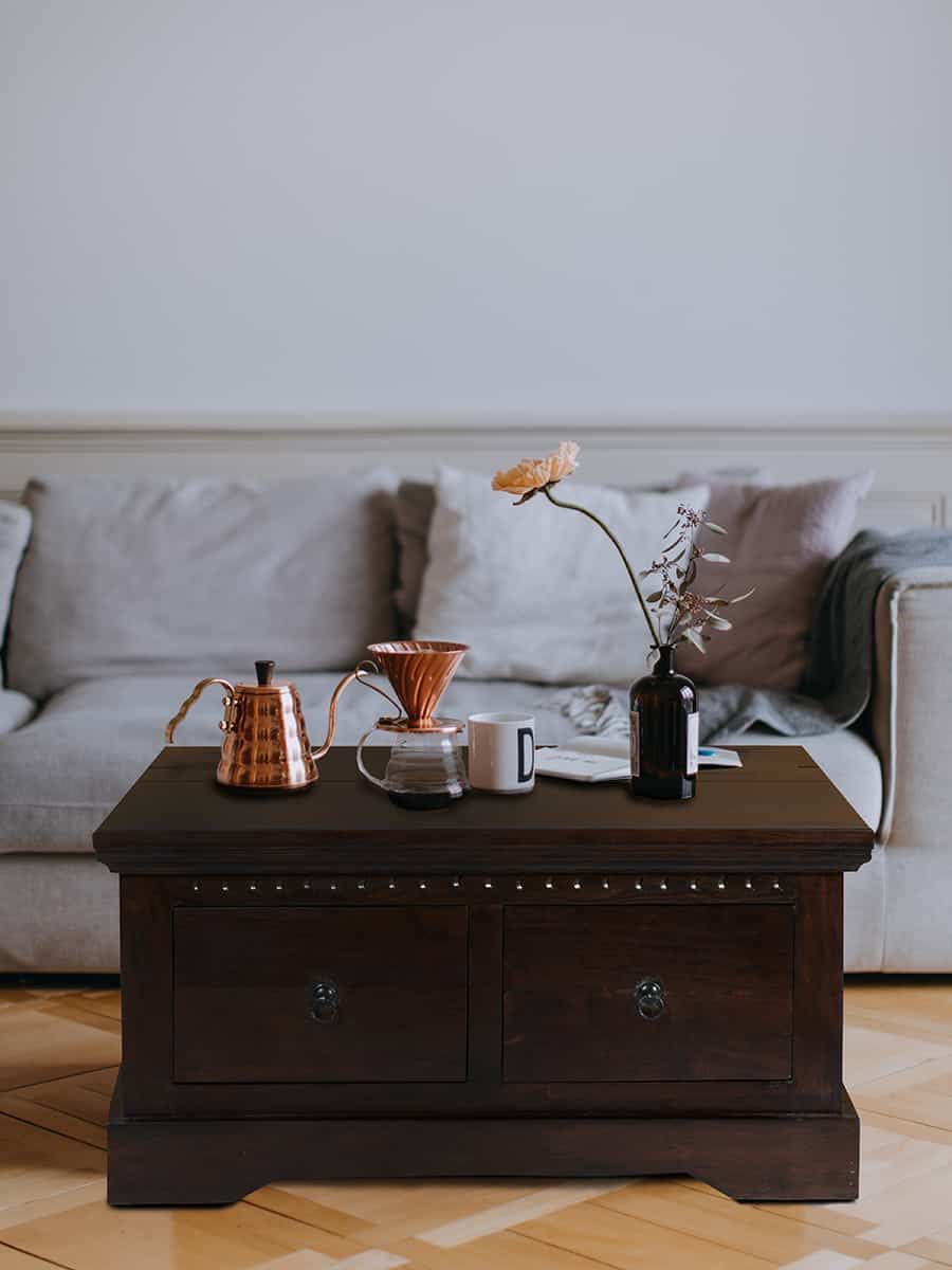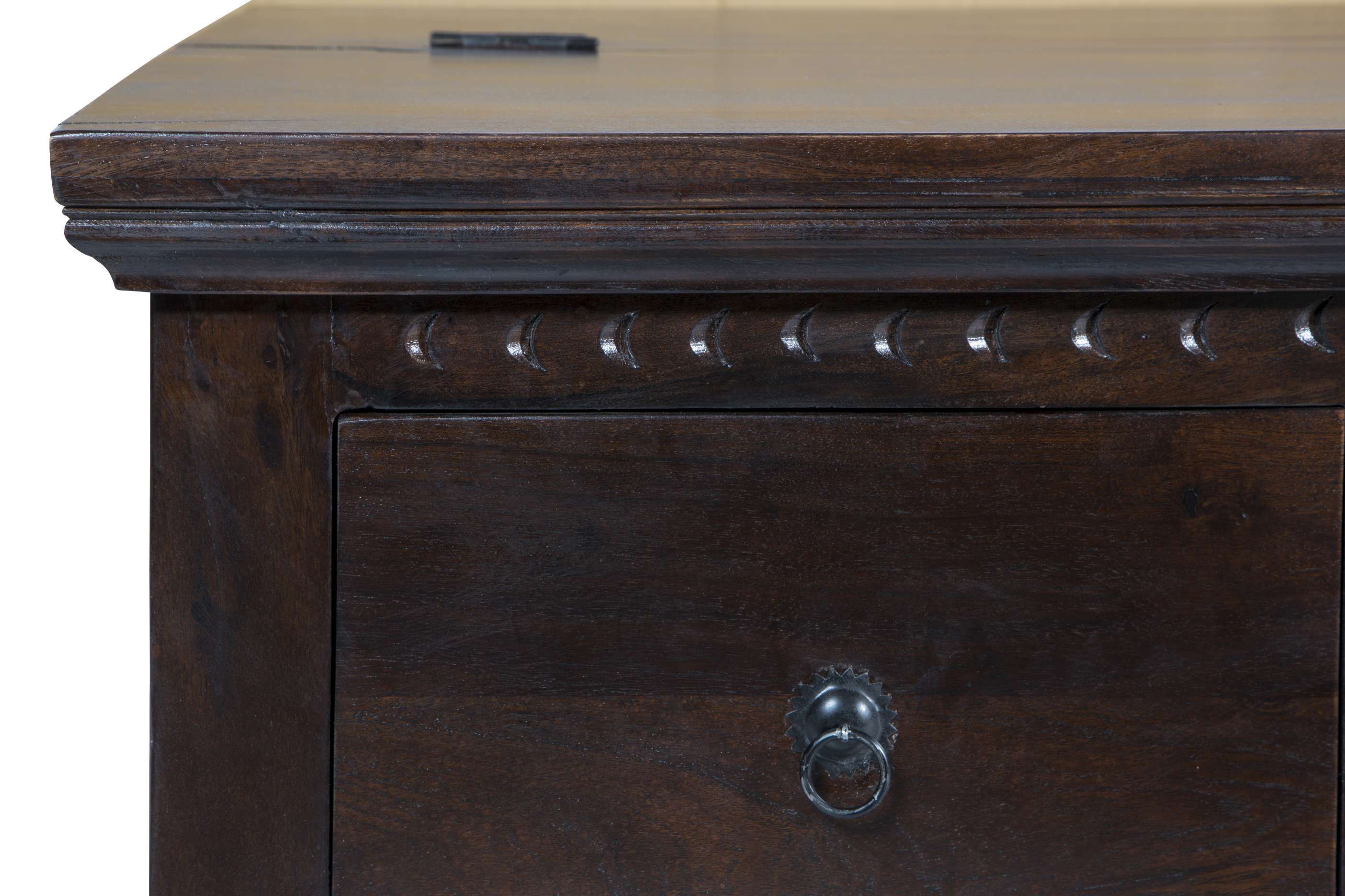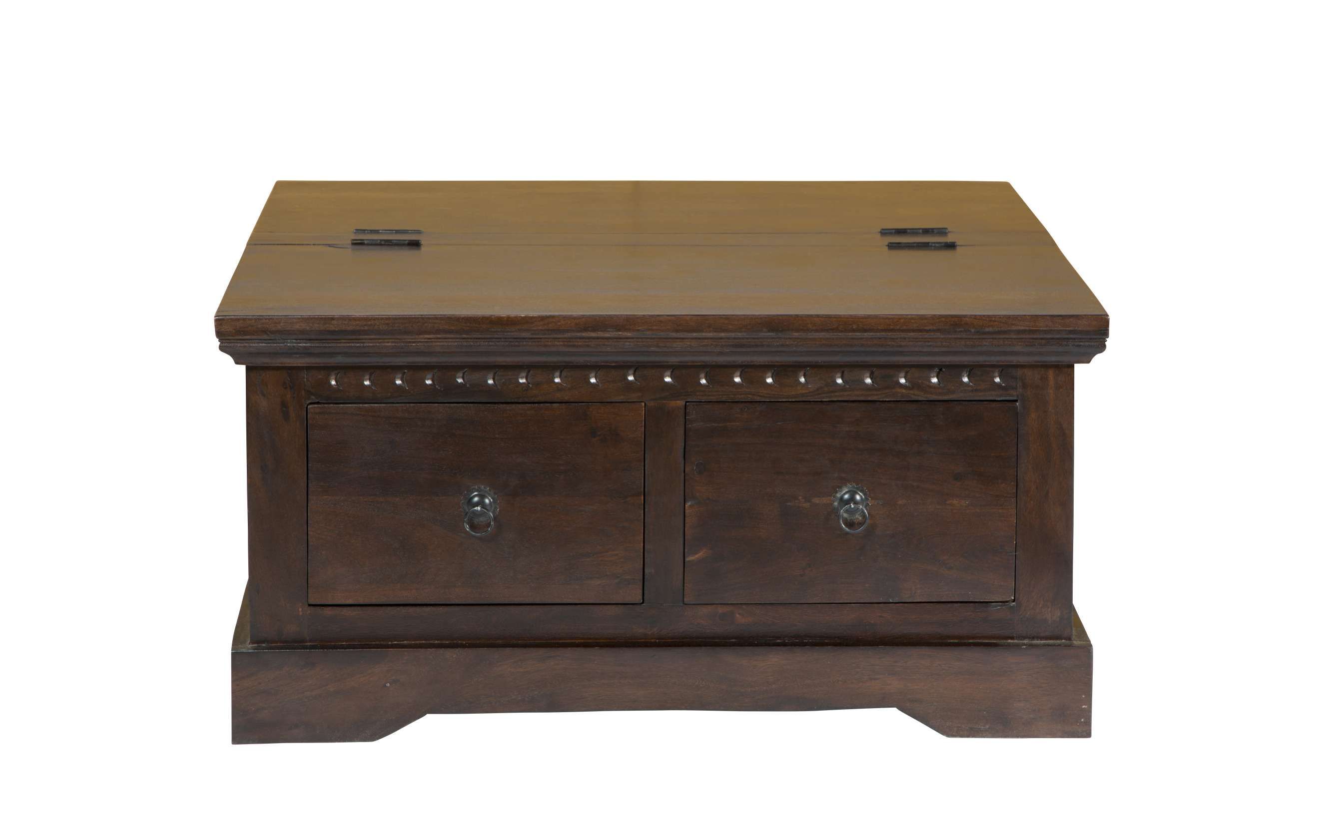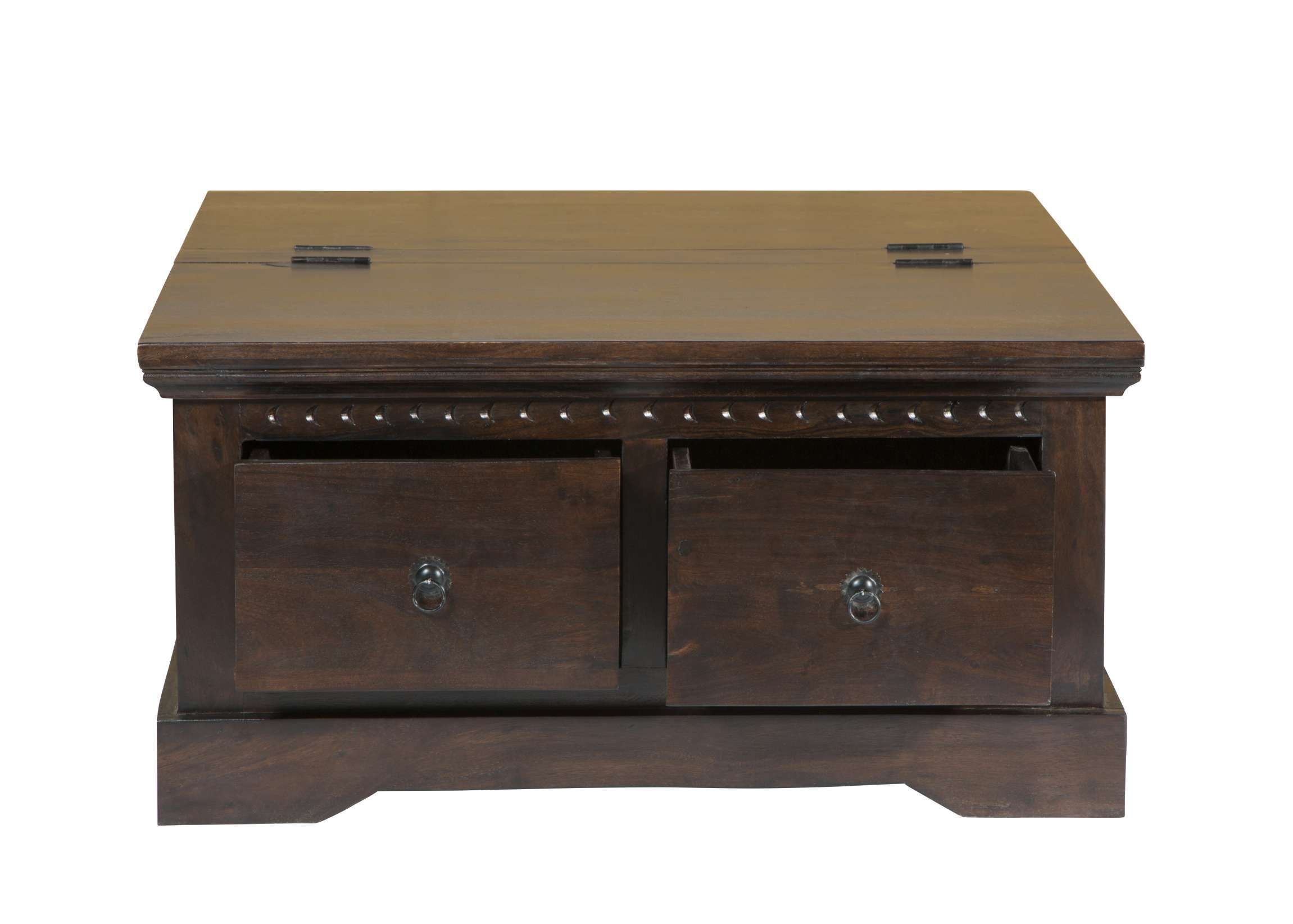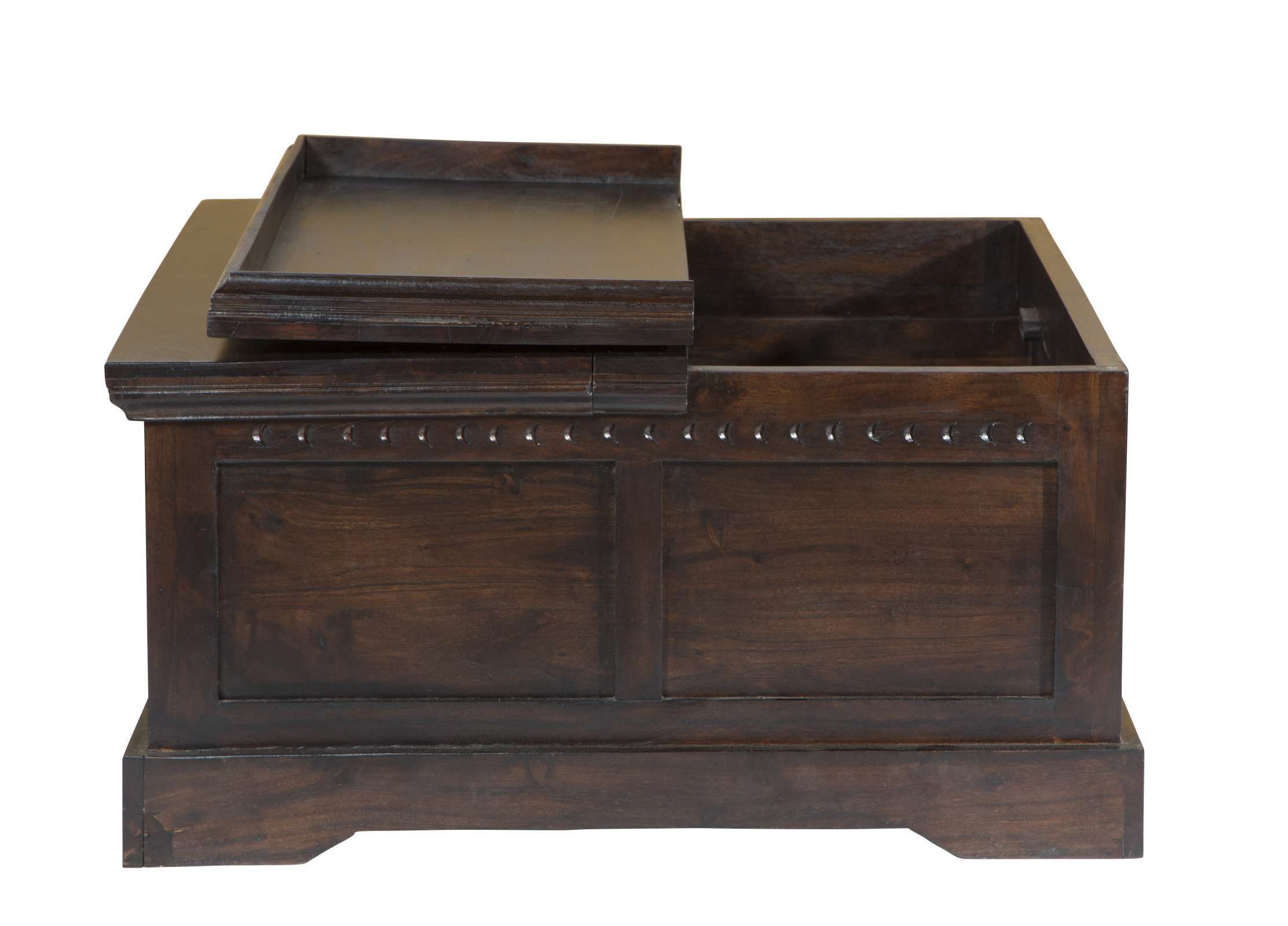 Die Truhe aus Massivholz ist im walnussfarbenen Kolonialstil lackiert. Die natürliche Maserung des Akazienholzes schimmert je nach Lichteinfluss silhouettenhaft durch die Lackierung, wodurch ein ansprechend schönes Gesamtbild entsteht. Die unterschiedliche Maserung jedes einzelnen Möbelstückes führt zu einer hohen Individualität. Der Truhentisch ist mit seinen schönen Verzierungen ein echter Hingucker und bietet zugleich komfortablen Stauraum. Die Colombo-Truhe wird in überwiegend traditioneller