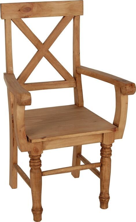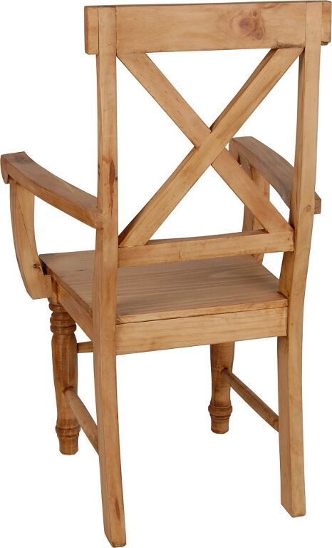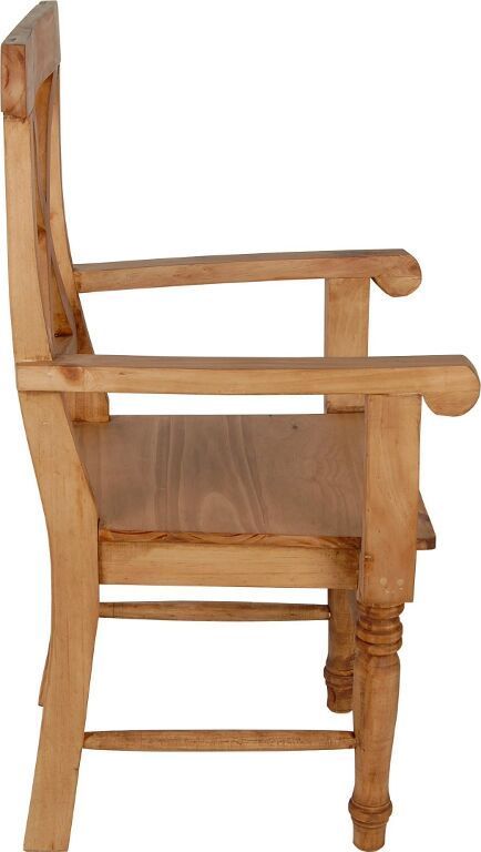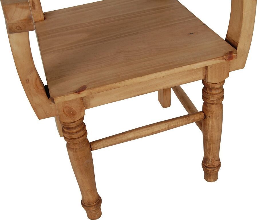 Dieser massive Holzstuhl im rustikalen Landhausstil wurde aus massivem Pinienholz gefertigt und mit speziellem Antikwachs behandelt. Die honigfarbenen Färbung des Holzes verleiht dem Landhausstuhl einen besonderen Charme der an die Tradition klassischer Bauernmöbel erinnert. Durch die ausladenden Maße von 62x108x48 cm macht dieser Armlehnstuhl besonders an den Kopfenden großer Tafeln oder als Stuhl im Arbeitszimmer eine gute Figur. Die handgedrechselten Vorderbeine verleihen dem sonst so massive