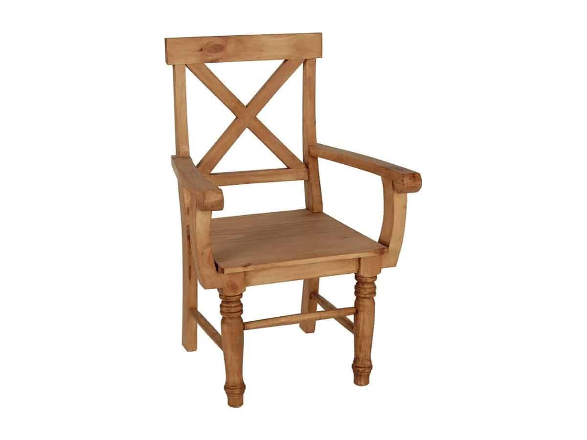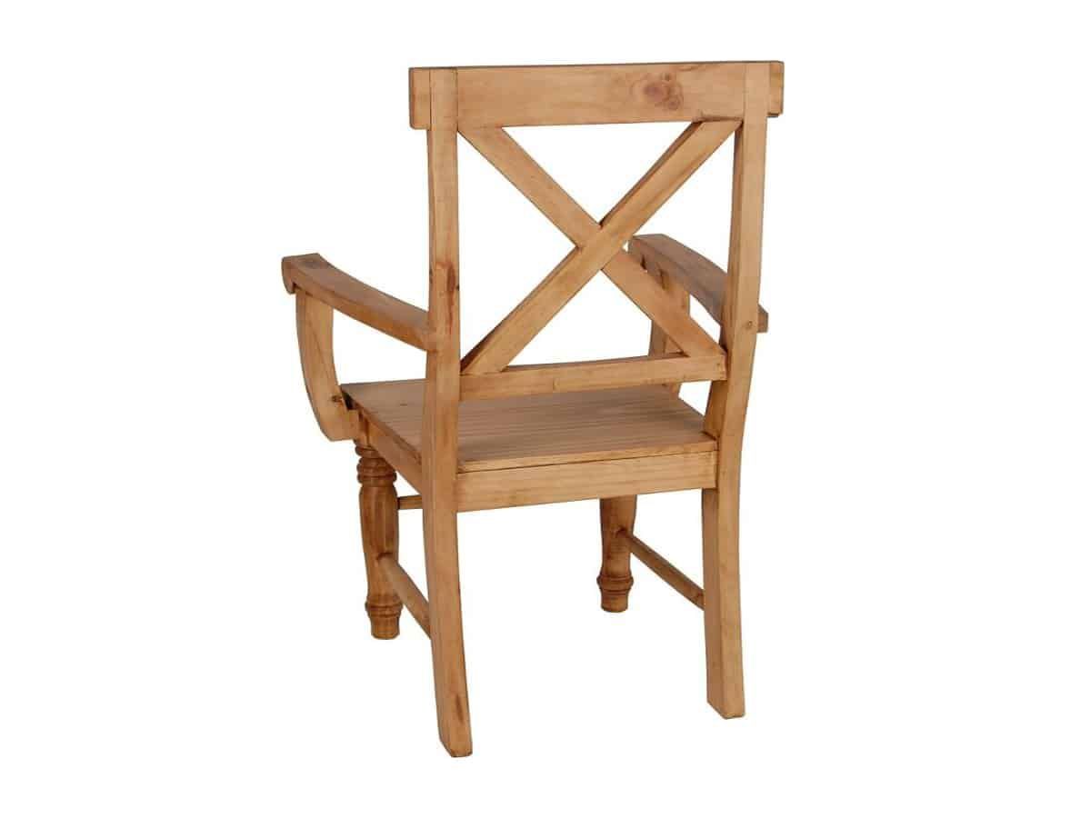 Armlehnstuhl im Landhausstil aus massivem Pinienholz, gewachst Dieser massive Holzstuhl im rustikalen Landhausstil wurde aus massivem Pinienholz gefertigt und mit speziellem Antikwachs behandelt. Die honigfarbenen Färbung des Holzes verleiht dem Landhausstuhl einen besonderen Charme der an die Tradition klassischer Bauernmöbel erinnert. Die großzügigen Maße von 108x70x70 cm verleihen dem Armlehnstuhl eine gewisse Präsenz, sodass dieser besonders gut an Kopfenden großer Tafeln oder auch a