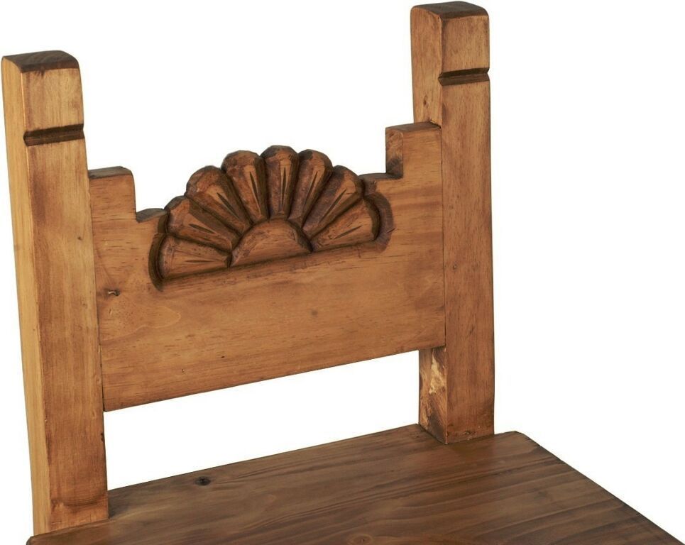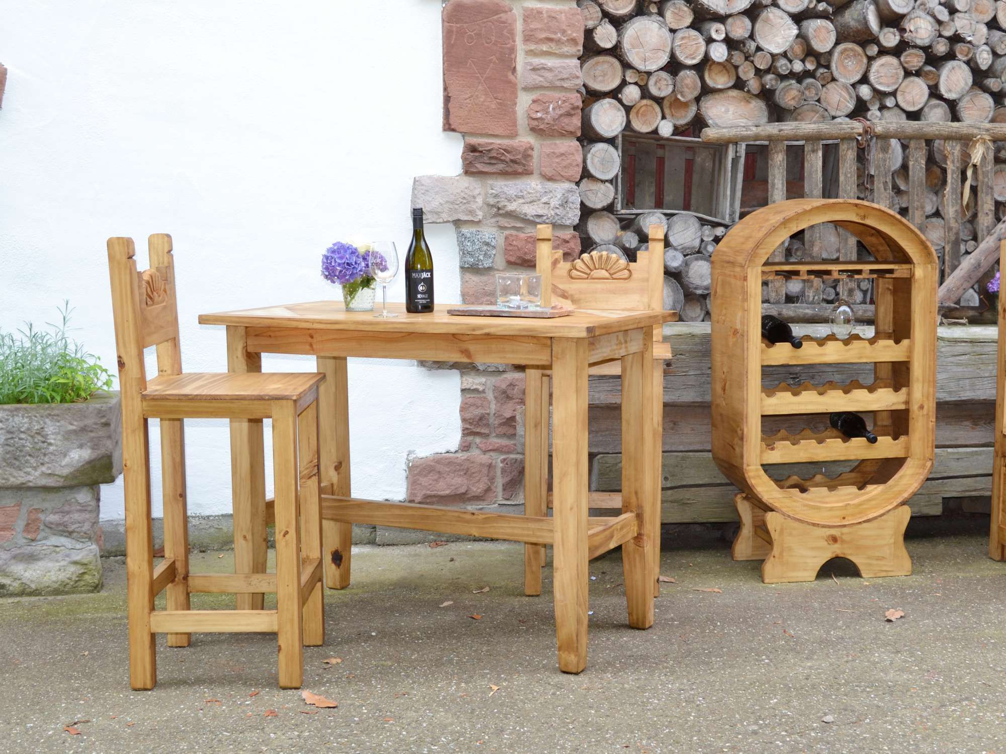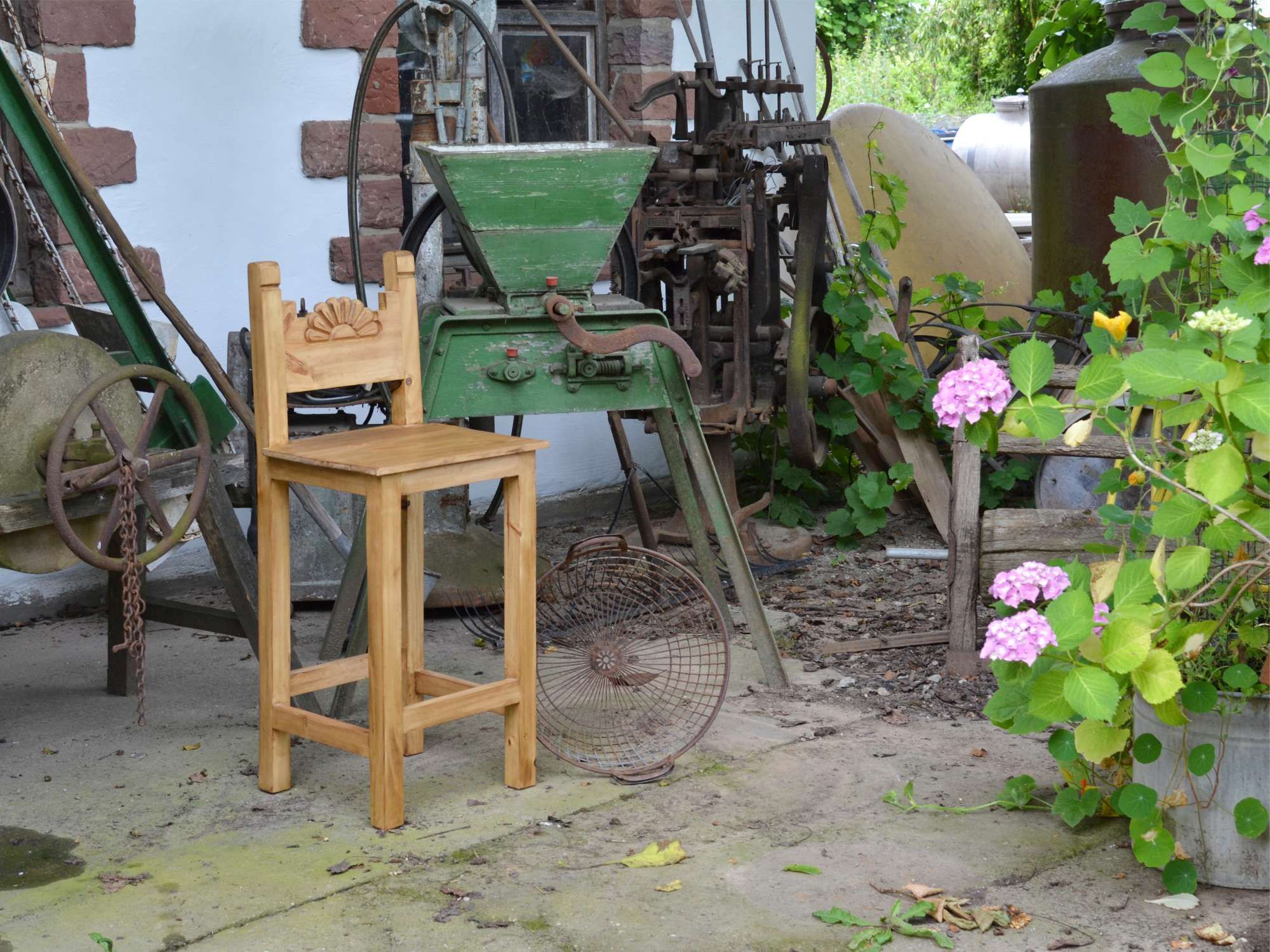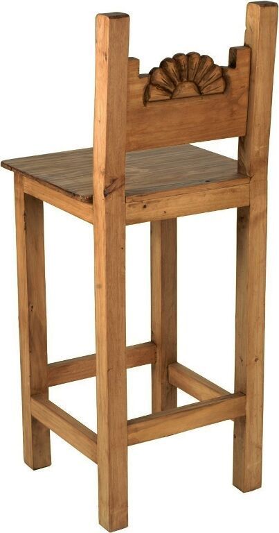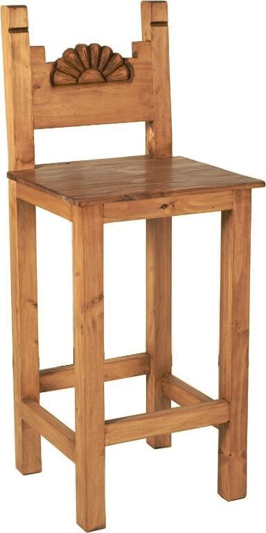 Massiver Barstuhl ohne Polster. Niedrige Rückenlehne mit einer Handgravur. Passendes Sitzkissen: Artikel-Nr. 50101