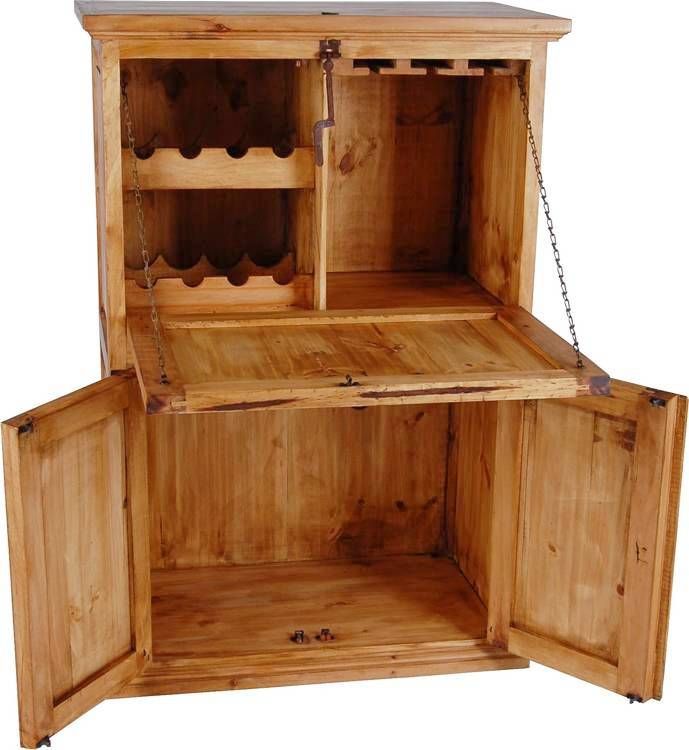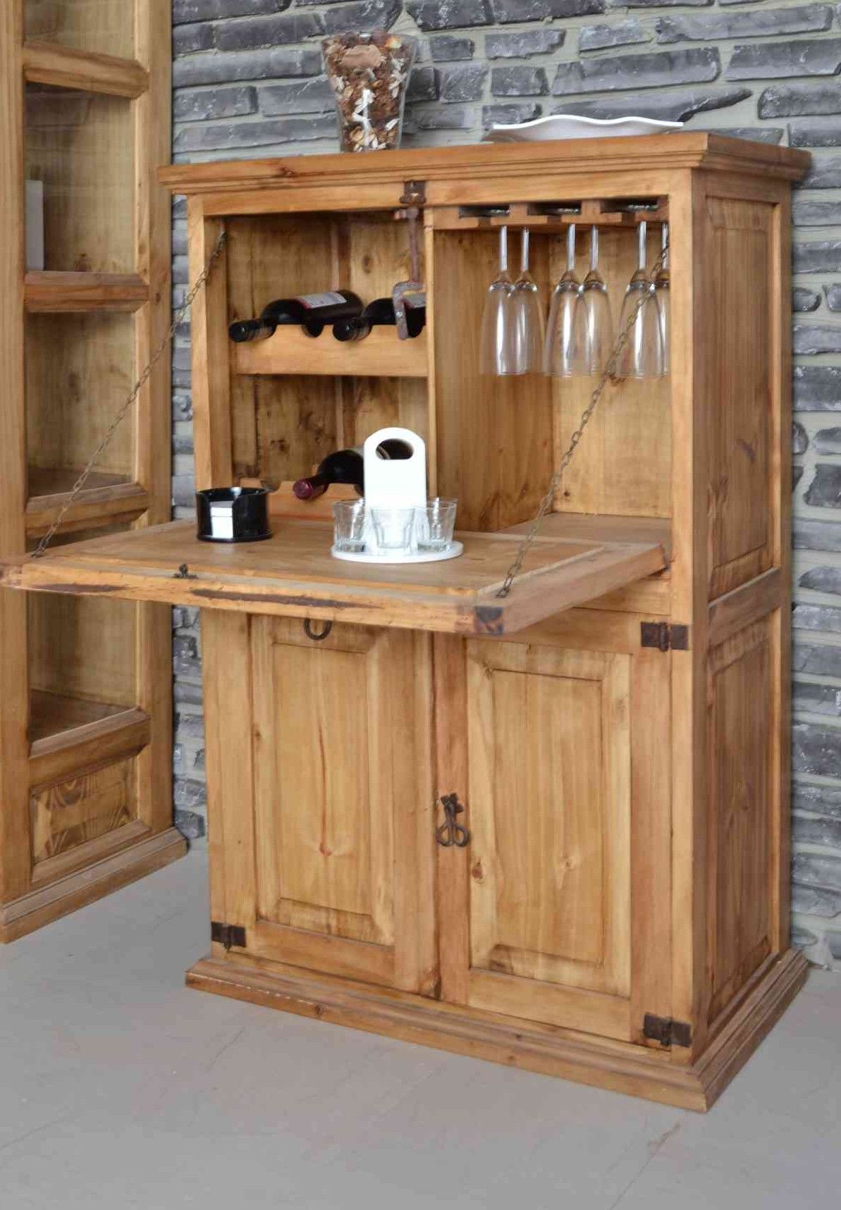 Massiver Barschrank mit zwei Türen und einer nach unten öffnenden Ablage.