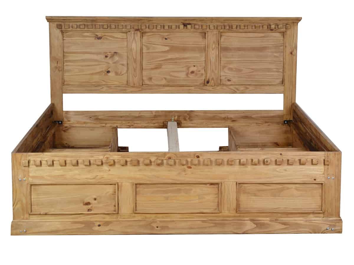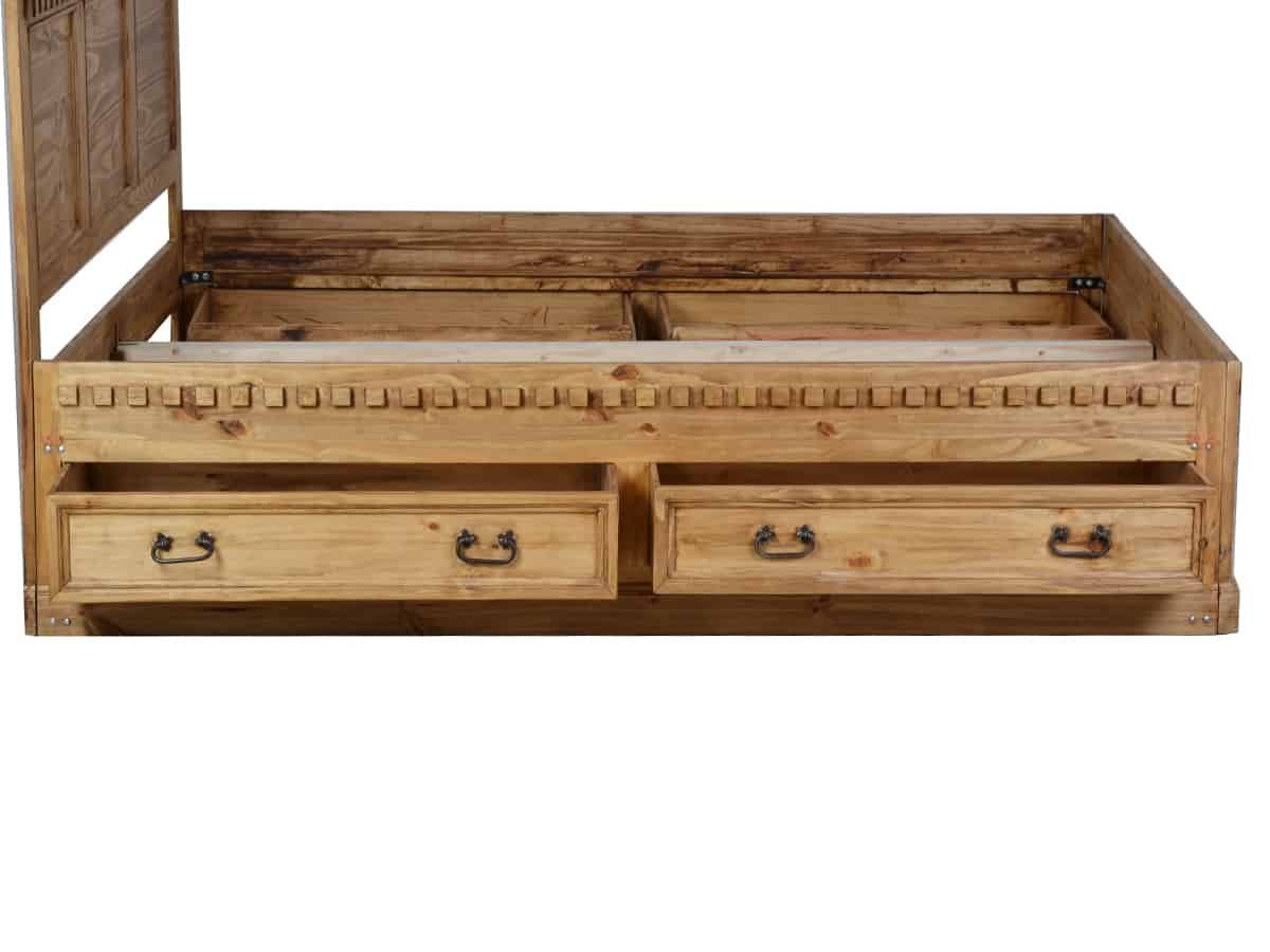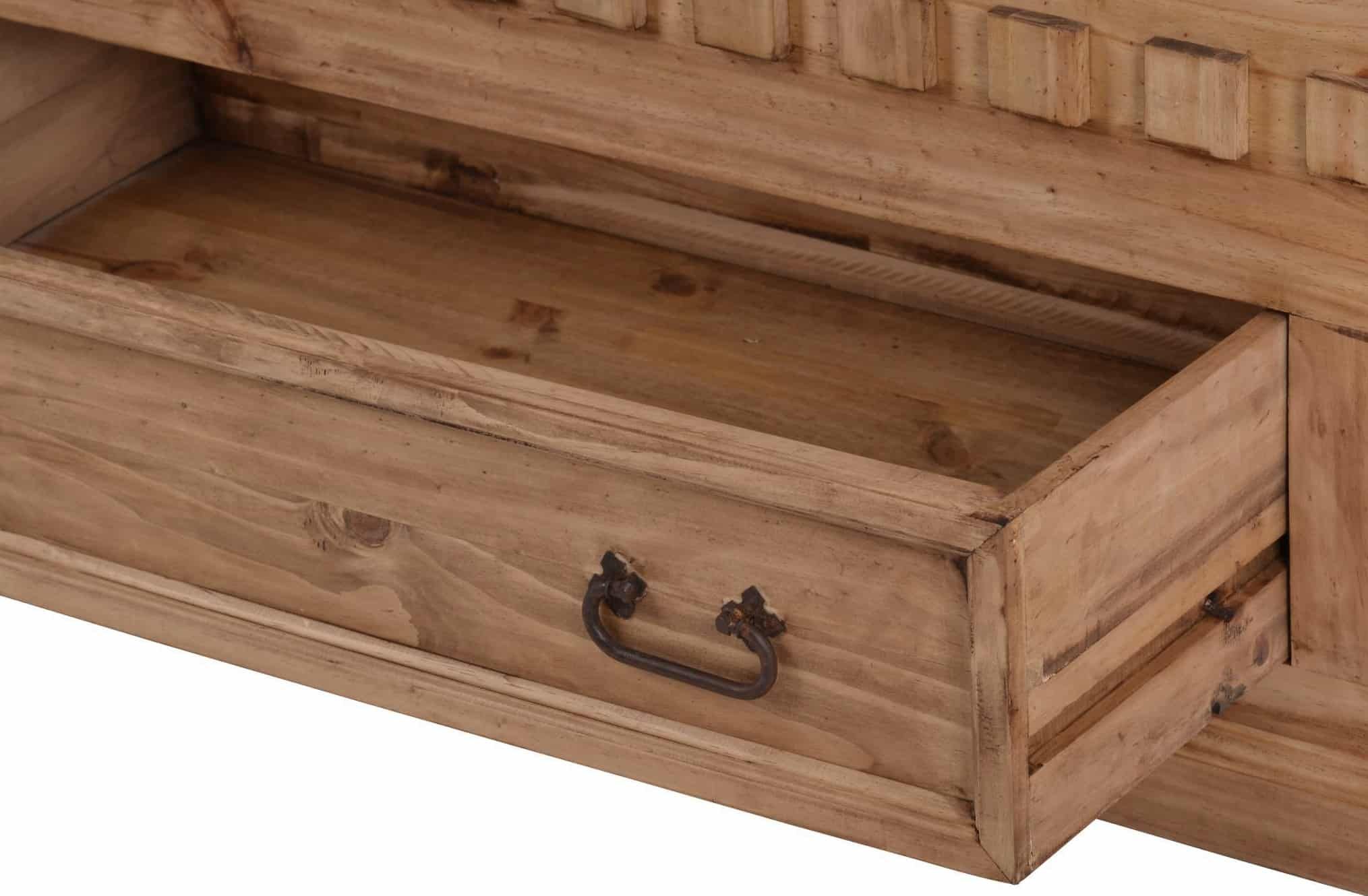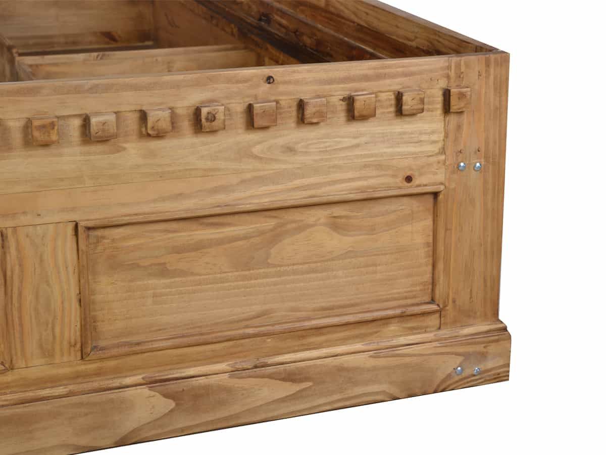Das eindrucksvolle Mexico Bett ist aus mexikanischer Pinie gefertigt und überzeugt durch aufwändige Verzierungen in einer rustikalen Verarbeitung. Das Mexico Bett besteht aus drei Teilen, wodurch der Lattenrost auf mehreren Elemente aufliegt und somit eine hohe Stabilität erzielt wird. Die Schubladen an den Seiten bieten zudem praktischen Stauraum. Besonders komfortabel bei diesem Mexico Bett ist die Einlegetiefe von 20 cm. Diese eignet sich auch für stärkere Matratzen, die durch den Rahmen pass