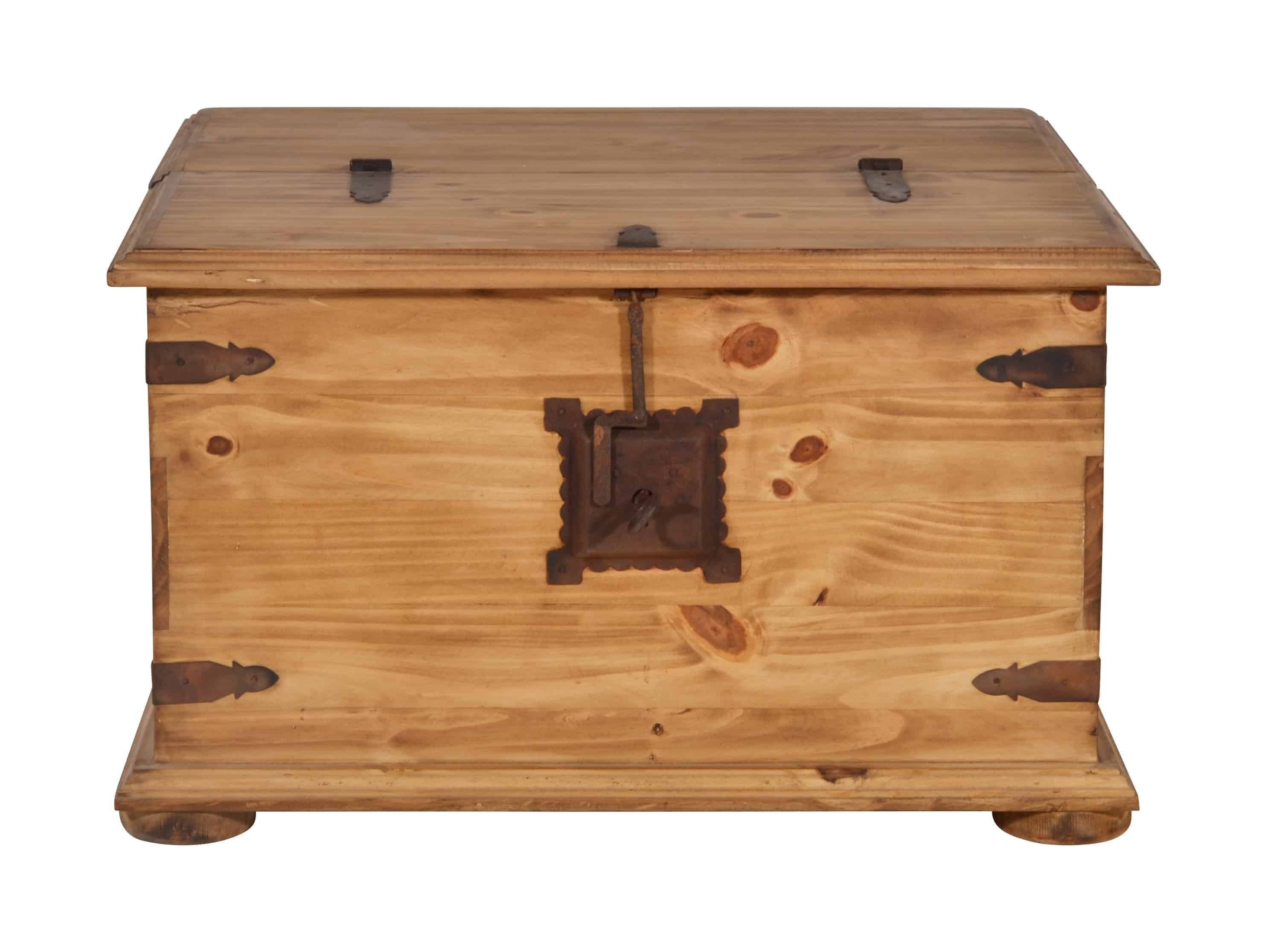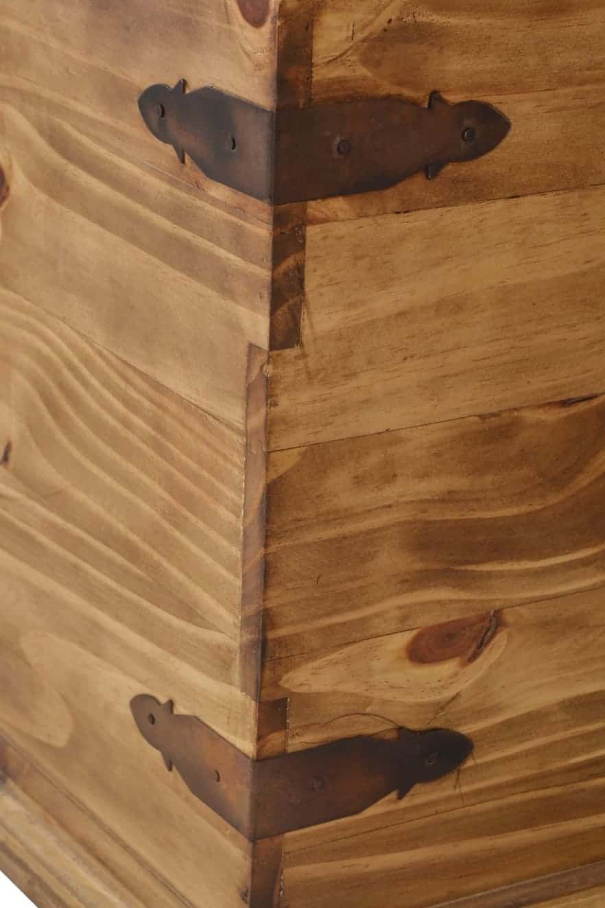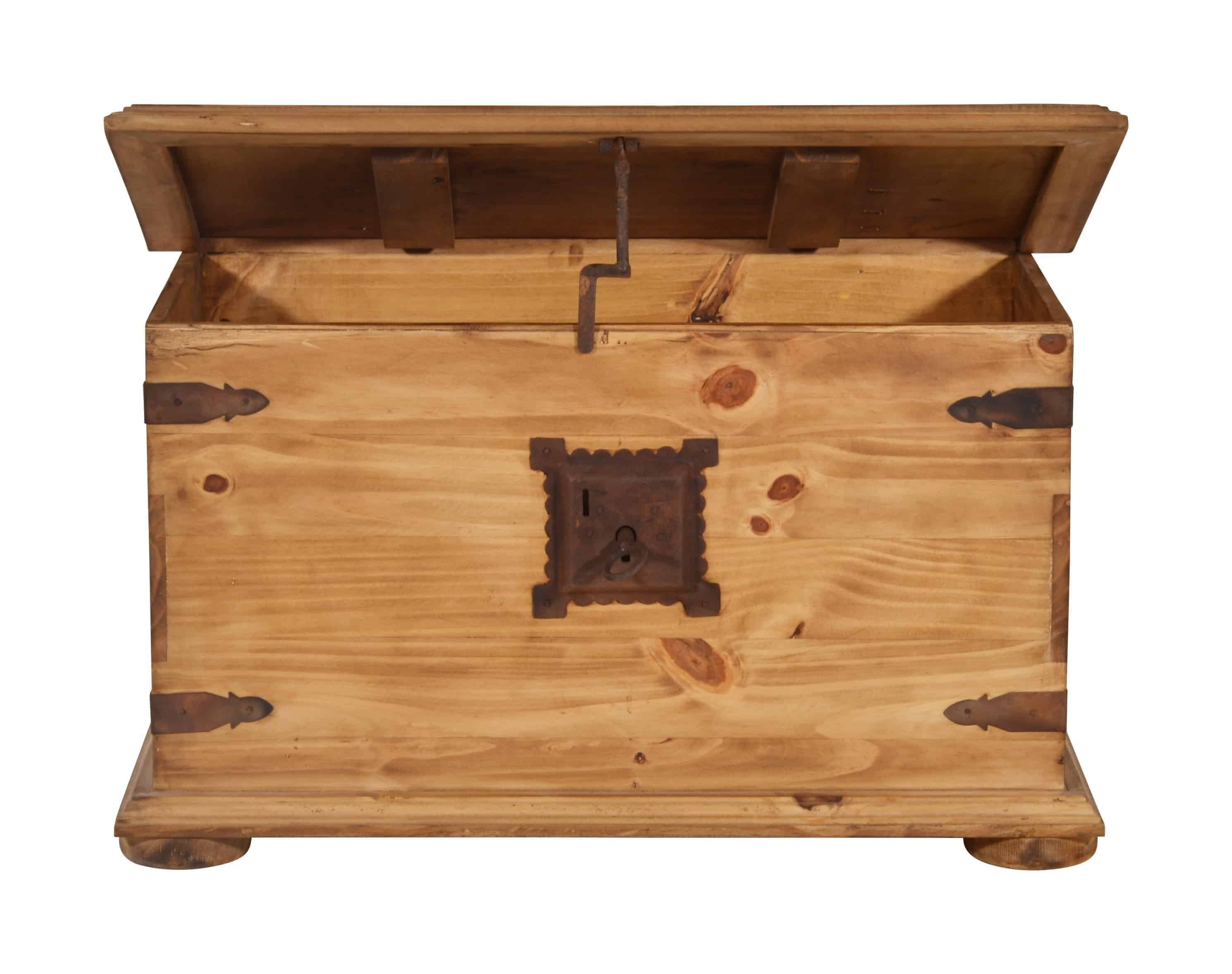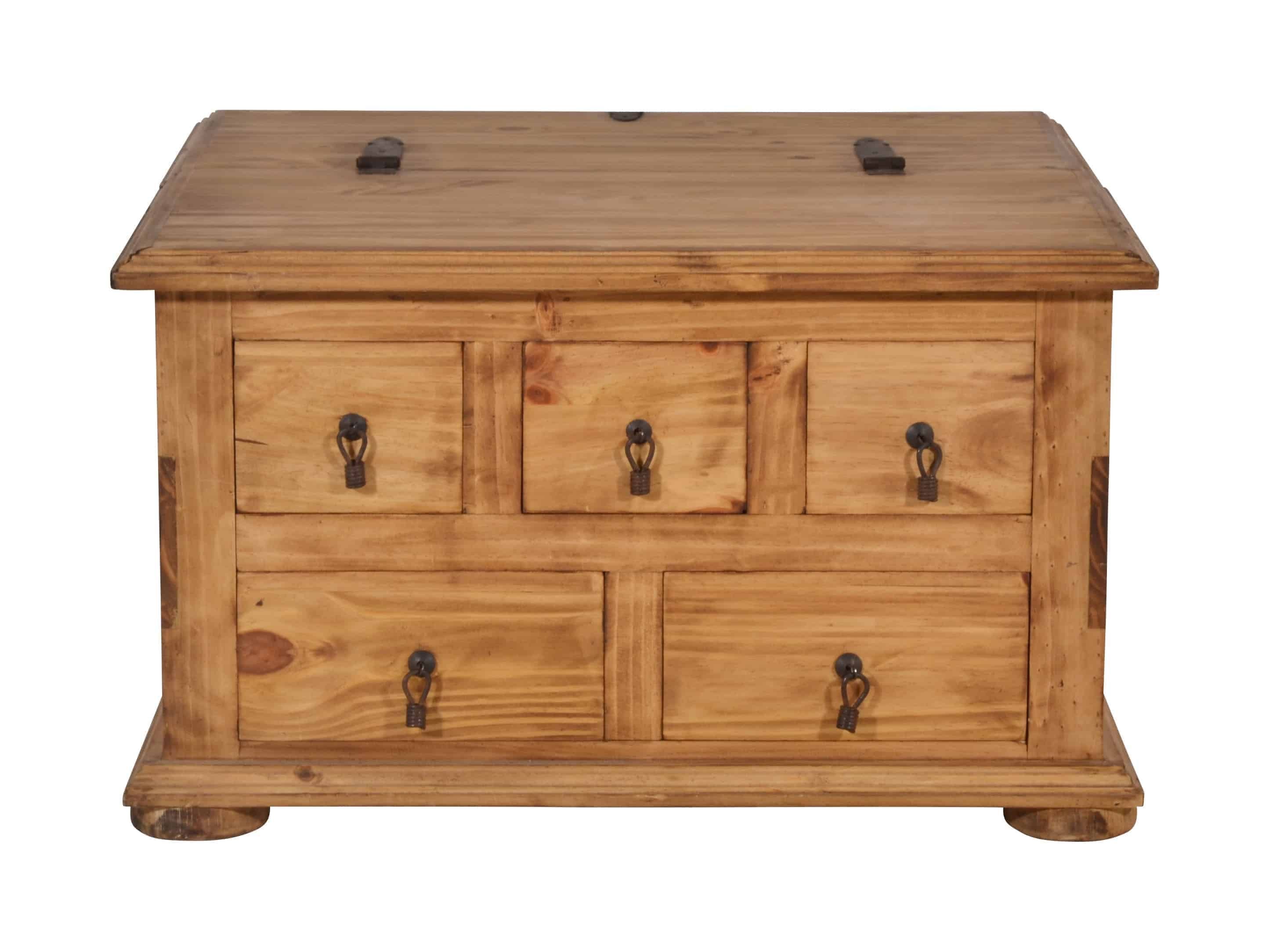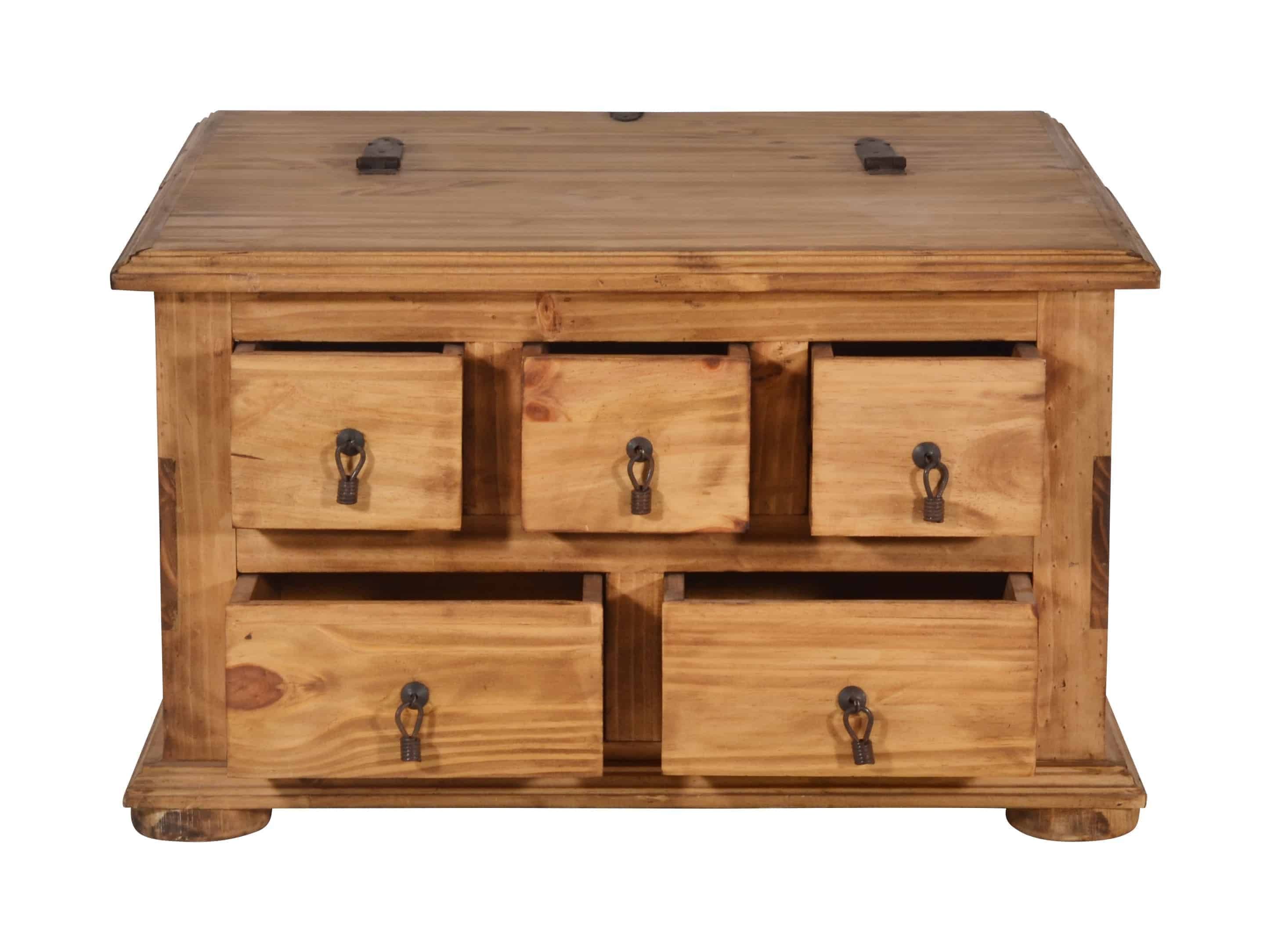 Couchtisch oder Truhe, dieses Stauraumwunder ist beides! Die Landhaus Truhe lässt sich mit einer klassischen Klappe zur Hälfte öffnen, so können in dem geräumigen Fach praktische Dinge wie Decken oder Kissen aber auch die Fotosammlung oder andere Schätze untergebracht werden. Zwei große und drei kleinere Schubladen auf der Seite bieten ausreichend Platz, um kleinere Dinge wie beispielsweise die Fernbedienung oder Knabbereien zu verstauen und schnell griffbereit zu haben. Gefertigt wurde der Tr