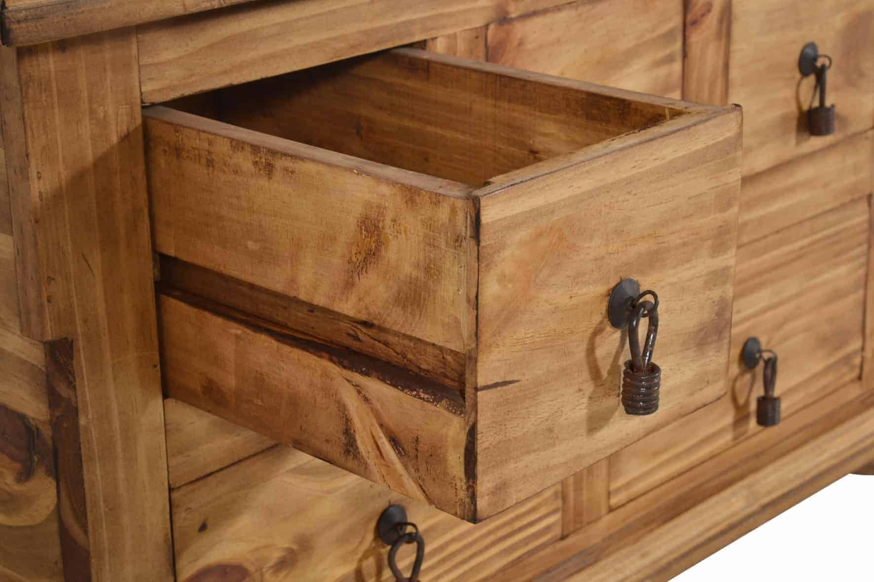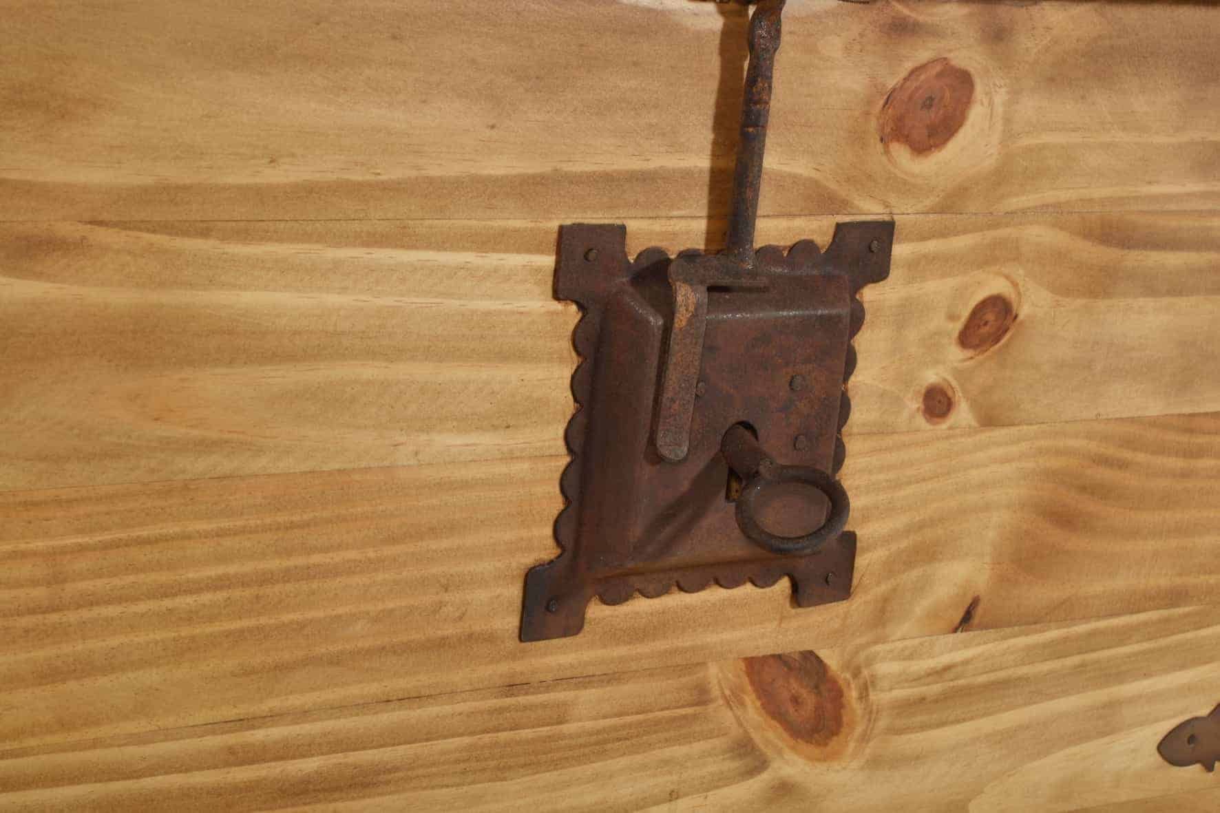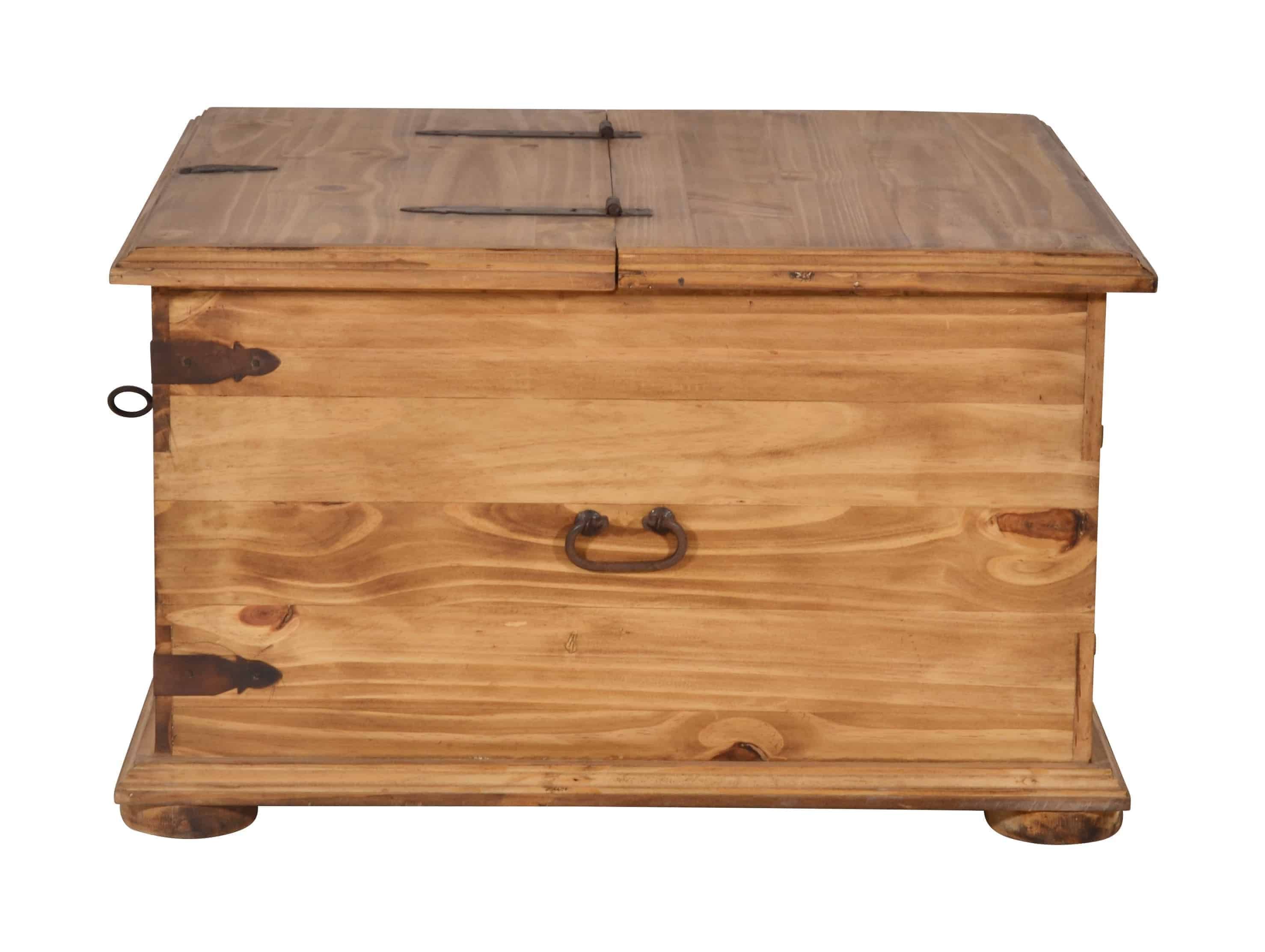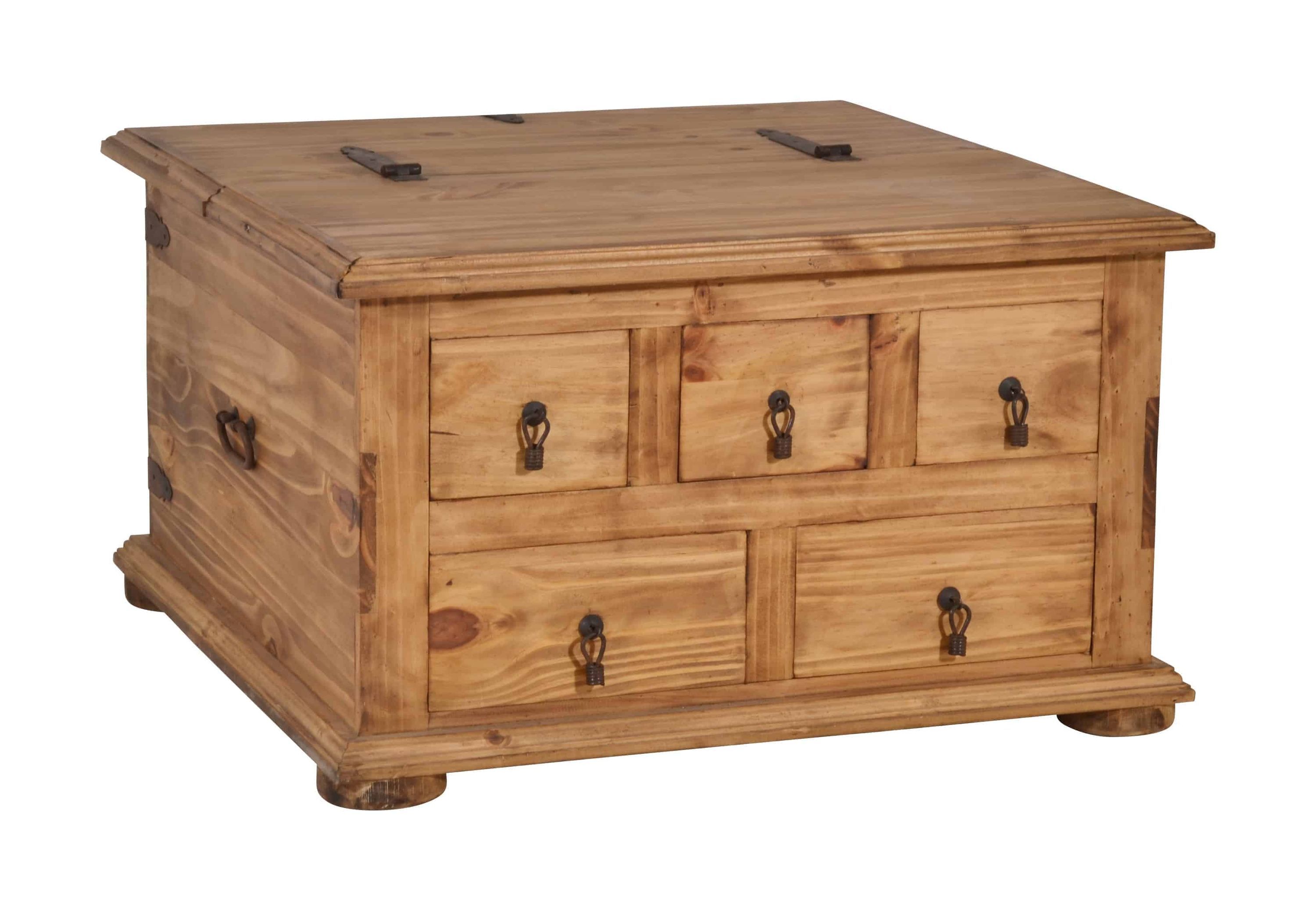 Couchtisch oder Truhe, dieses Stauraumwunder ist beides! Die Landhaus Truhe lässt sich mit einer klassischen Klappe zur Hälfte öffnen, so können in dem geräumigen Fach praktische Dinge wie Decken oder Kissen aber auch die Fotosammlung oder andere Schätze untergebracht werden. Zwei große und drei kleinere Schubladen auf der Seite bieten ausreichend Platz, um kleinere Dinge wie beispielsweise die Fernbedienung oder Knabbereien zu verstauen und schnell griffbereit zu haben. Gefertigt wurde der Tr