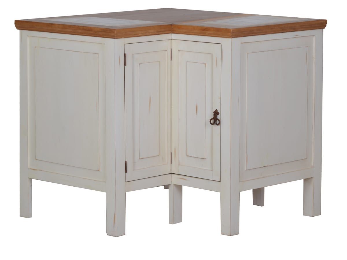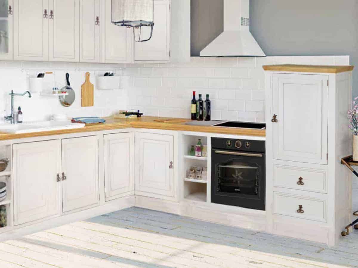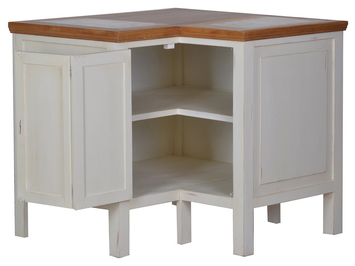 Weiße Landhausküche Eckmodul im Landhausstil mit Falttür Das Küchenmodul wurde überwiegend in Handarbeit aus massivem Pinenholz gefertigt und anschließend weiß lackiert. Um den Shabby Look zu unterstreichen wurden künstliche "Gebrauchsspuren" hinzugefügt. Auch die Beschläge und Griffe wurde von Hand aus Eisen geschmiedet und rostpatiniert. Der Innenraum des Moduls wird durch einen Einlegeboden in 2 Etagen aufgeteilt. Hier können Geschirr, Töpfe oder andere Küchenutensilien unterge