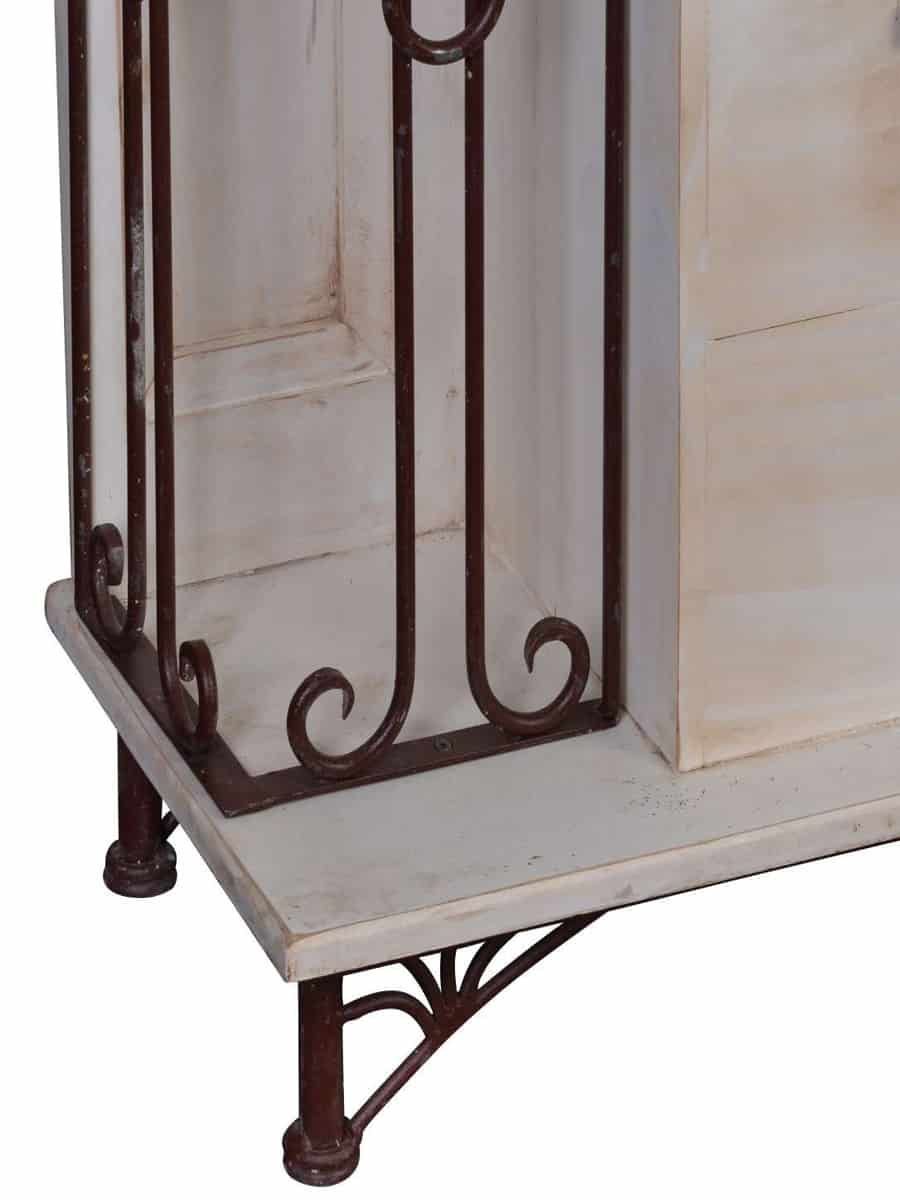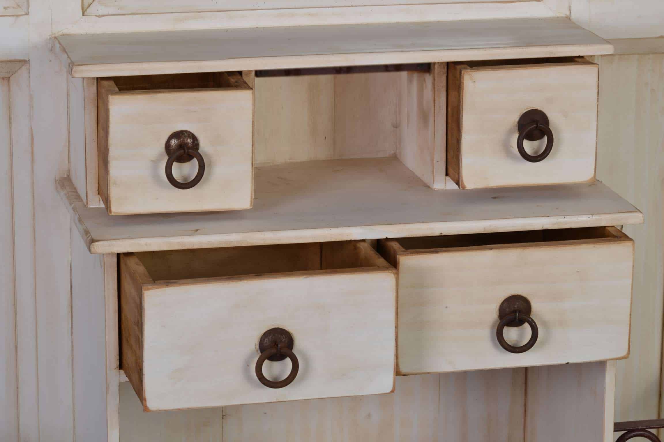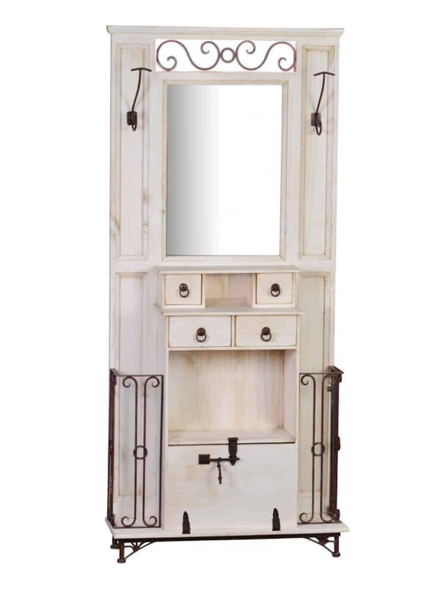 Landhaus Garderobe aus massivem Pinienholz, Old White lackiert. Diese praktische Garderobe vereint alle nützlichen Möbelstücke, die im Flur oder Eingangsbereich benötigt werden. Mit einer Tiefe von nur 30 cm eignet sie sich auch für schmale Flure und kleine Nischen. Der großzügige Spiegel in der Mitte wird von zwei kunstvoll geschmiedeten Kleiderhaken flankiert. Hier können maximal 2-3 Kleidungsstücke pro Haken ihren Platz finden. Unterhalb des Spiegels befinden sich zwei kleine Schubladen