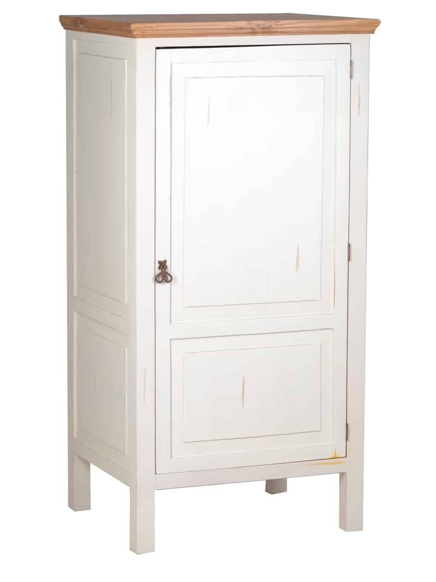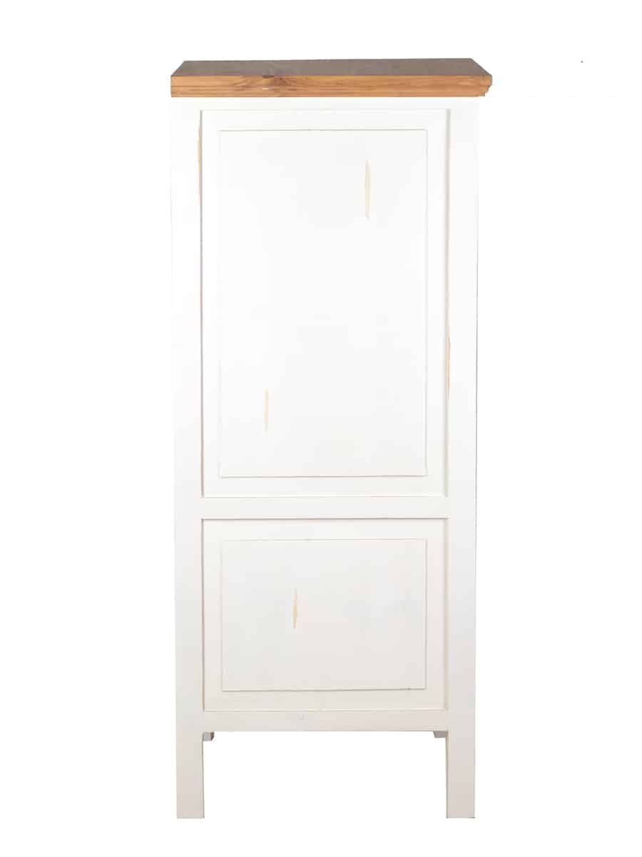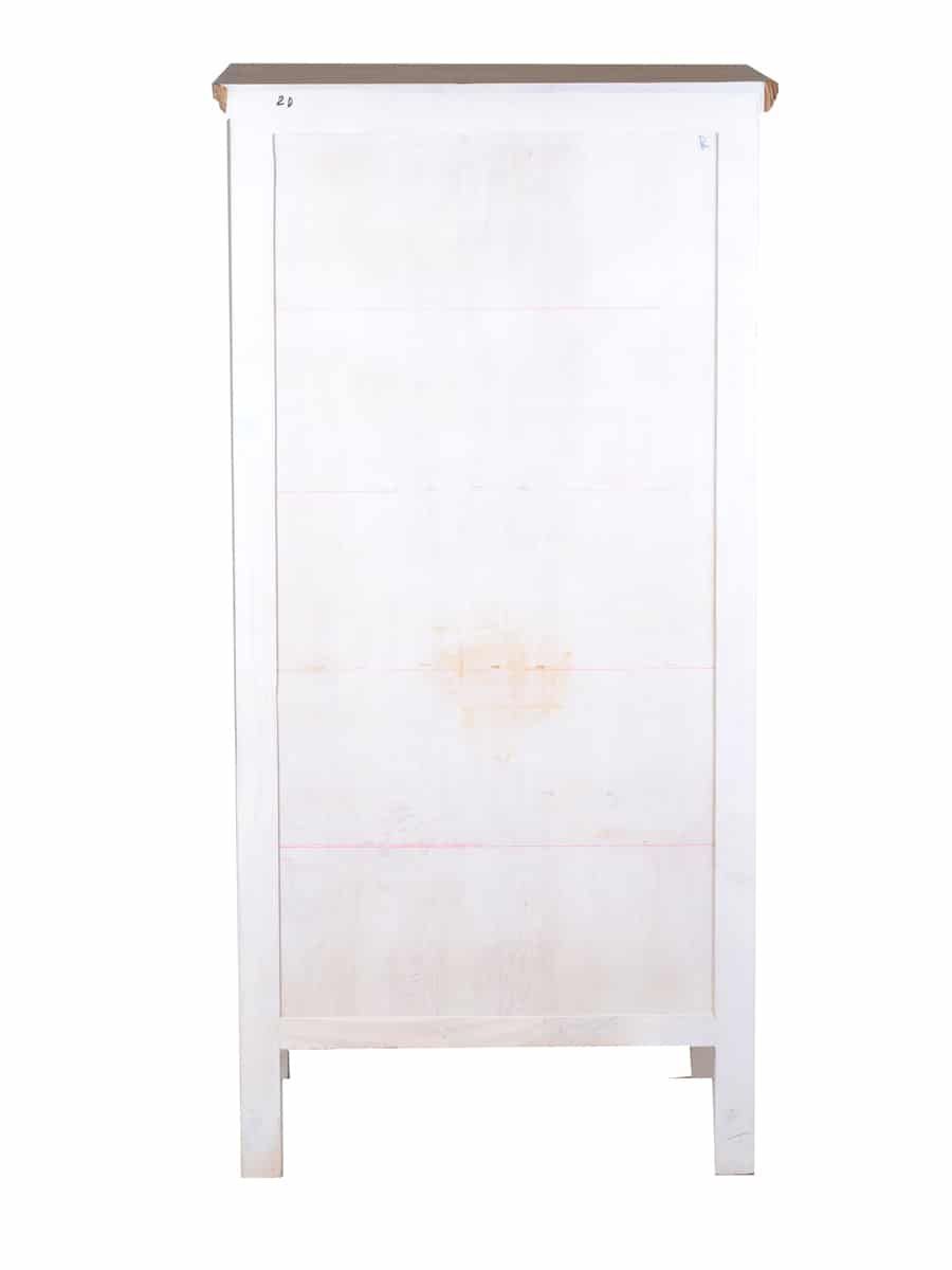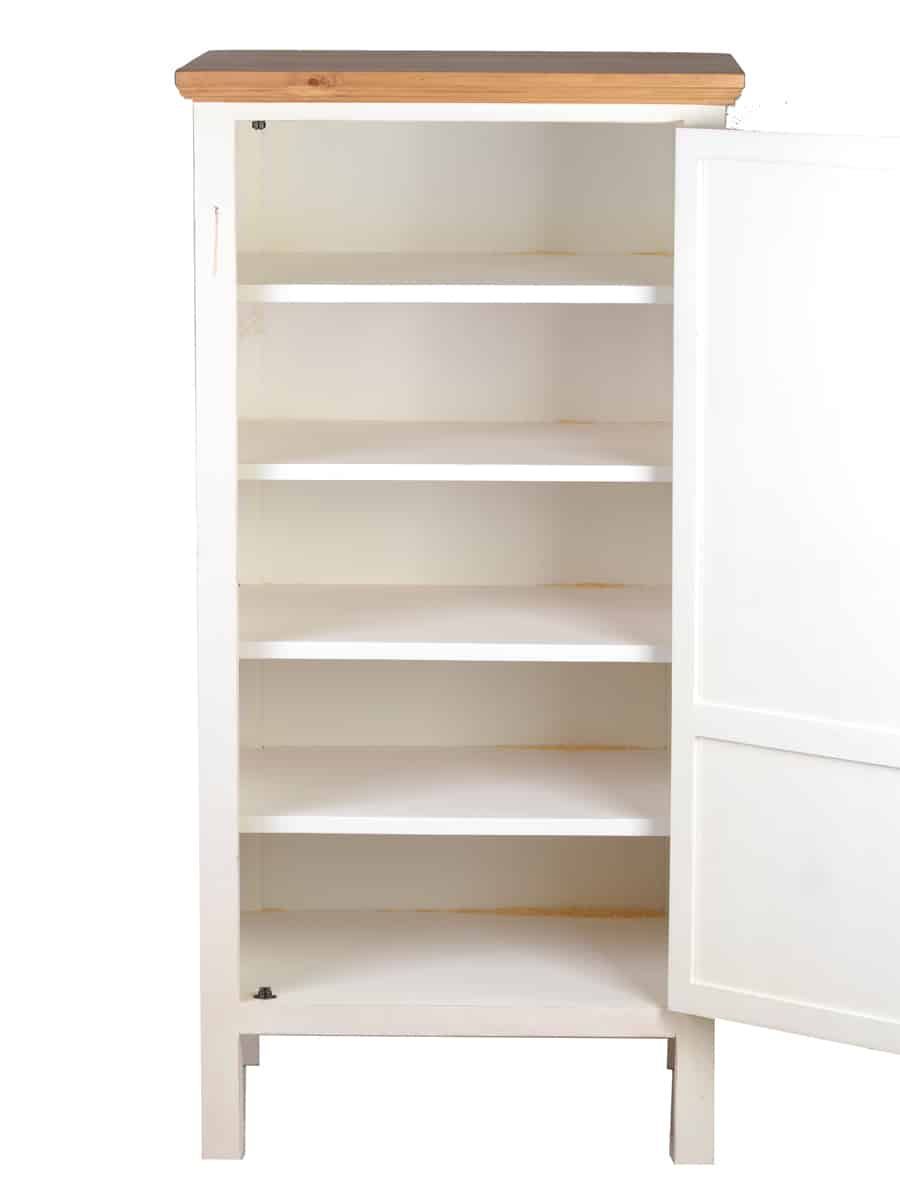 Weiße Landhausküche Hochschrank, rechts Der Hochschrank aus der Serie Mexico Old White, ergänzt unsere weiße Landhausküche aus massivem Pinienholz im angesagten Shabby Chic. Der Schrank besitzt vier feste Einlegeböden, durch die der Innenraum in 5 Ebenen aufgeteilt ist. So kann er als Vorratsschrank, Geschirrschrank sowie als Stauraum für Küchentextilien oder Kochgeschirr verwendet werden. Dank der geschlossenen Tür im Stil klassischer Kassettentüren wirkt Ihre Landhausküche immer aufg