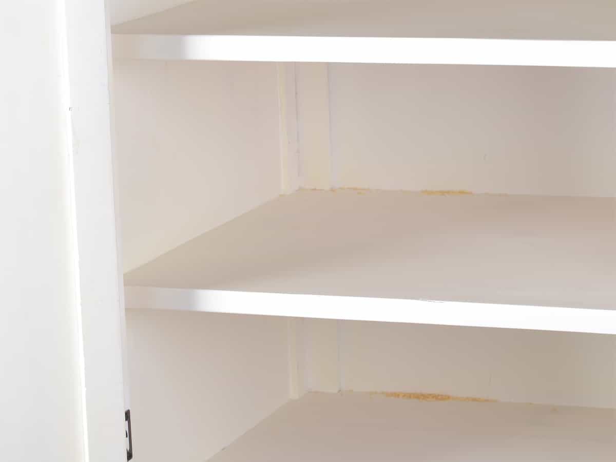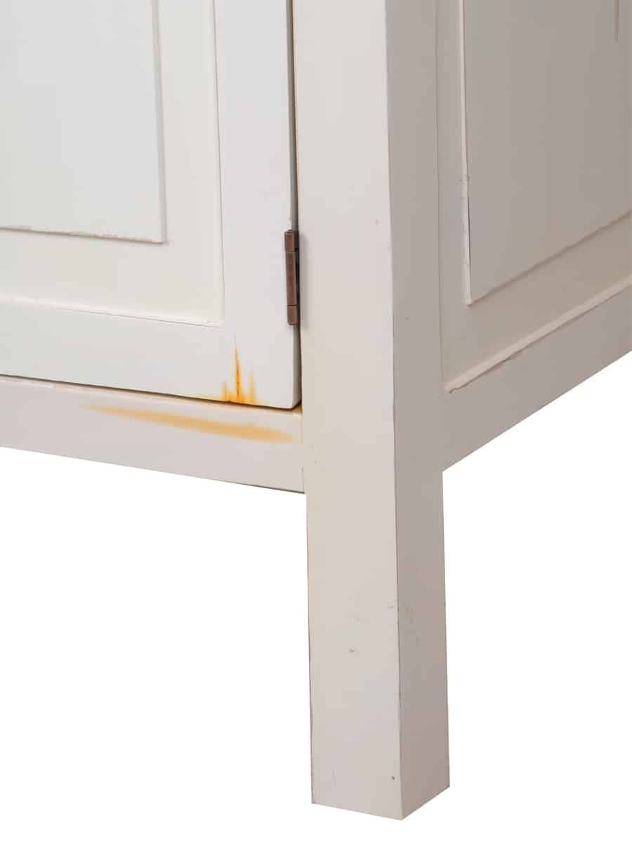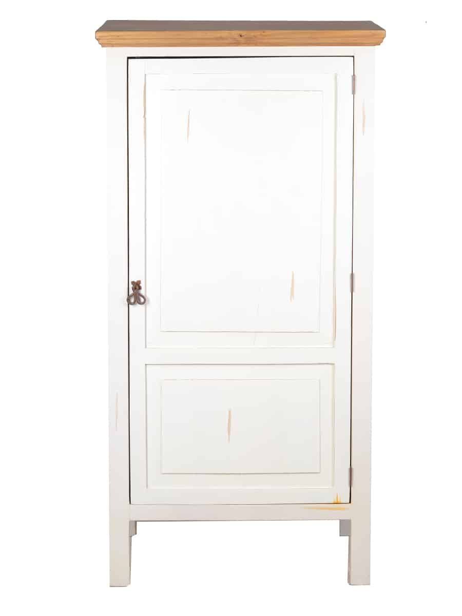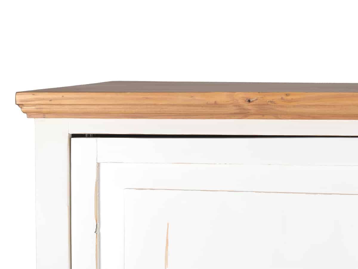 Weiße Landhausküche Hochschrank, rechts Der Hochschrank aus der Serie Mexico Old White, ergänzt unsere weiße Landhausküche aus massivem Pinienholz im angesagten Shabby Chic. Der Schrank besitzt vier feste Einlegeböden, durch die der Innenraum in 5 Ebenen aufgeteilt ist. So kann er als Vorratsschrank, Geschirrschrank sowie als Stauraum für Küchentextilien oder Kochgeschirr verwendet werden. Dank der geschlossenen Tür im Stil klassischer Kassettentüren wirkt Ihre Landhausküche immer aufg