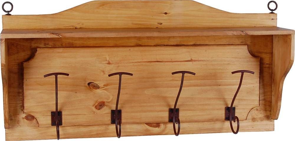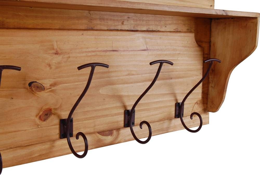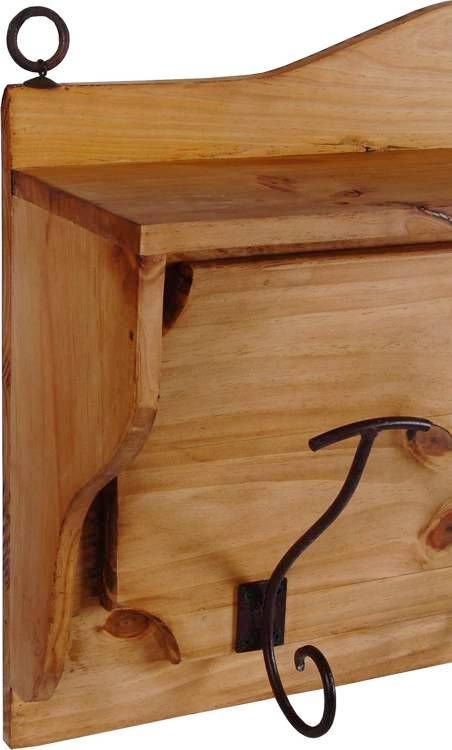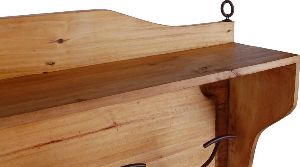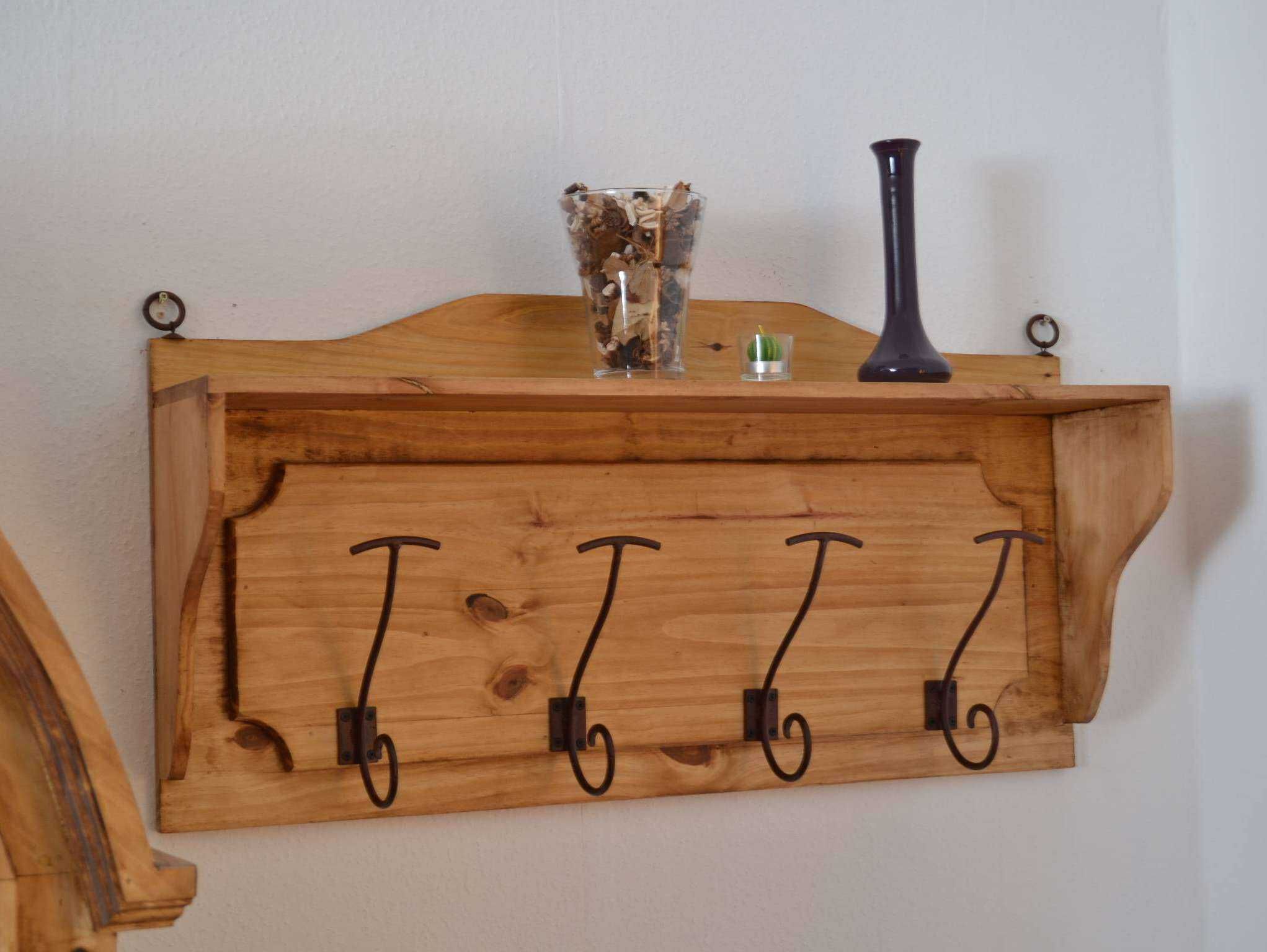 Landhaus Kleiderhalter/Garderobe mit Hutablage und 8 Haken Diese kleine Wandgarderobe im Landhausstil erinnert an die klassischen Flurablagen traditioneller Bauernhäuser. Dank ihrer kompakten Größe sorgen sie auch in kleinen Fluren schnell für Stauraum, sodass Jacke, Mütze und Schal stets schnell zur Hand sind. Die Wandgarderobe ist aus massivem Pinienholz gefertigt und mit Antikwachs versehen. Auf diese Weise kommt die Lebhafte Maserung des Holzes noch einmal verstärkt zur Geltung. Um d