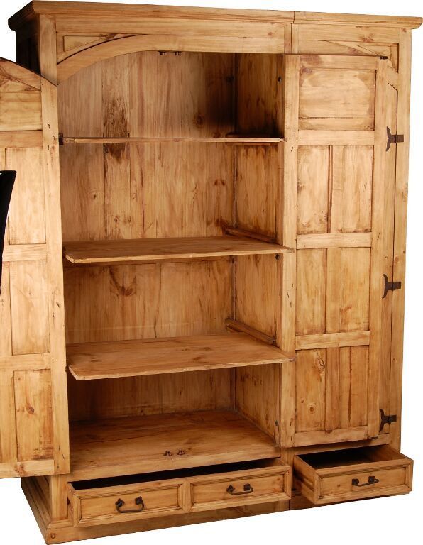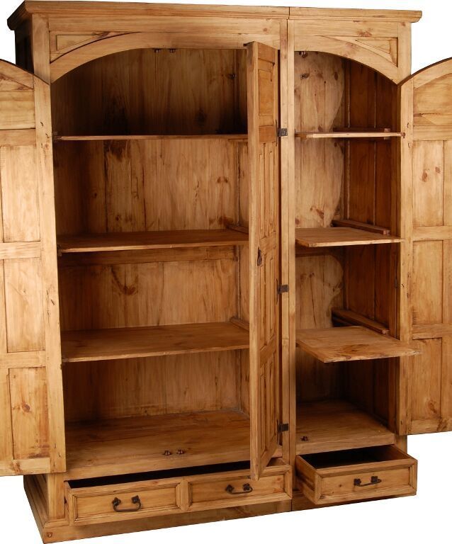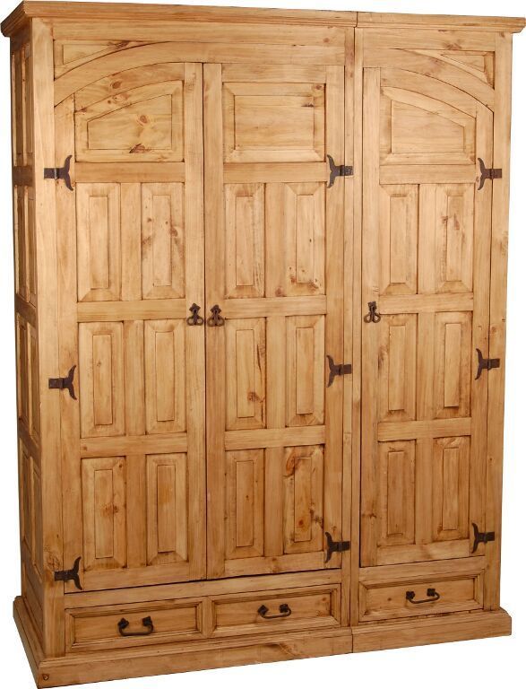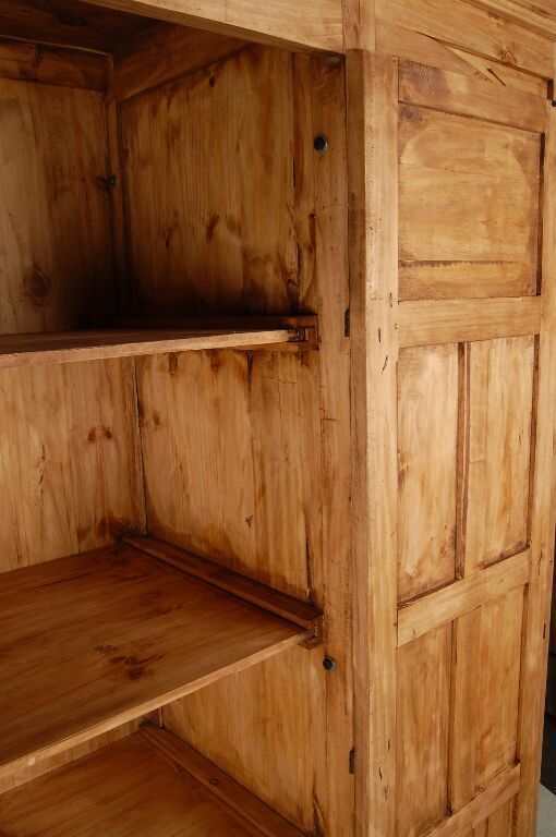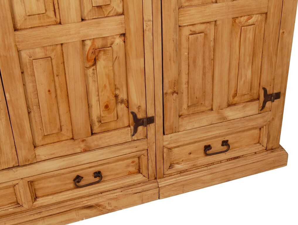 Geräumiger 3-türiger Holz Schrank aus massiver Pinie, antik gewachst. Dieser klassische Bauernschrank besteht aus zwei Teilen, die zum Transport getrennt werden können. Hinter drei Türen befinden sich insgesamt 6 Einlegeböden, die bei bedarf ganz einfach entnommen werden können. So können Sie die Einteilung des Schrankes selbst variieren. Eine große und eine kleine Schublade, runde das Platzangebot des Landhaus Schrankes ab. Wunderschöner Blickfang des Schrankes sind die hochwertigen Kasse