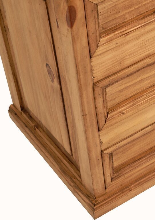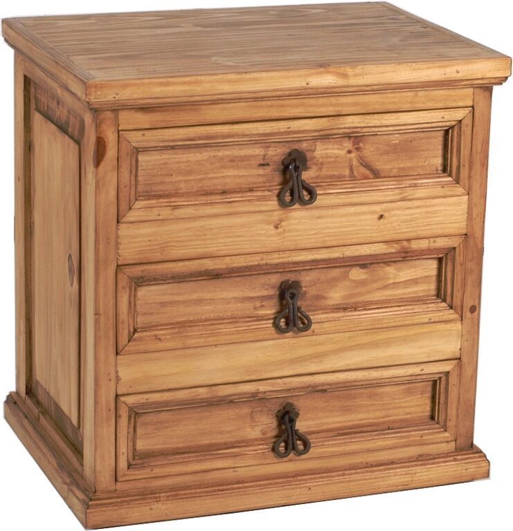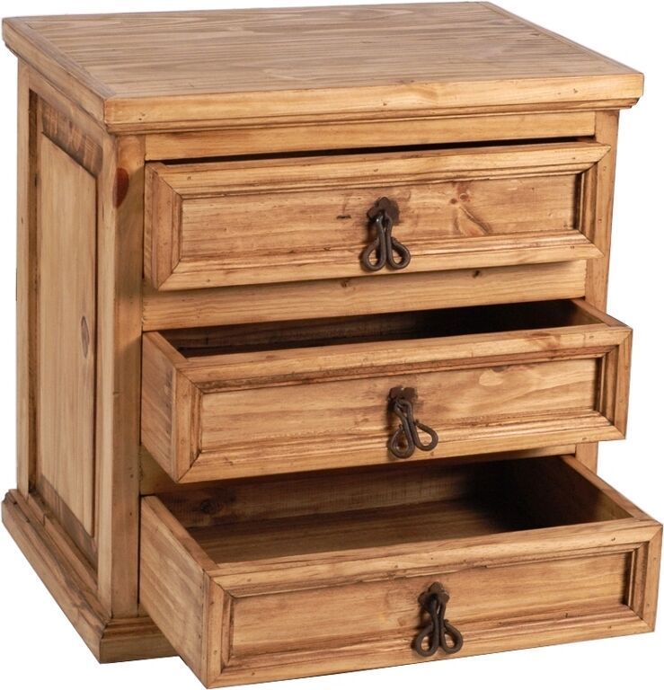 Massiver Nachttisch mit drei Schubladen. Griffe aus Schmiedeeisen.
