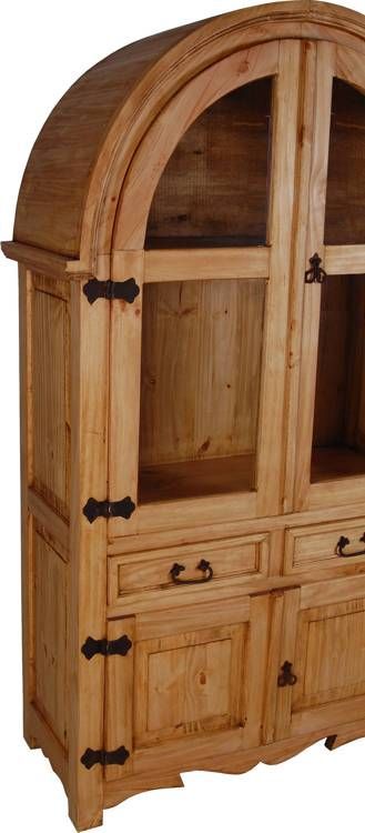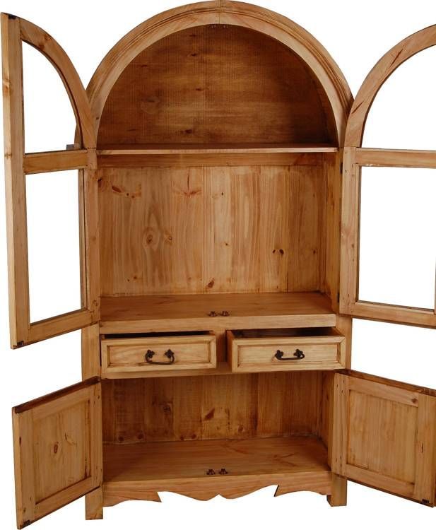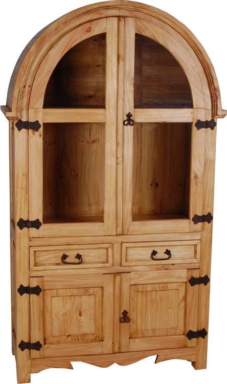 Große Vitrine im Landhausstil aus massivem Pinienholz, antik gewachst. Diese Rundbogenvitrine ist nicht nur ein Blickfang, sie bietet auch viel Platz für die Schönen und nützlichen Dinge des Alltags. Diese Bauernvitrine wurde optisch in zwei Teile aufgeteilt. Der obere Vitrinenteil wurde als Rundbogen gestaltet und die beiden Glastürflügel durch eine Querleiste verstärkt. Hinter der Tür befindet sich ein stabiler herausnehmbarer Einlegeboden, der den Innenraum in zwei Fächer teilt. Im untere