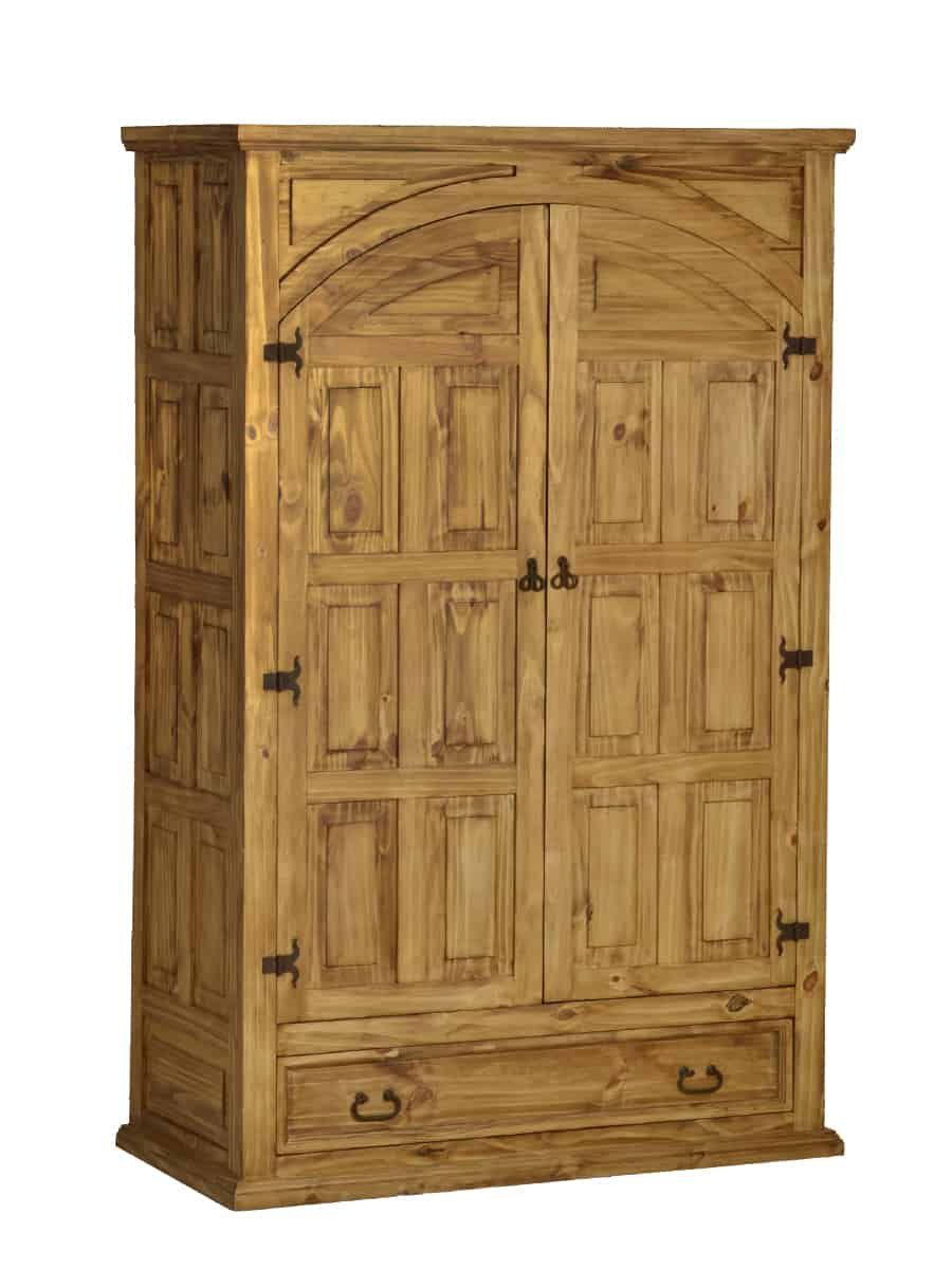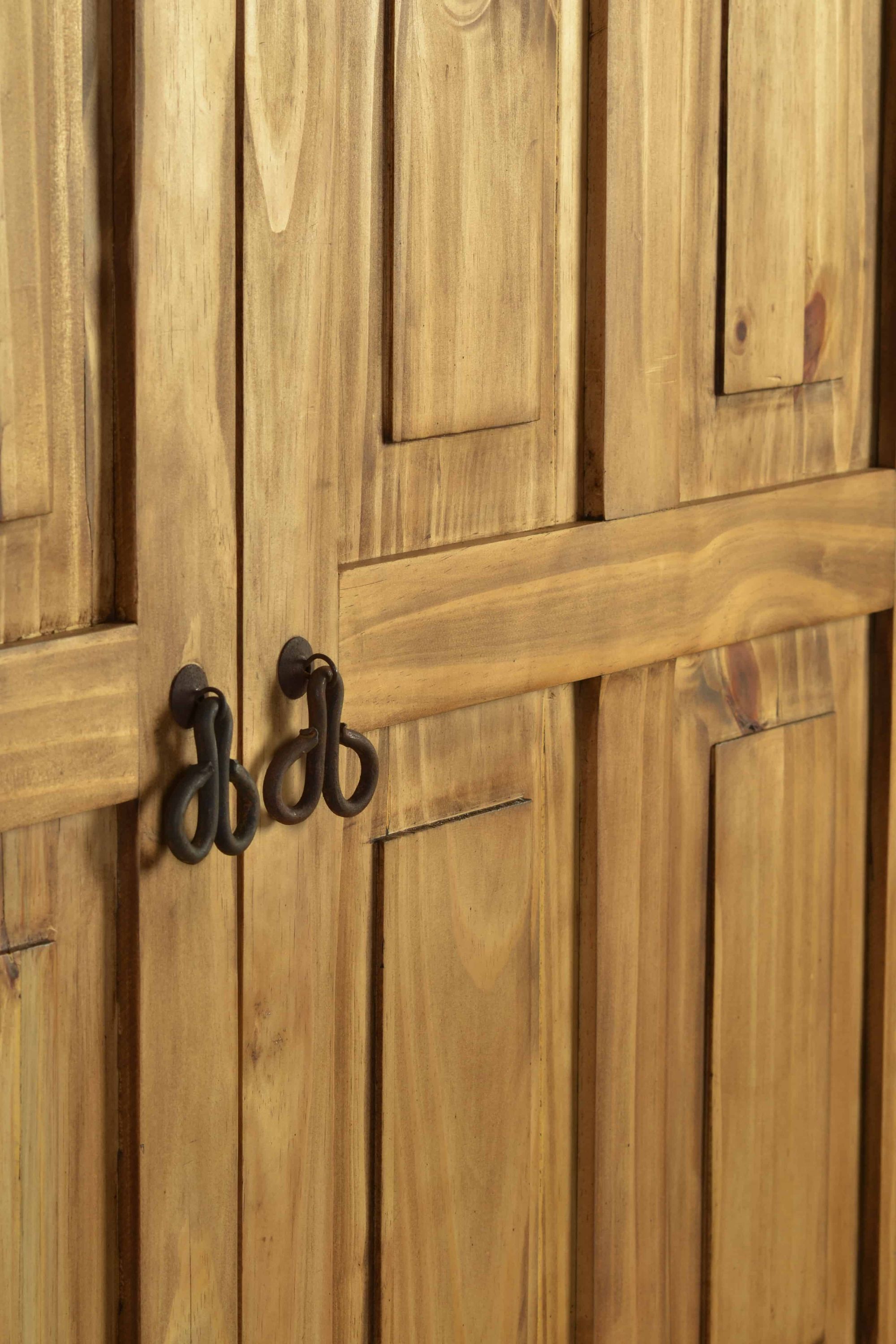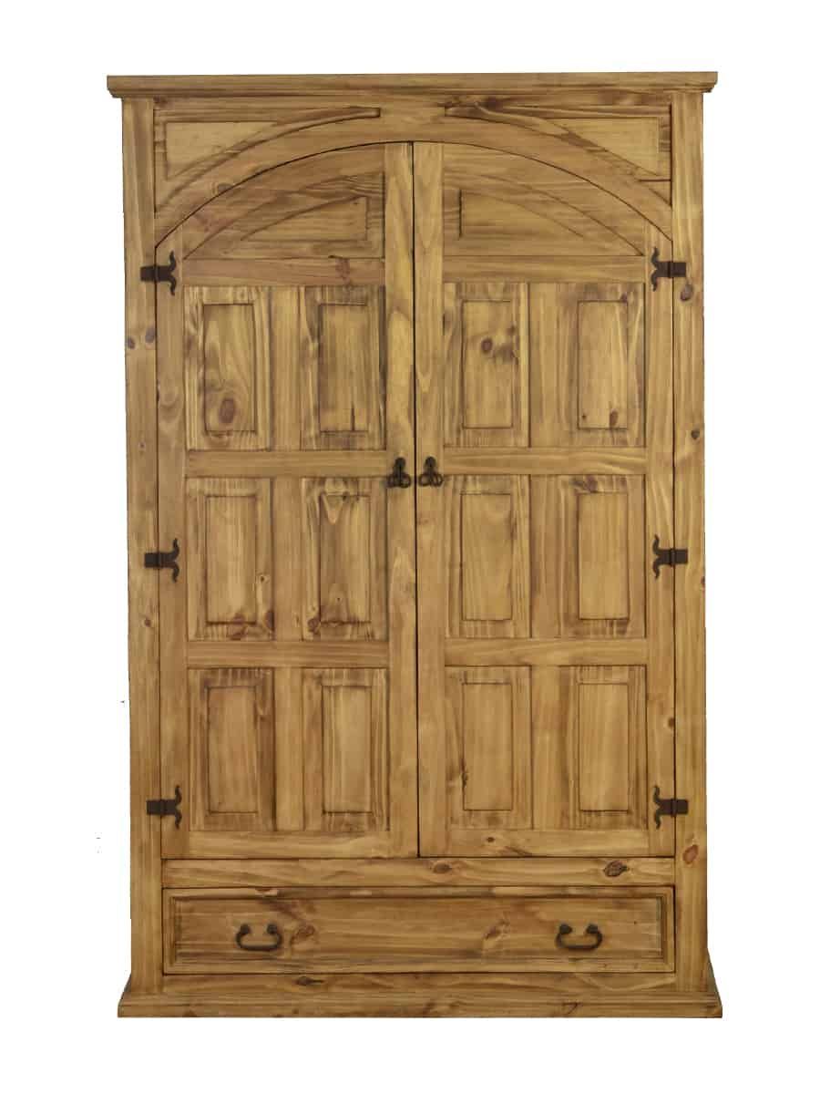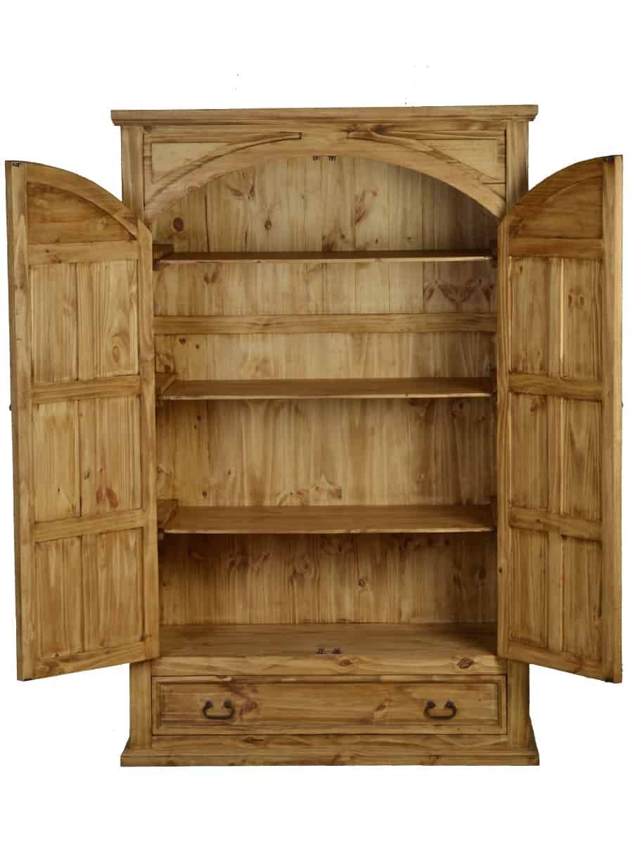 Wunderschöner und ausdrucksstarker Landhaus Schrank aus Pinienholz. Der Schrank wurde aus Massivholz gefertigt und anschließend mit Antikwachs versiegelt. In seiner Form erinnert der Holzschrank an einen klassischen Renaissance Schrank. Die Frontaufteilung wurde in eine große Schublade am Boden sowie zwei große Flügeltüren gegliedert. Die aufwendigen Kassettentüren besitzen einen Halbbogen, welcher die sonst gerade Formgebung des Schrankes wunderbar kontrastiert. Die kunstvoll geschwungenen