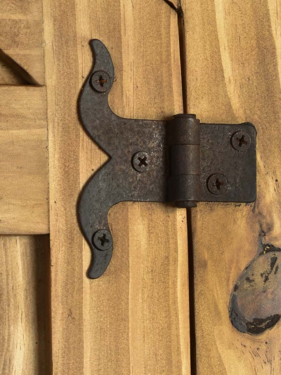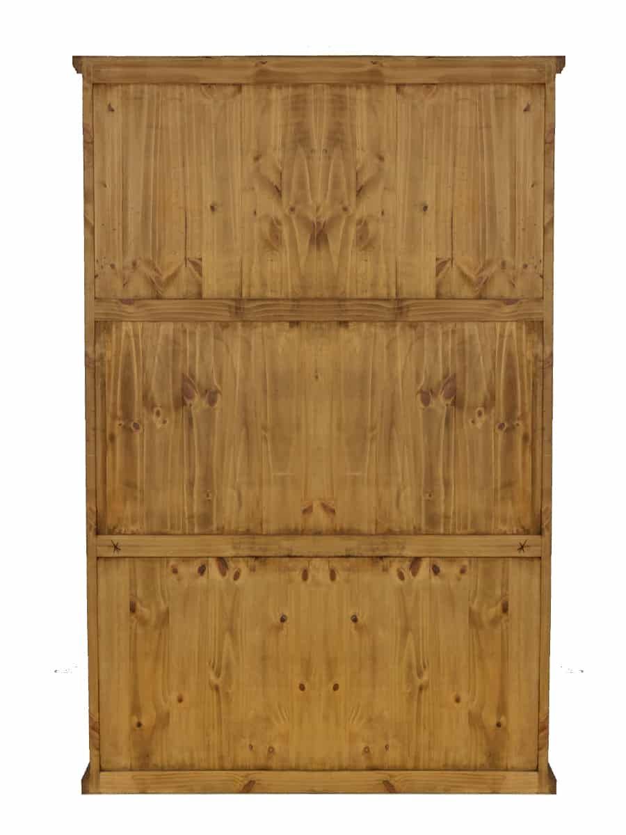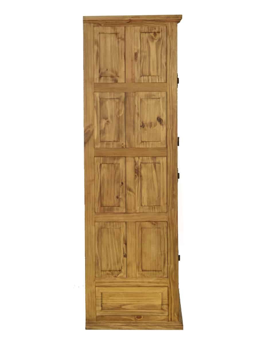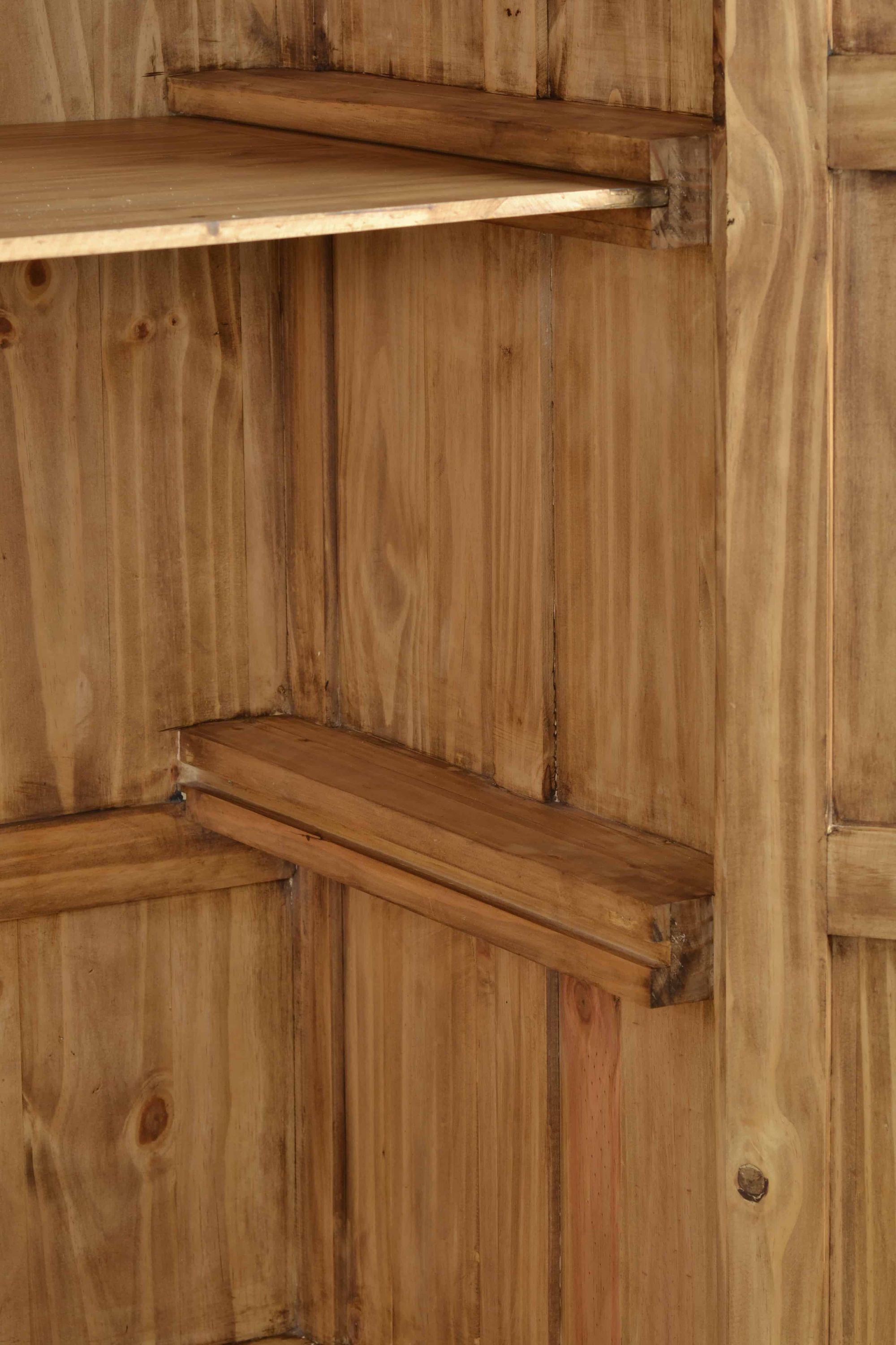 Wunderschöner und ausdrucksstarker Landhaus Schrank aus Pinienholz. Der Schrank wurde aus Massivholz gefertigt und anschließend mit Antikwachs versiegelt. In seiner Form erinnert der Holzschrank an einen klassischen Renaissance Schrank. Die Frontaufteilung wurde in eine große Schublade am Boden sowie zwei große Flügeltüren gegliedert. Die aufwendigen Kassettentüren besitzen einen Halbbogen, welcher die sonst gerade Formgebung des Schrankes wunderbar kontrastiert. Die kunstvoll geschwungenen