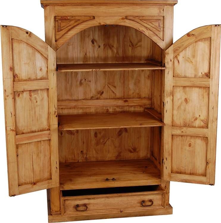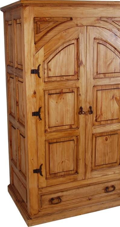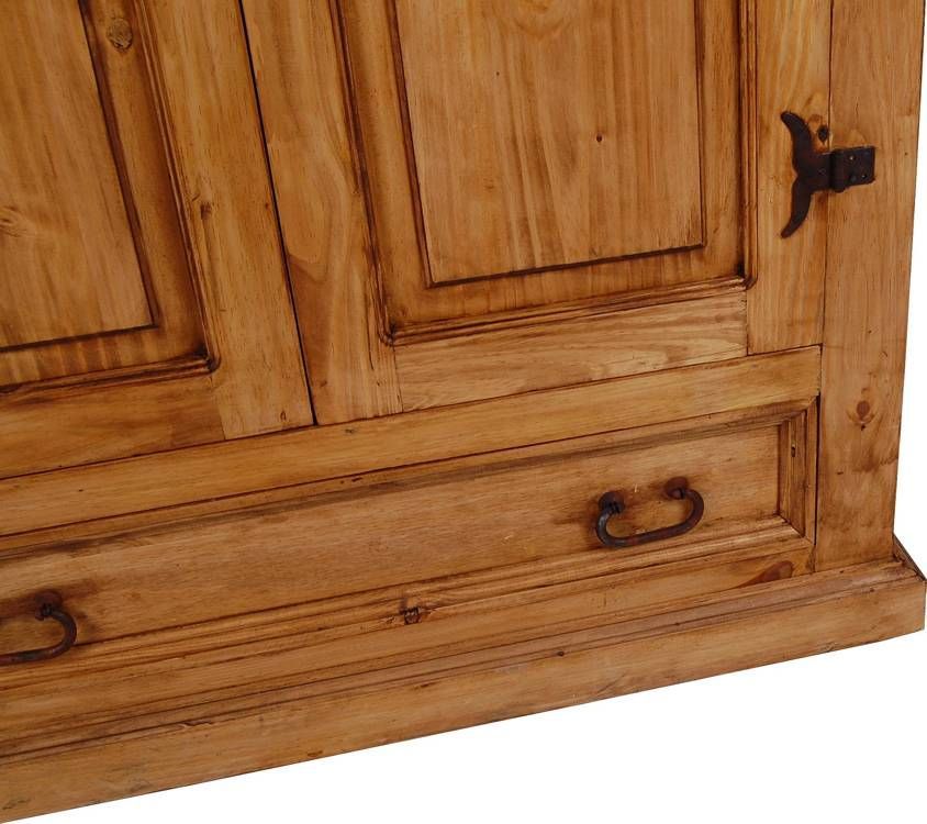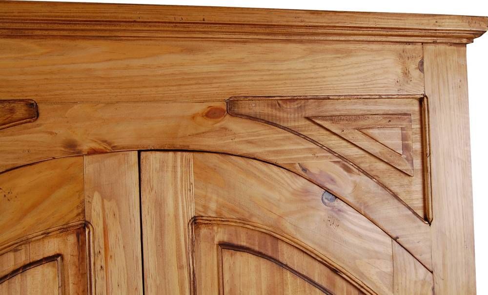Massiver Bauernschrank aus Pinienholz, antik gewachst. Dieser Schrank wirkt durch seine Frontgestaltung besonders eindrucksvoll. Die beiden Flügeltüren wurden als Kassettentüren in Rundbogenoptik gearbeitet. Auch für die Seiten des Schrankes wurde dieses Design verwendet. Das sonst sehr geradlinige Gestaltung wird durch die geschwungenen Beschläge und Türgriffe aus Schmiedeeisen kontrastiert. Im Inneren bietet der Schrank auf vier Etagen ausreichende Platz zum Verstauen. Die drei einze