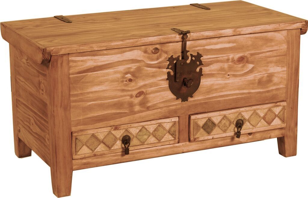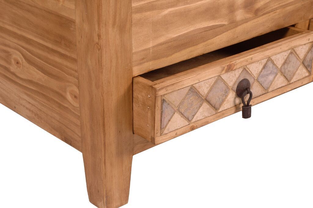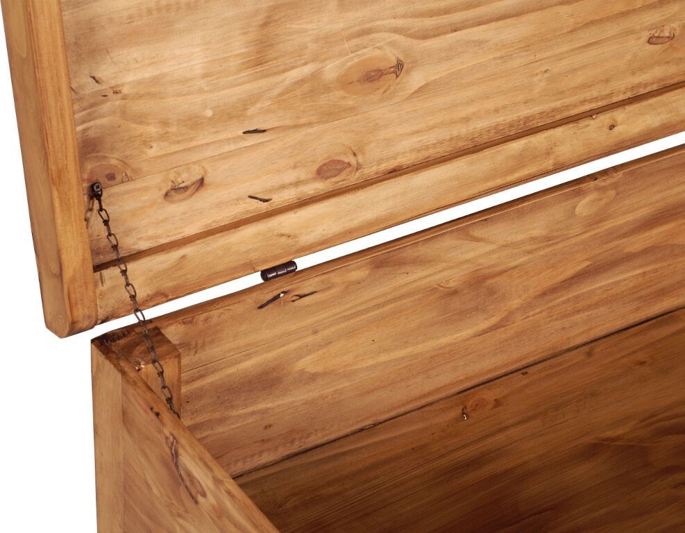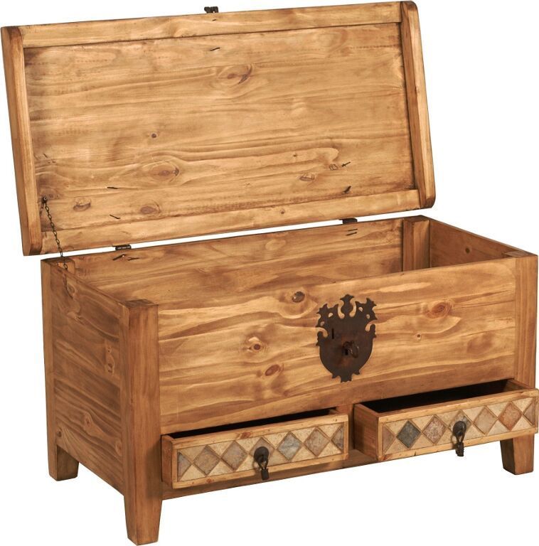 Dekorative Truhe im Landhausstil mit Marmoreinlagen. Schöne Truhe im rustikalen Landhausstil aus massivem Pinienholz. Um den charakteristischen Honigton zu erzielen, wurde die Truhe mit einem Antikwachs behandelt, welches das Holz schützt und die natürliche Maserung zusätzlich betont. Das Design der Truhe wurde sehr schlicht gehalten. Der flache Deckel kann daher auch als Sitzfläche genutzt werden, somit lässt sich die Truhe auch wunderbar in den Flurbereich stellen aber auch im Wohnzimme