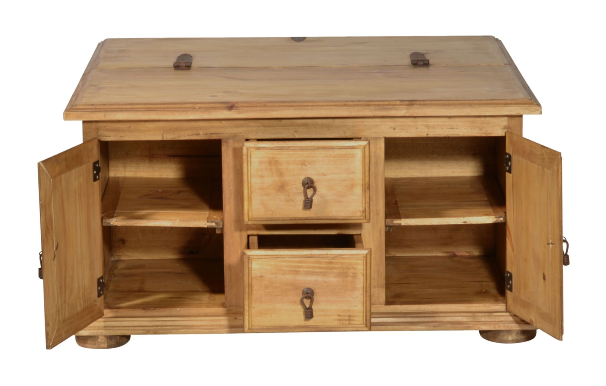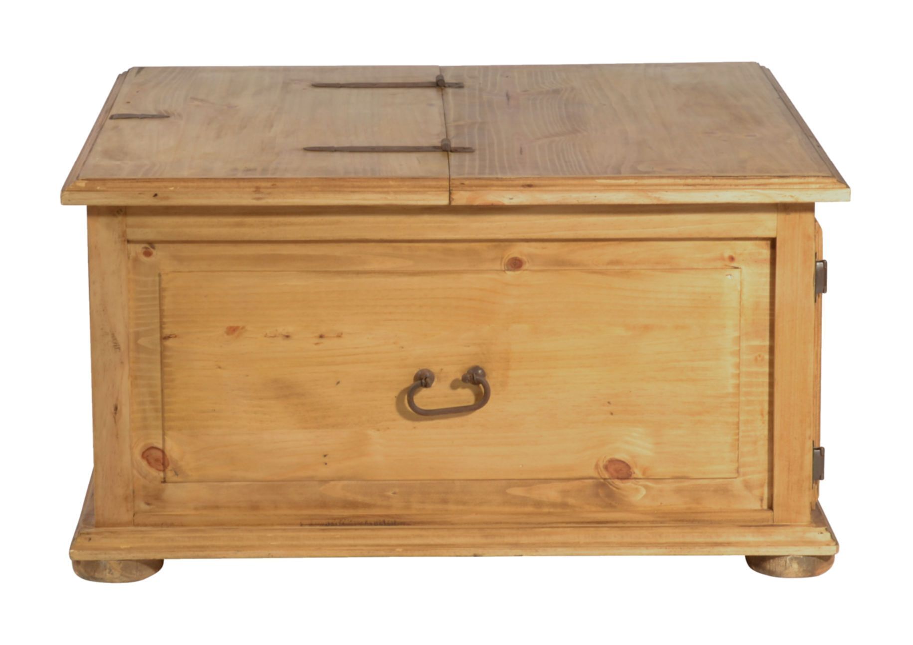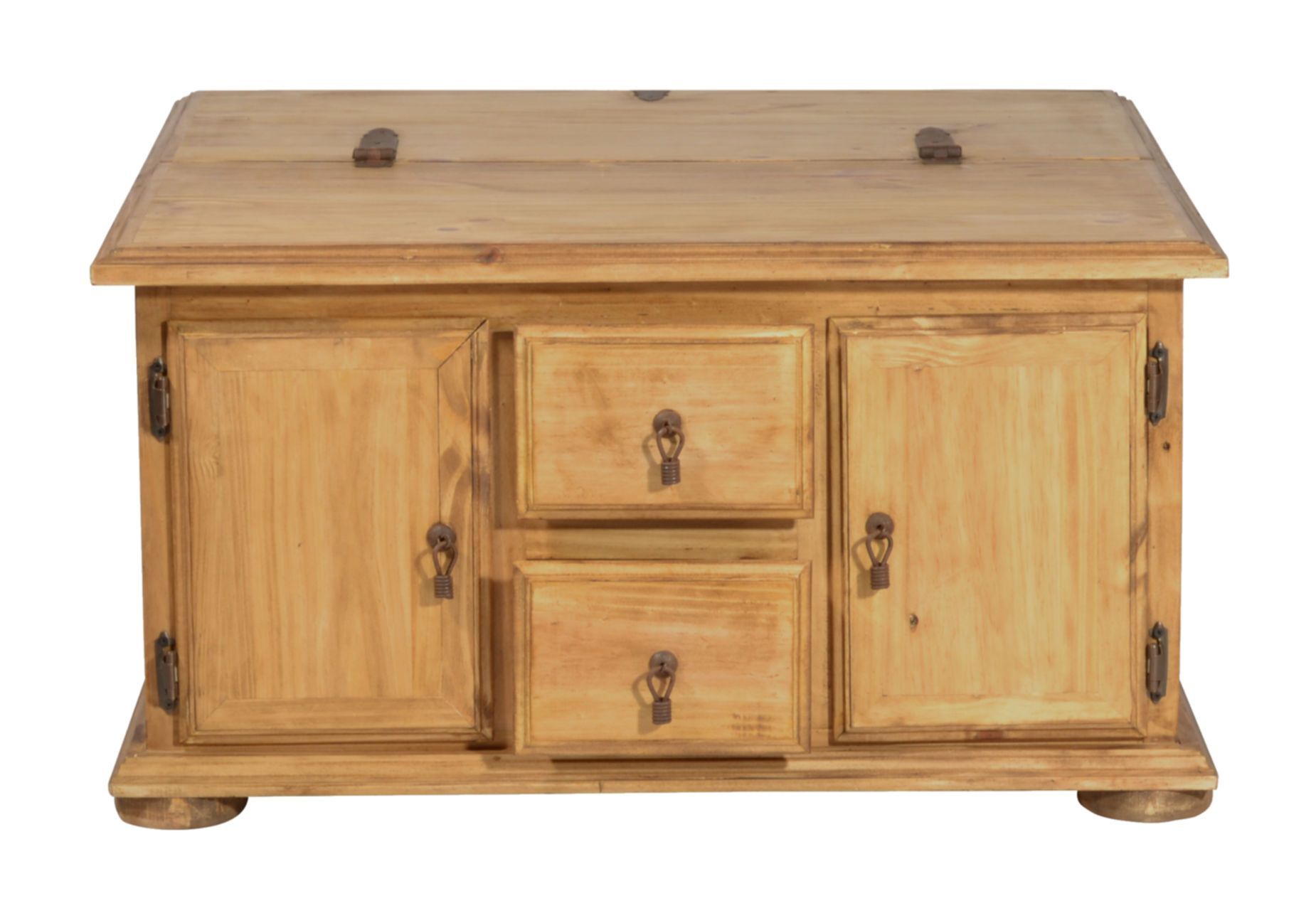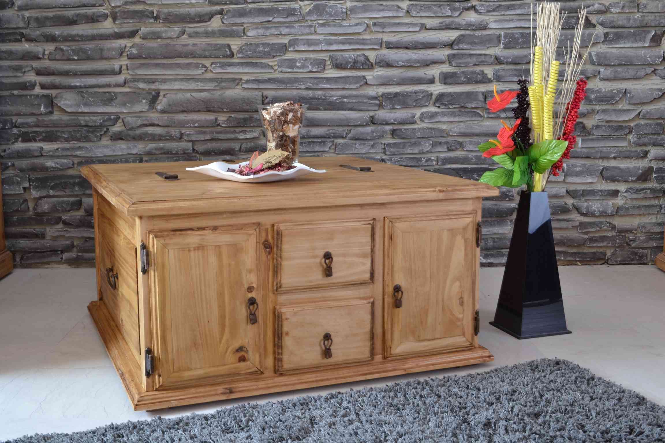 Dekorativer und praktischer Landhaus Truhentisch aus massivem Pinienholz, antik gewachst. Mit diesem Truhentisch holen Sie sich zusätzlichen Stauraum ins Wohnzimmer. Hinter zwei kleineren Schubladen und zwei Türen lassen sich all die Dinge verstauen, die man gerne schnell griffbereit haben möchte. Größere Dinge wie beispielsweise Decken oder Kissen, lassen sich in der zweiten Hälfte der Truhe verstauen, die sich durch den Deckel öffnen lässt. Vorteil hierbei: sie müssen dafür nicht den ganze