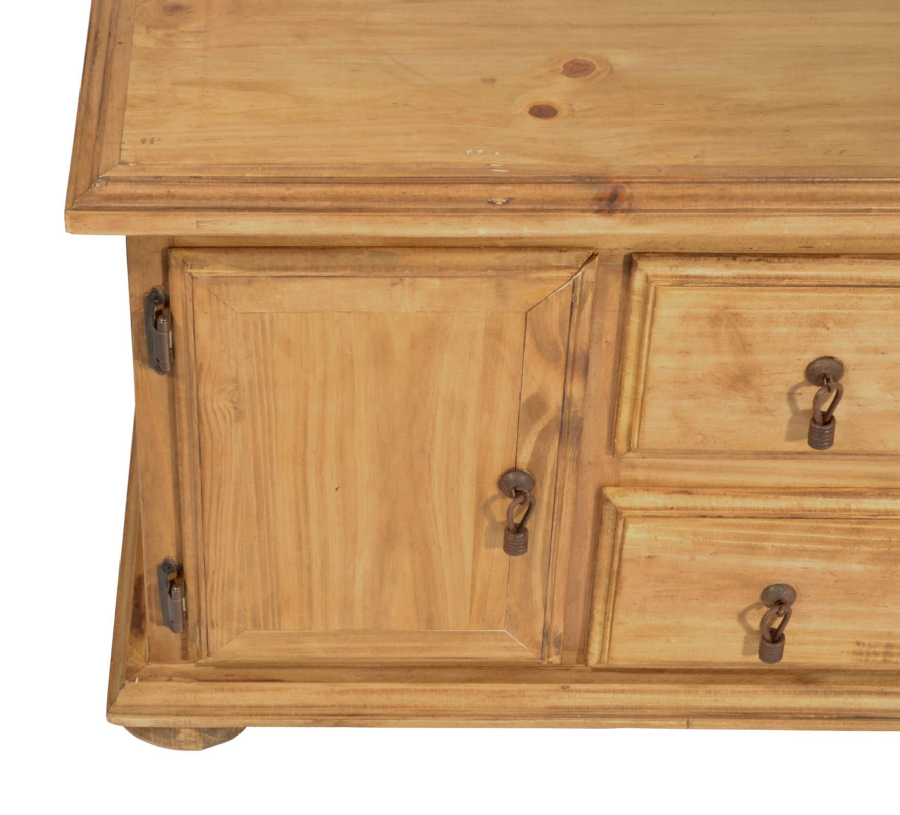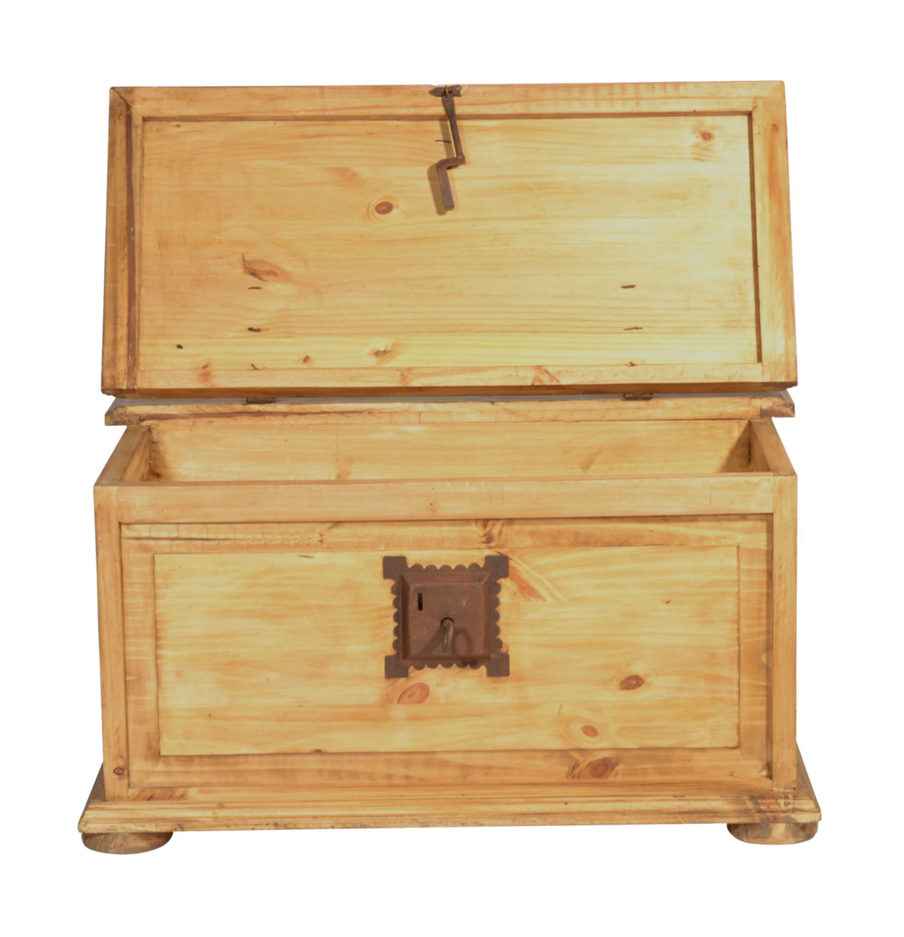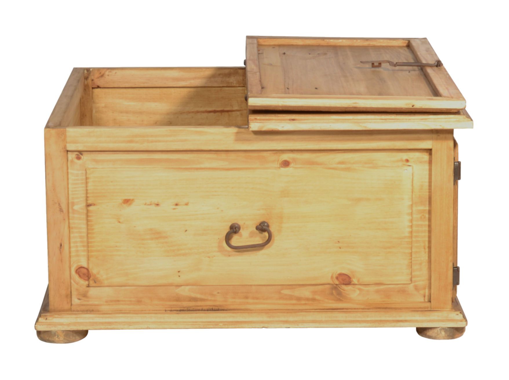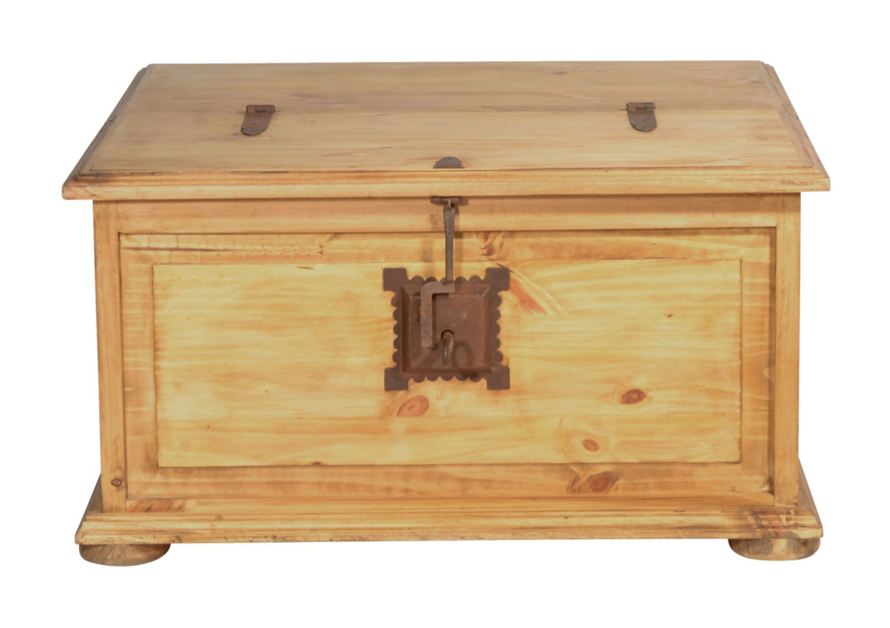 Dekorativer und praktischer Landhaus Truhentisch aus massivem Pinienholz, antik gewachst. Mit diesem Truhentisch holen Sie sich zusätzlichen Stauraum ins Wohnzimmer. Hinter zwei kleineren Schubladen und zwei Türen lassen sich all die Dinge verstauen, die man gerne schnell griffbereit haben möchte. Größere Dinge wie beispielsweise Decken oder Kissen, lassen sich in der zweiten Hälfte der Truhe verstauen, die sich durch den Deckel öffnen lässt. Vorteil hierbei: sie müssen dafür nicht den ganze