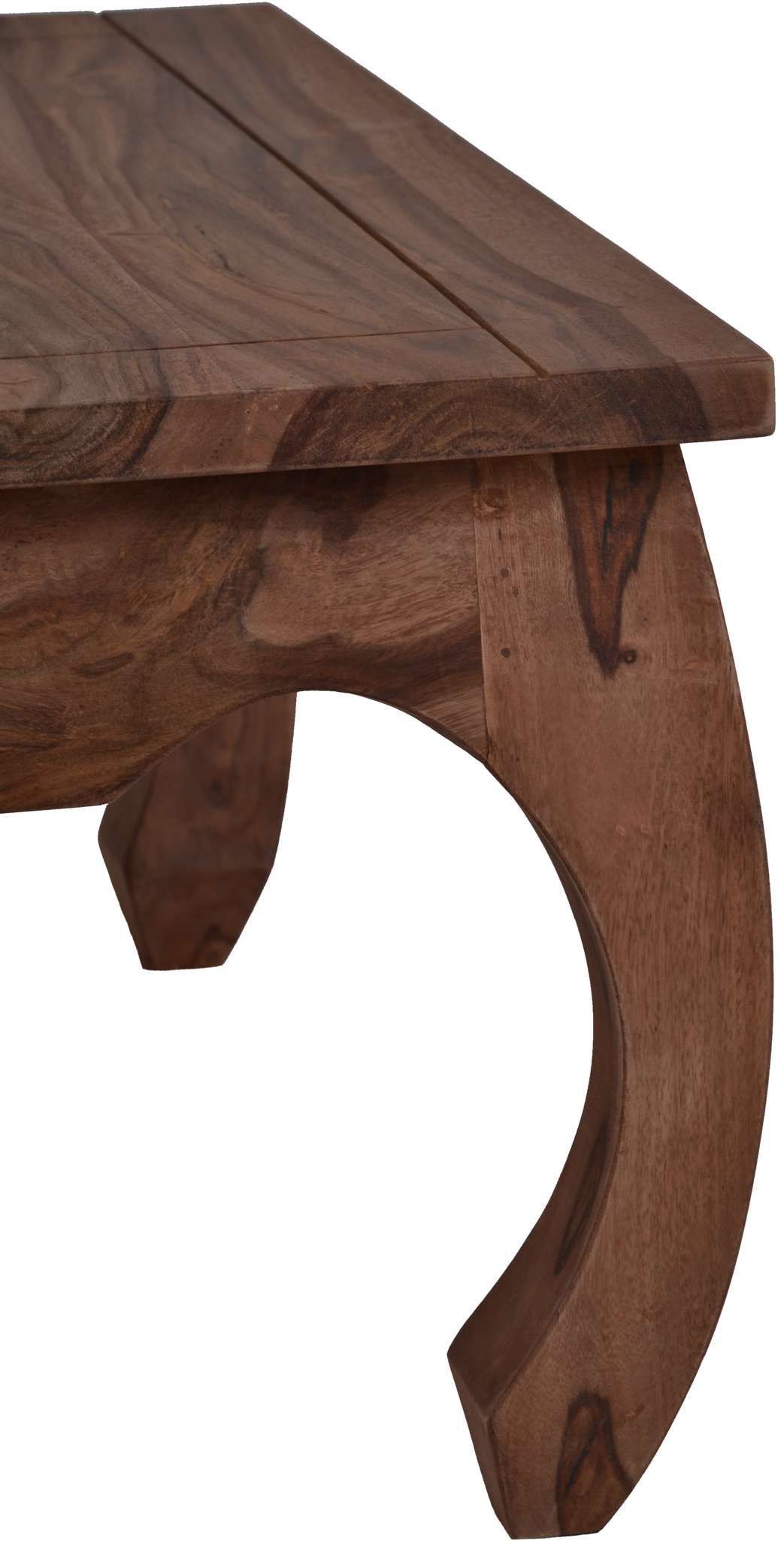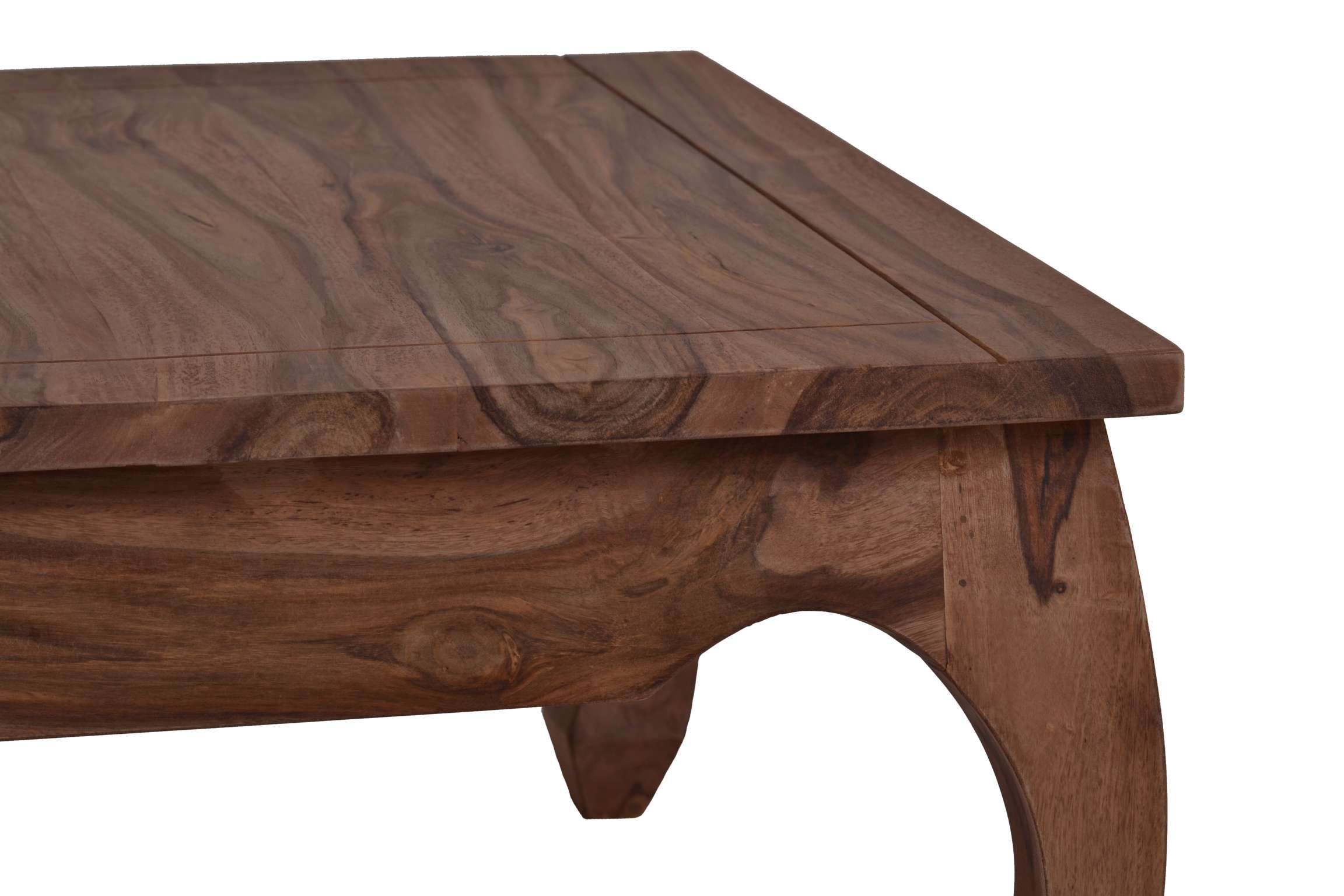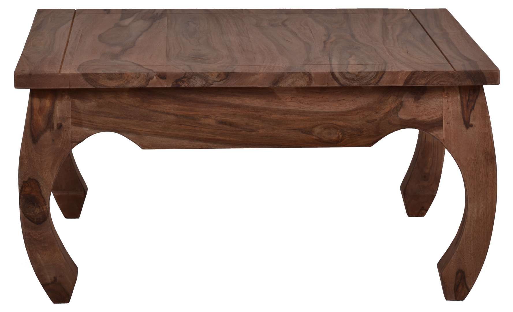 Opiumtisch, Couchtisch aus massivem Teak, gebeizt. Dieser Couchtisch im asiatischen Stil stammt ursprünglich aus dem alten China und verbreitete sich über Indien und die Kolonialzeit bis nach Europa. Sein berühmtes Merkmal sind die vier bauchig geschwungenen Beine, die dem massiven Holztisch Leichtigkeit verleihen. Besonders schön wird die sonst sehr schlichte Form des Opiumtisches von der lebhaften Maserung des Teakholzes kontrastiert. Der dunkelbraune Grundton des Holzes, lässt den Tisc