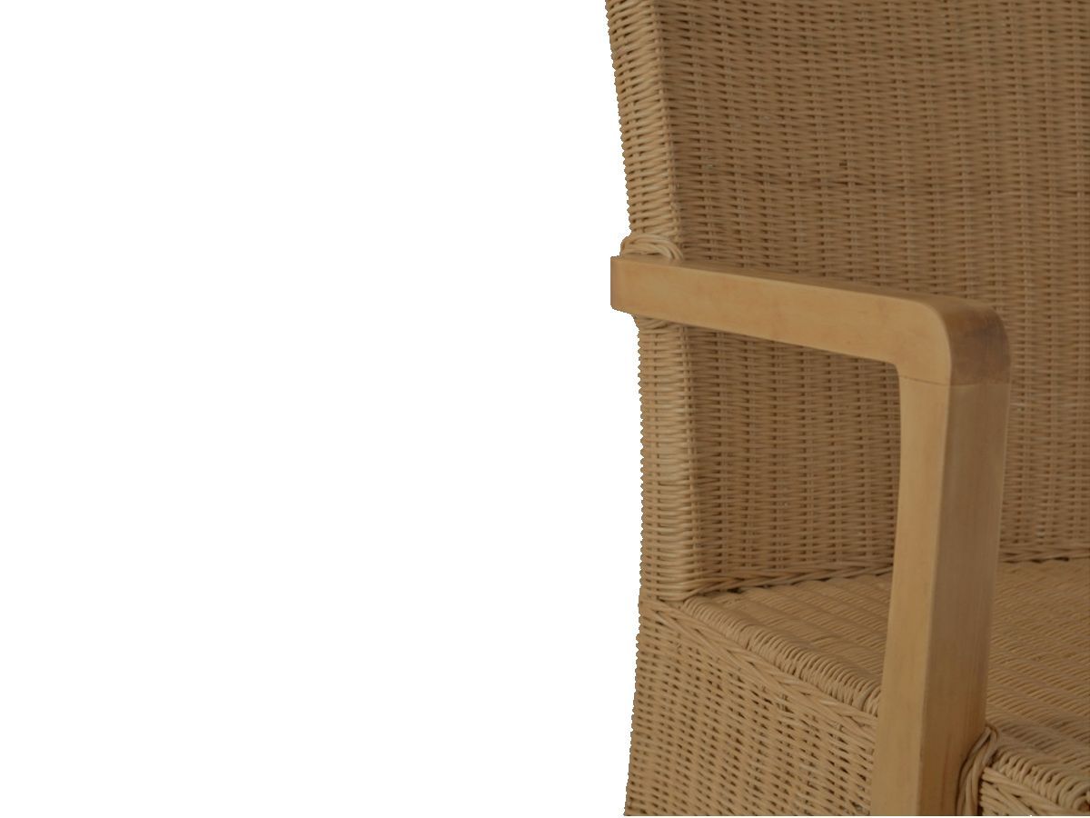 Schöner und stabiler Armlehnstuhl aus Rattan. Dieser Esszimmerstuhl besteht aus einem robusten Hartholzgestell, auf das ein feines Korbgeflecht aufgeflochten wurde. Eine leicht ergonomisch geformte Rückenlehne unterstützt das bequeme Sitzen. Beine, Armlehnen sowie die Holzkante der Lehne bestehen aus massivem hellen Mahagoni, die wie auch das Rattangeflecht naturfarben belassen wurden und lediglich transparent lackiert sind. Die praktische Leiste der Rückenlehne dient sowohl als Schutz als a