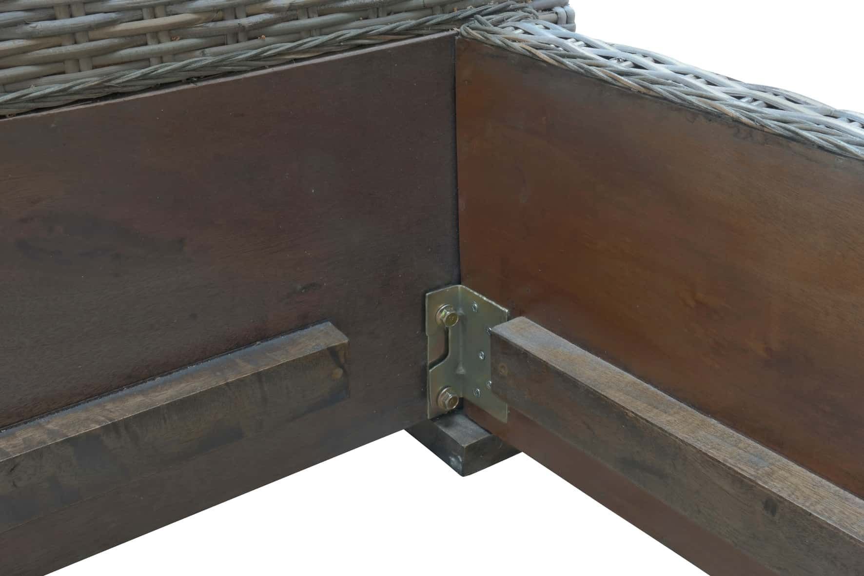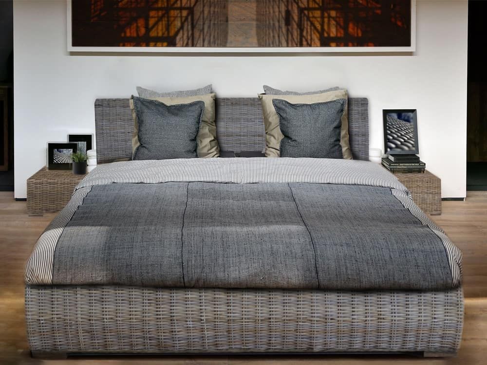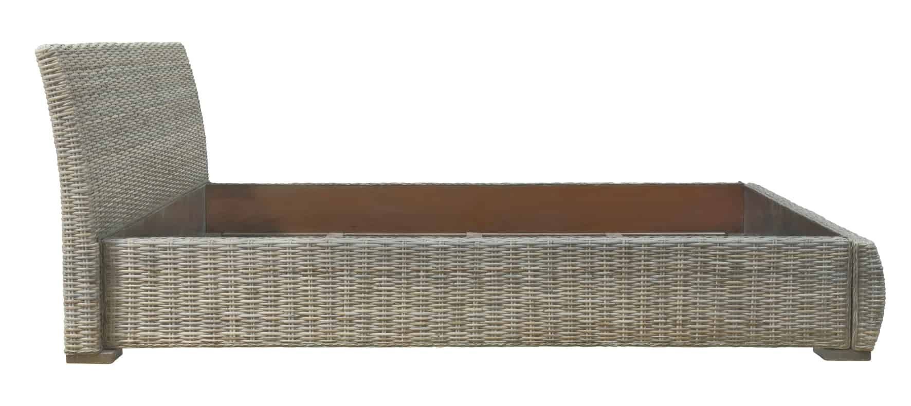 Das stabile Bett „Tanaya“ aus Kubu Rattan in leichtem Naturgrau erhalten Sie bei uns in vier unterschiedlichen Breiten. Das hochwertige Rattangeflecht wurde auf ein stabiles Mahagonigestell aufgearbeitet. Der Korpus steht bodennah auf vier quadratischen Mahagoni-Füßen. Das erhöhte Kopfteil hat eine Höhe von 88 cm. Durch eine mittlere Holzverstrebung wird eine stabile Auflage eines passenden Lattenrosts sowie der Matratze gewährleistet. Das Rattanbett ist passend für alle handelsüblichen Latten