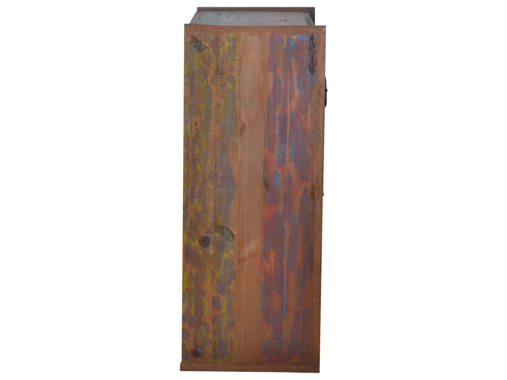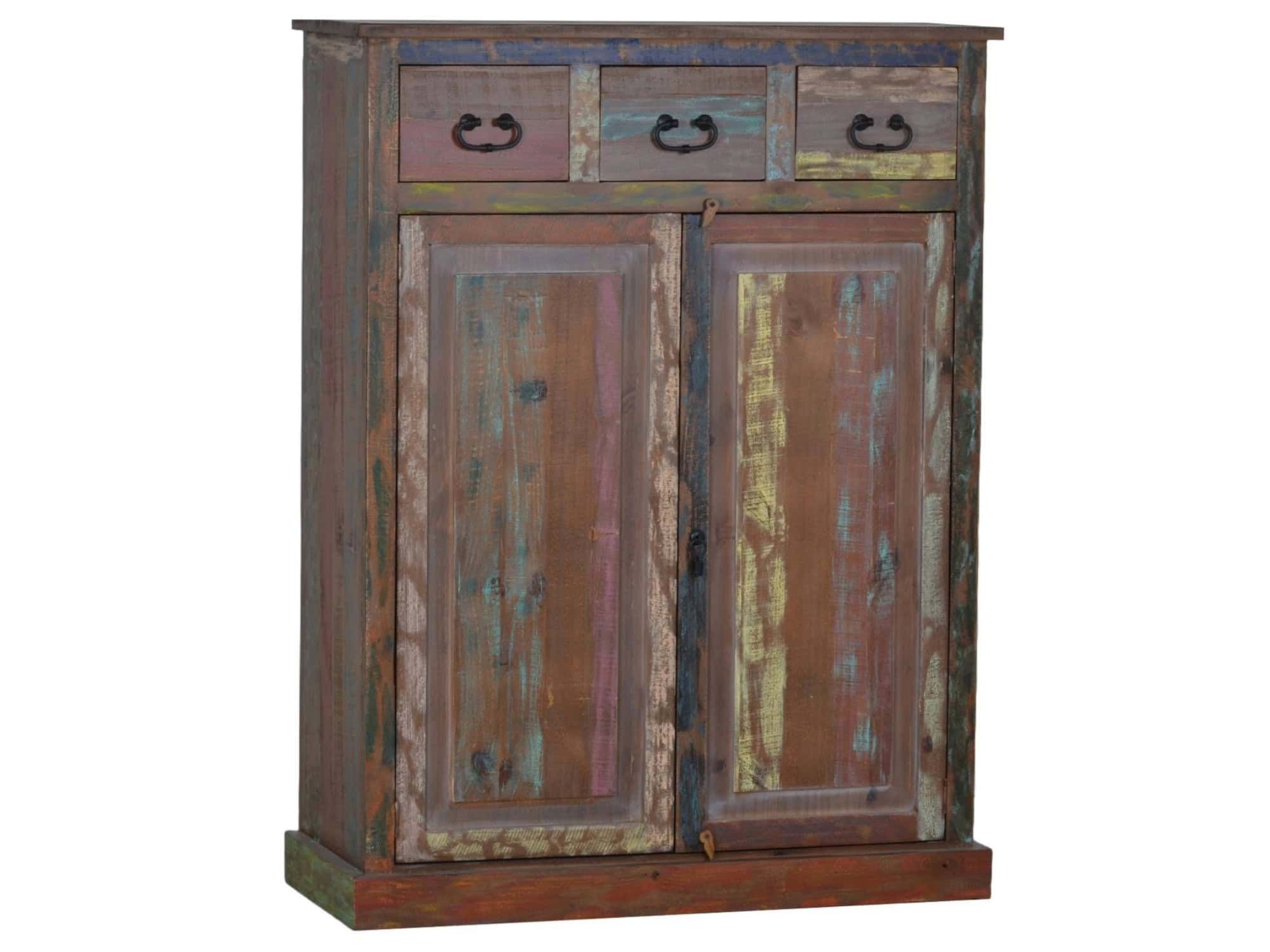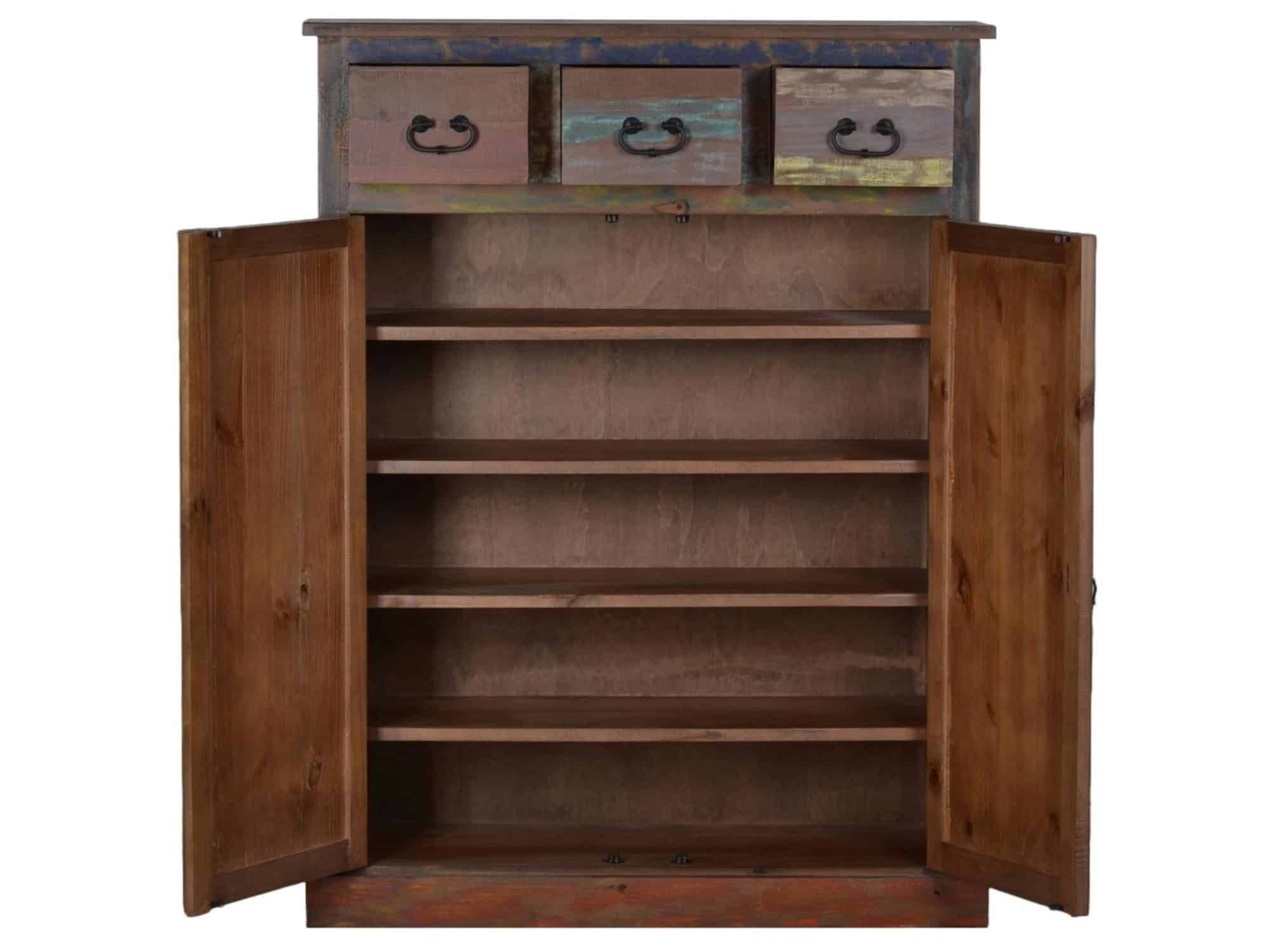 Schuhschrank, Altholz mit Gebrauchsspuren, lackiert, bunt, 3 Schubladen, 2 Türen, 4 feste Böden hinter den Türen.
